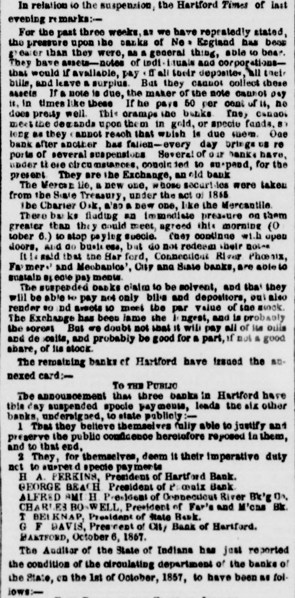 In relation 10 the suspension, the Hartford Times of last evening remarks:For the past three weeks, as we have repeatedly stated, the pressure upon be banks of No , England has bear gearer than they were, as a general thing, able to bear. They have assets-notes of indi-iduals and corporationsthat would if available, pay ff ali toeir deposite. all their bills, and leave a surplus. But they cannot collect these assets If a note is due, the maker of the note cannot osy it, in times like these If he pays 50 per cent of 16, no does pretty well. This cramps the banks fne, cannot mestthe degands upon them in gold, or specie funds, BY long as they annot reach that which is due inem. Oae bank after another has falien-every day brings us re ports of several suspensions Several of our banks have, under ti 040 circumstances, concin to supend, for the present They are the Exchange, an old bank The Mercan lie, a new one, whose securities were taken from the Siate Treasury, under the act 0) 1865 lbe Charier O.K, a'so a new one, like the Mercantile. These bar ks fluding an immediate pressure on them greater than they could meet, agreed this morning (0 tober 6.) to stop paying specie. they continue wi.h open doors, and do busis ess, but do not redeam heir notes It 1. said that the Har ford, Connecticut River Phoenix, Farmer' and Mechanics', City and State banks, are able to sustain specie pay ments. The suspended banks claim to be solvent, and that they will be able to pay not only bills and depositors, out also render so nd aweets to meet the par value of the sook. The Exchange has been lame the 1. ngest, and is probably the sorest But we doubt not that 18 will pay all of its only and de osits, and probably be good for a part, if not a good share, of its stock. The remaining banks of Hartford have issued the annexed card:To THE PUBLIC Tbe announcement that three banks in Hartford have this day suspended specie pay ments, leads the six other banks, undersigned, to state publicly:1 That they believe themselves (ully able to justify and preserve the public comfidence heretofore reposed in them, and to that end, 2 They, for themselves, deem it their imperative duty not to suppend pecte payments H A. PERKINS, President of Hartford Bank. GEORGE BEACH President of Proenix Bank ALFRED AMI H. President of Connecticut River Bk'g Dr. CHARLES BOSWELL, President of Far's and M'cns Bk. T BEIKNAP, President of State Bank. G F DAVIS, President of City Bank of Hartford. BARTFORD, October 6, 1867. The Auditor of the State of Indiana has just reported the condition of the circulating department of the banks of the State, on the 1st of October, 1857, to have been me follows:-