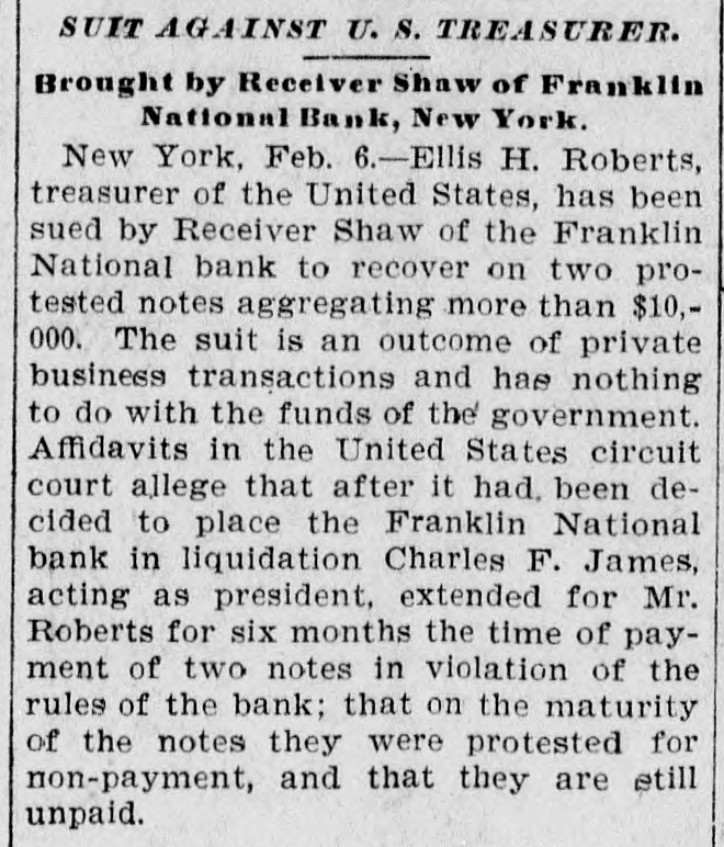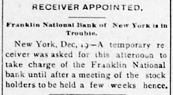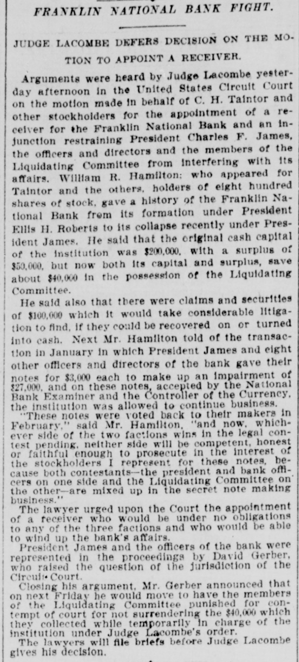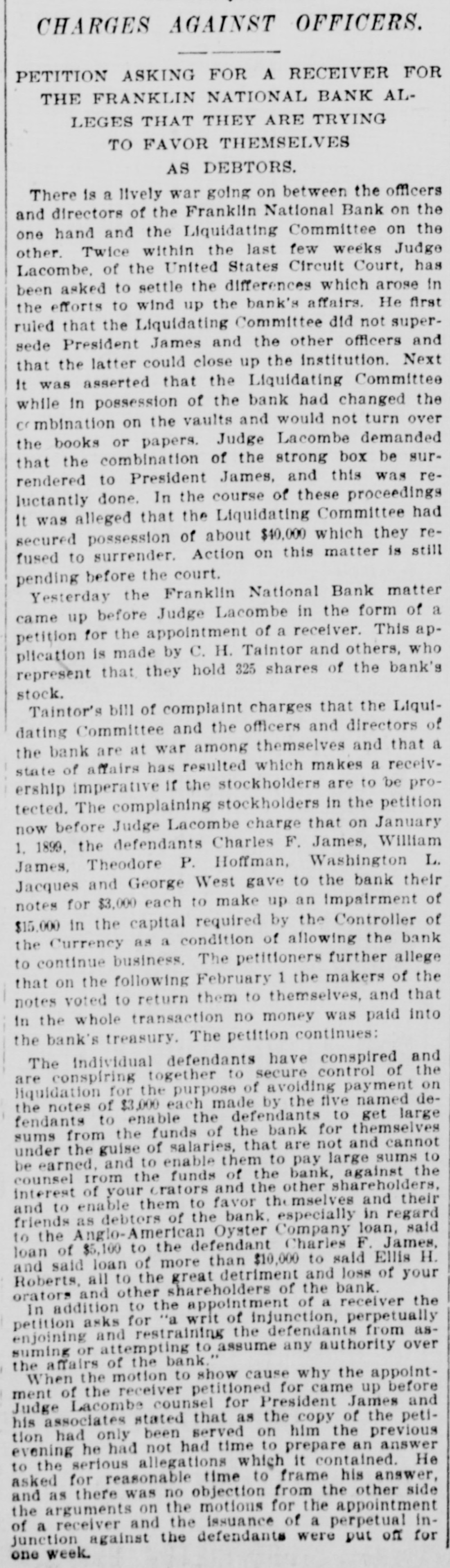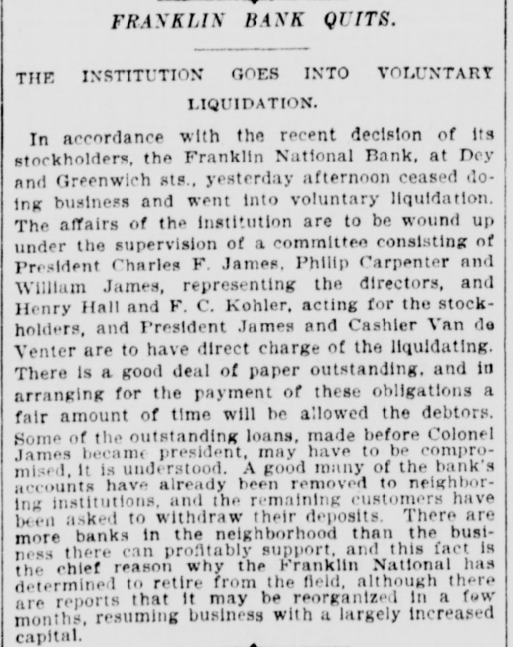 FRANKLIN BANK QUITS. THE INSTITUTION GOES INTO VOLUNTARY LIQUIDATION. In accordance with the recent decision of its stockholders, the Franklin National Bank, at Dey and Greenwich sts., yesterday afternoon ceased doing business and went into voluntary liquidation. The affairs of the institution are to be wound up under the supervision of a committee consisting of President Charles F. James, Philip Carpenter and William James, representing the directors, and Henry Hall and F. C. Kohler, acting for the stockholders, and President James and Cashier Van de Venter are to have direct charge of the liquidating. There is a good deal of paper outstanding, and in arranging for the payment of these obligations a fair amount of time will be allowed the debtors. Some of the outstanding loans, made before Colonel James became president, may have to be compromised, It is understood. A good many of the bank's accounts have already been removed to neighboring institutions, and the remaining customers have been asked to withdraw their deposits. There are more banks in the neighborhood than the business there can profitably support, and this fact is the chief reason why the Franklin National has determined to retire from the field, although there are reports that It may be reorganized In a few months, resuming business with a largely increased capital.