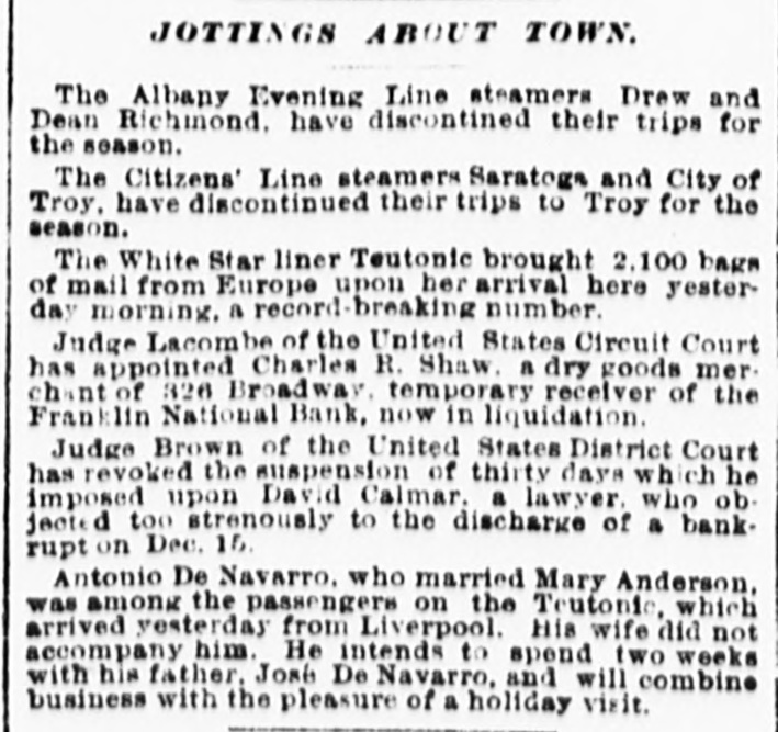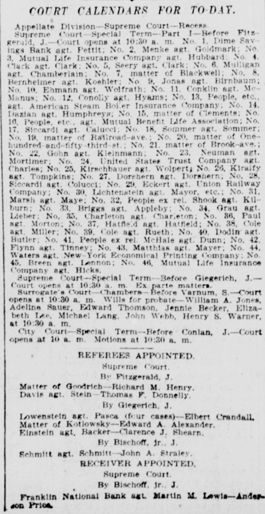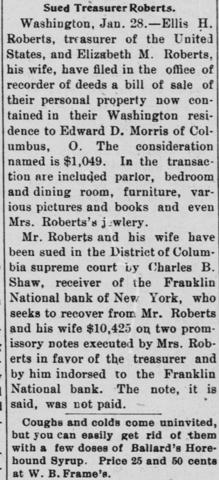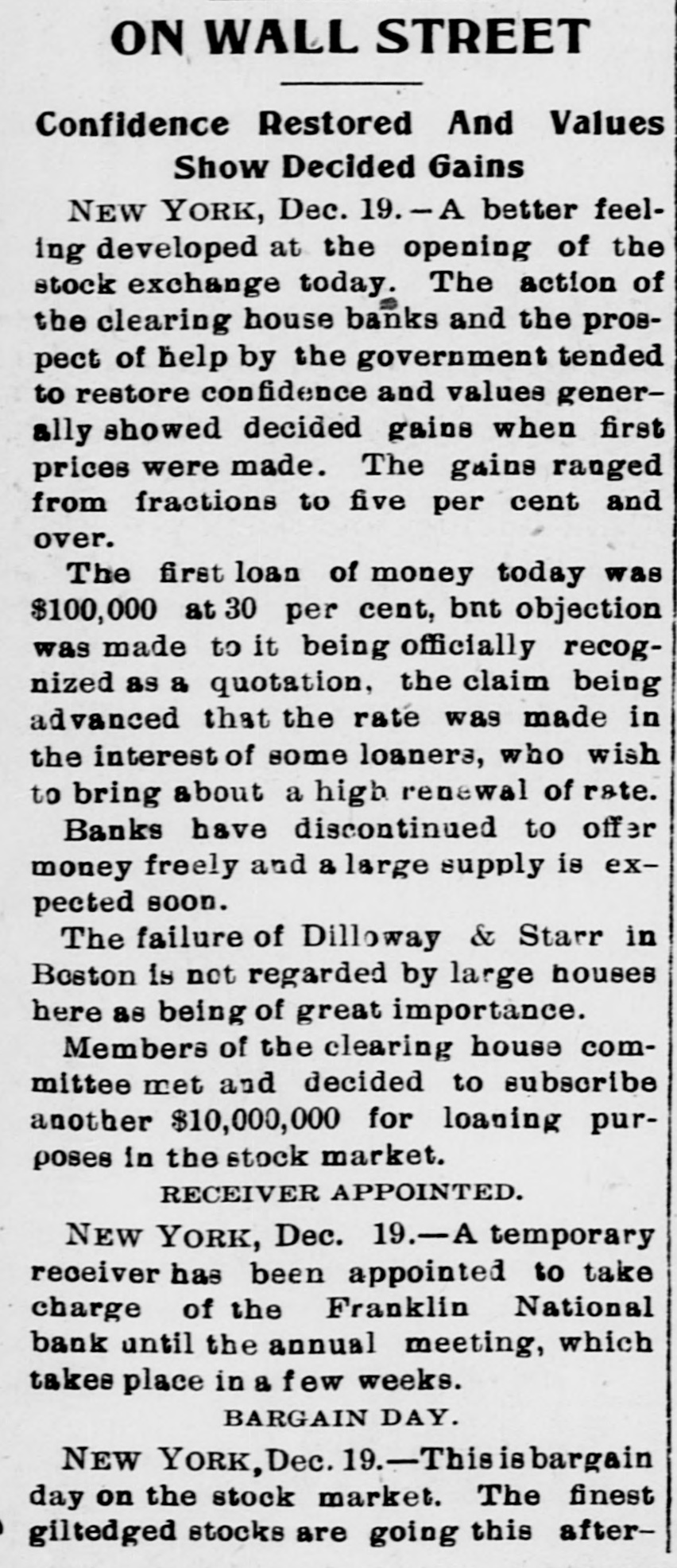 FRANKLIN BANK QUITS. THE INSTITUTION GOES INTO VOLUNTARY LIQUIDATION. In accordance with the recent decision of its stockholders, the Franklin National Bank, at Dey and Greenwich sts., yesterday afternoon ceased doing business and went into voluntary liquidation. The affairs of the institution are to be wound up under the supervision of a committee consisting of President Charles F. James, Philip Carpenter and William James, representing the directors, and Henry Hall and F. C. Kohler, acting for the stockholders, and President James and Cashier Van de Venter are to have direct charge of the liquidating. There is a good deal of paper outstanding, and in arranging for the payment of these obligations a fair amount of time will be allowed the debtors. Some of the outstanding loans, made before Colonel James became president, may have to be compromised, It is understood. A good many of the bank's accounts have already been removed to neighboring institutions, and the remaining customers have been asked to withdraw their deposits. There are more banks in the neighborhood than the business there can profitably support, and this fact is the chief reason why the Franklin National has determined to retire from the field, although there are reports that It may be reorganized In a few months, resuming business with a largely increased capital.
