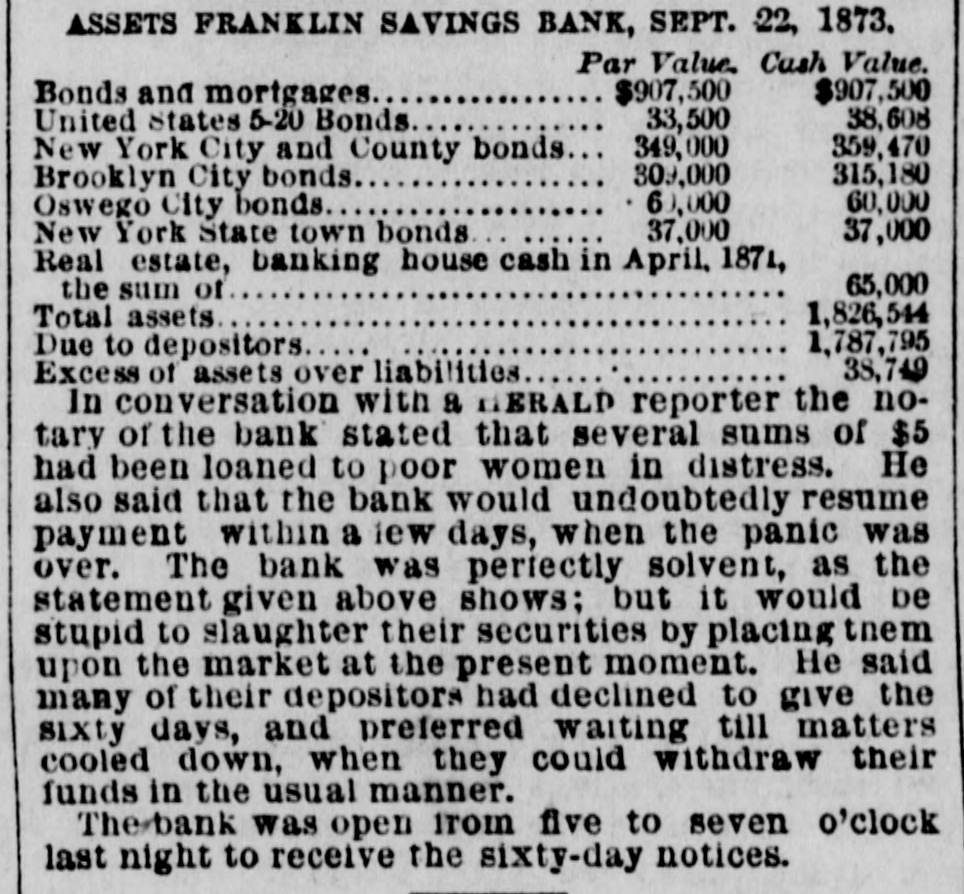 ASSETS FRANKLIN SAVINGS BANK, SEPT. 22, 1873. Par Value. Cash Value. $907,500 $907,500 Bonds and mortgages 38,608 United States 5-20 Bonds 33,500 359,470 349,000 New York City and County bonds 309,000 315,180 Brooklyn City bonds 60,000 60,000 Oswego City bonds 37,000 New York State town bonds 37,000 Real estate, banking house cash in April, 1871, 65,000 the sum of 1,826,544 Total assets 1,787,795 Due to depositors 38,749 Excess of assets over liabilities In conversation with a 11 ERALD reporter the notary of the bank stated that several sums of $5 had been loaned to poor women in distress. He also said that the bank would undoubtedly resume payment within a lew days, when the panic was over. The bank was periectly solvent, as the statement given above shows; but it would be stupid to slaughter their securities by placing tnem upon the market at the present moment. He said many of their depositors had declined to give the sixty days, and preferred waiting till matters cooled down, when they could withdraw their funds in the usual manner. The-bank was open irom five to seven o'clock last night to receive the sixty-day notices.