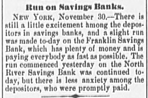 Run on Savings Banks. NEW YORK, November 30.--There is still n little excitement hmong the depositors in savings banks, and n slight run was made to-day on the Franklin Savings Bank, which has plenty of money and is paying everybody as fast as possible. The run commenced yesterday on the North River Savings Bank was continued today, but there is less anxiety among the depositors, who were promptly paid.