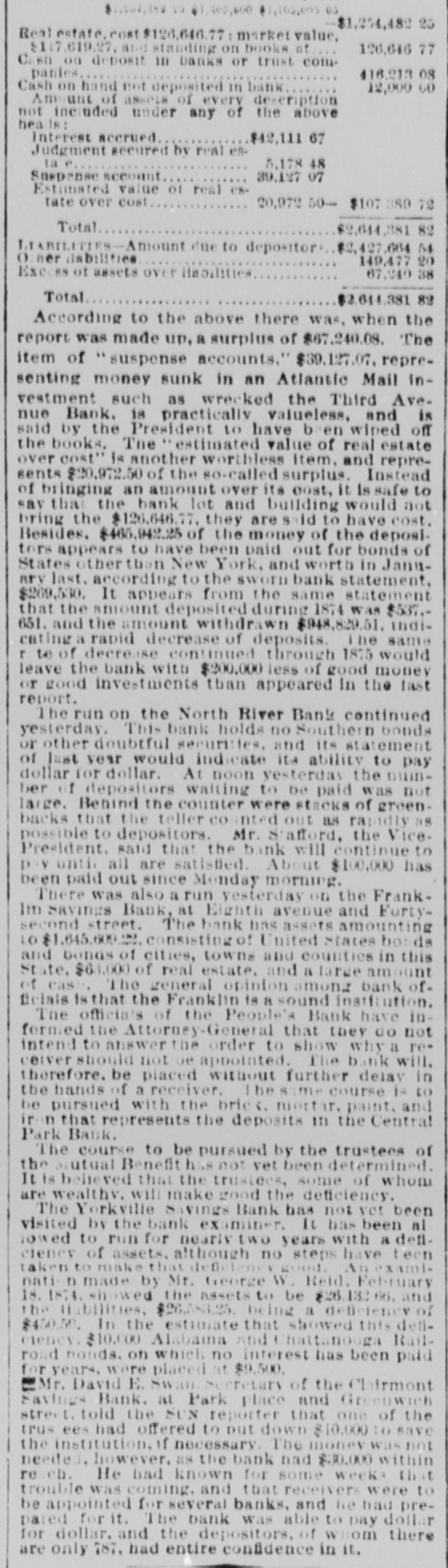 50 500'001'1* RA ESPIRATED -$1,254,482 Real estate. cost $126,646.77 market value, $117,619.27. and standing on books at 919'981 Cash 00 deposit ID banks or trust comsapped $15.91 Cash on hand not deposited in bank 000'31 uonditions AJOAD JO 810880 JO munday not included under any of the above :speaq Interest accrued 29 111'21$ Judgment secured by real esR1 81 821'9 Suspense account 20 48T'68 Estimated value or real estate over cost 088 201$ -09 846'08 Total $2,644,381 L1 Amount due to depositor $2,427,664 o ner dabilities LEVOIL Excess of assets over liabilities OFS'49 Total 1881192$ According to the above there was. when report was made up, a surplus of $67,240.08. item of "suspense accounts." $39,127.07. repre senting money sunk in an Atlantic Mail vestment such as wrecked the Third nue Bank. is practically valueless, and said by the President to have been wined of the books. The "estimated value of real estate over cost" is another worthless item. and represents $20,972.50 of the so-called surplus. Instead of bringing an amount over its cost, it Is safe say that the bank lot and building would bring the $126,646.77. they are said to have cost Besides. $465,942.25 of the money of the deposi tors appears to have been paid out for bonds States other than New York, and worth in Janu ary last, according to the sworn bank statement $269,530. It appears from the same statement that the amount deposited during 1874 was $537, 651. and the amount withdrawn $948,829.51. cating a rapid decrease of deposits. The same r te of decrease continued through 1875 would leave the bank with $200,000 less of good money or good investments than appeared in the report. The run on the North River Bank continued yesterday. This bank holds no Southern bonds or other doubtful securities. and its statement of last year would indicate its ability to dollar for dollar. At noon yesterday the ber of depositors waiting to be paid was large. Behind the counter were stacks of green backs that the teller counted out as rapidly possible to depositors. Mr. Stafford, the Vice President. said that the bank will continue pay until all are satisfied. About $100,000 been paid out since Monday morning. There was also a run yesterday on the Frank Im Savings Bank, at Eighth avenue and Forty second street. The bank has assets amounting 10 $1,645,609.22. consisting of United States bond and bonds of cities, towns and counties in State, $63,000 of real estate. and a large amount Jo rueq zuome trojuido OUT, USED 10 ficials isthat the Franklin is A sound institution The officials of the People's Bank have