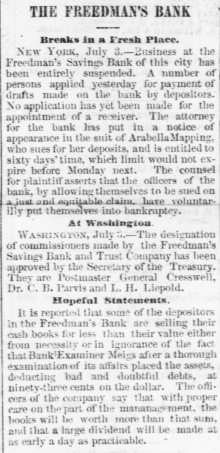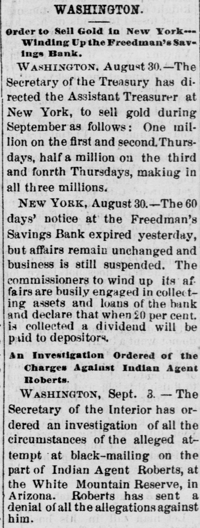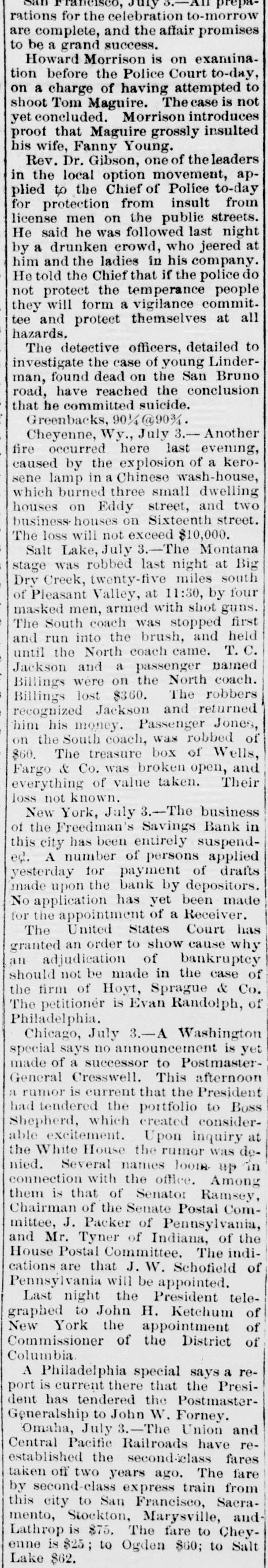Telegraphic-Foreian Affairs. BRUSSELS, August final sitting of the International Conference was held yesterday. All the members signed the protocol, except the delegates from Great Britain and Turkey, who postponed attaching their signatures. MADRID, August 29.-Over 200 Carlists were killed and many wounded in the attacks on Puigoerda. The Republican garrisou have nineteen barrels of dynamite, with which they will blow пр the place if the Carlists succeed in carrying it. A force of the Carlists entered Callaborra, twentyfour miles South-west of Logovno, on the 25th instant, and sacked houses, levied contributions of $17,000 upon the clergy, shot four volunteers, freed the convicts and burned the railway. LONDON, August 31.-Quarantine regulations have been put in force at Queenstown, which will cause great hindrance to commerce. All persons are prohibited from leaving or embarking on vessels from ports in America, the West Indies, the Mediterranean and the Black Sea, until it is ascertained that such vessels have a clean bill of health. The Great Eastern, up to yesterday (Sunday) noon, had paid out 647 nautical miles of the Anglo-American Company's new cable, and all was going on well. The ship Sierra Nevada, bound for San Francisco, was burned at sea. Crew saved. PARIS, August 30. - The sale of the London Hour in France is prohibited, in consequence of the publication of letters written by nine. The French authorities have disarmed a Carlist battalion which was operating against Puycerda for entering French territory. The Carlists have since been motecircumspect. Telegraphic-American Matters. CANTON, PA., August 29.-Albert Brown, a negro, last night outraged a girl aged seven years, named Greenleaf, out her throat from ear to ear, and then jumped in front of B passing train, breaking both his legs. He is now in custody here. MEMPHIS, August 29.-A large indignation meeting was held at the exposition beilding last night. Speeches were made by -Governor Harris, of Louden. C. Haynes Duncan, x-President Jefferson Davis, Chancellor Morgan, B. M. Estes, General Forrest and others, all denouncing the slaughter of the negro prisoners at Trentou. The committee reported resolutions condemning the outrages, and calling for the punishment of the members, and a copy of the resolutions was sent to Governor Brown, and asking that the powe of the State be exercised in dis-covering and bringing to justice the assassine. The meeting was enthusiastic and composed of the leading citizene. WASHINGTON, August 29.-The recepts from internal revenue to-day were $277,756.45; the amount of national bank note currency received at the treasury to-day, for redemption, foots up -$351,156; the total to date aggregates $7,909,252.15. NEW YORK, August 30. Justice Bradley, of the Supreme Court of the United States, issued to-day an order removing the present receivers, and authorizing the trustees of the first mortgage bonds of the Alabama and Chattanooga Railroad to take posses. sion immediately; also, to sell the road for their benefit, subject to the court certificates and charges. The sixty days notice at the Freedman's Savings Bank expired yesterday, but the affairs remain unchanged, and the business is still suspended. The commissioners to wind up its affairs are busily engaged collecting the assets and loans of the bank. They declare that when twenty per cent. is collected a dividend will be paid to the depositors. A special from the Wichita Agency says the fighting with the Kiowas, which began three weeks ago, was continued in a desultory manner until the morning of the 25th, when the Indians, in bands ranging from fifty to five hundred, made a series of dashes on Gen. Davidson's outposts, and set fire to the prairie to destroy the buildings of the agency; but all their attempts were defeated, and they fled westward, carrying off their killed and wounded. The fire, which sometimes was as high as the tree tops, was subdued after great efforts by the troops, and the buildings were saved. Gen. Davidson has induced the friendly Caddoes, Wichitas, Comanches and other tribes to return to thoir reservations. Two additional companies arrived at Wichi-