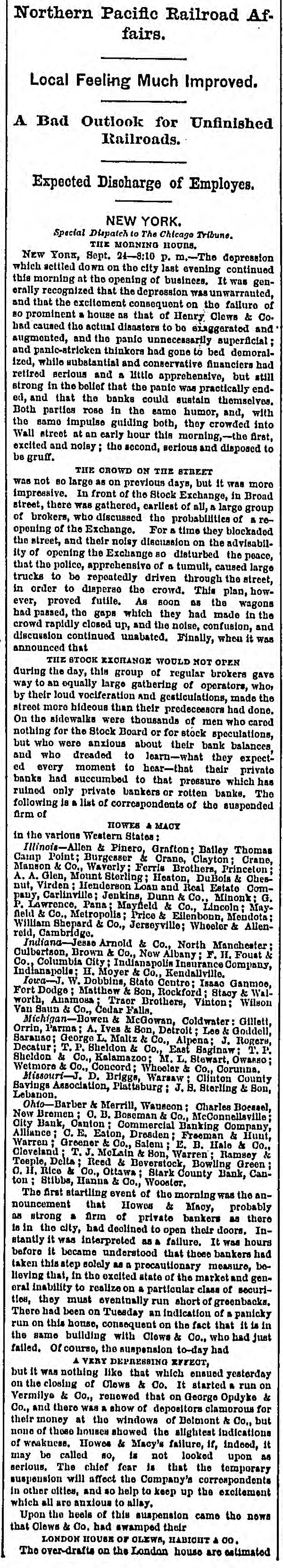 CONFIDENCE RETURNING. s MORNING OF AGITATION AND DEPRESSION FOLLOWED BY AN EVENING FULL OF HOPE AND ENCOURAGEMENT-A BETTER PROSPECT AHEADTHE EVENTS OF YESTERDAY CALCULATED TO ALLAY THE EXCITEMENT. The depression which settled down on the city on Tuesday evening, continued yesterday morning at the opening of business. It was generally recognized that the depression was warranted, and that the excitement consequent on the failure of so prominent a house as that of Henry Clews & Co. caused the actual disasters to be exaggerated and augmented the panic unnecessarily. Superficial and panic-stricken thinkers had gone to rest on Tuesday demoralized, while the substantial and conservative financiers had retired serious and a little apprehensive, but still strong in the belief that the panic was practically ended, and that the banks could sustain themselves. Both parties rose in the same `humor on Wednesday, and, with the same impulses guiding both, they crowded into Wall-st. at an early hour of the morning, the former and more numerous class excited and noisy. the latter few but influential serious and predisposed to be gruff. The crowd on the street was not so large as on previous days, but it was more impressive. In front of the Stock Exchange, in Broad-st., there was gathered, earliest of all the groups, a large number of brokers, who discussed the probabilities of the re-opening of the Exchange. For a time they blockaded the street, and their noisy discussion of the advisability of opening the Exchange so disturbed the peace that the apprehensive police caused large trucks to be repeatedly driven through the street in order to disperse the crowds. This plan, however, proved as futile as the precaution was needless. As soon as the wagons had passed the gaps which they had made in the crowd rapidly closed up and the noise and confusion of excited discussion continued unabated. Finally, when it was announced that the Stock Exchange would not open during the day this group of regular brokers gave way to an equally large gatherin of curbstone operators, who by their loud vociferation and ticulation made the street even more hideous that had their predecessors. On the sidewalks were thousands of men who cared nothing for the Stock Board for the street speculators, but who were anxious about their bank balances, and who dreaded to learn what they expected every moment to hear, that their private banks had succumbed to that pressure which has thus far involved only private bankers and one or two mismanaged, rotten banks. The first startling event of the morning was the announcement thateHowes & Macy, who have been considered as strong a firm of private bankers as there in the city, had declined to open their doors. Instantly it was misinterpreted a failure it was hours before it became understood that these bankers had taken this step solely as a precautionary measure, believing that in the excited state of the market and the general inability to realize on any class of securities, they must eventually run short of greenbacks. There bad been on Tuesday an indication of a run on this house, consequent on the fact that it was in the saine building with Clews & Co. Of course the newly-announced suspension had a very depressing effect: but it was nothing like that which ensued on the closing Clews & Co. on Tuesday. It started a run on Vermilye & Co., renewed that on George Opdyke & Co., and there was a show of depositors asking for their money at the windows of August Belmont & Co. But none of these houses showed the slightest indications of weakness. , Upon the heels of the suspension of Howes & Macy came the news that Clews & Co. had swamped their London house of Clews, Habicht & Co. Their overdrafts on their London house were estimated at $1,200,000, or about the amount which they are said to have paid out previous to their suspension. The information, yesterday, leads to the supposition that Henry Clews & Co.'s suspension is permanent, certainly as complete as that of Jay Cooke & Co. Howes & Macy are likely to resume shortly, when matters are quieted. These two events were really the only disastrous ones of yesterday, and yet actions by stock brokers and by bank presidents were misconstrued by the general public, and helped to increase for the time being the general depression. In the first place, a number of owners of various stocks which could not be bypothecated were forced to place them in the hands of auctioneers at the Real Estate Exchange, and they were sold to the highest bidder. a proceeding unknown heretofore in New-York finances. was looked upon at first as an indication of the worthlessness of the securities, but it was soon found that the stocks brought their current value on the street. The buyers were fortunate men, with plenty of greenbacks to invest, who were loading up" with stocks at the present low rates with the design of taking them out of market altogether. As of course they left their greenbacks in the market, this unusual process of sellingstocks was practically