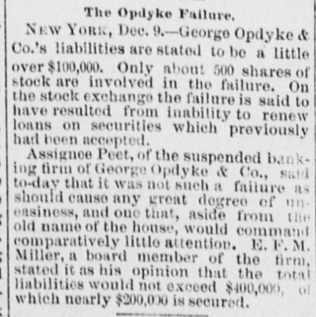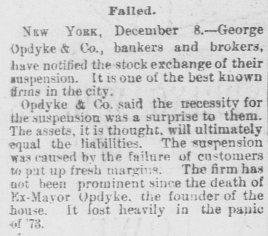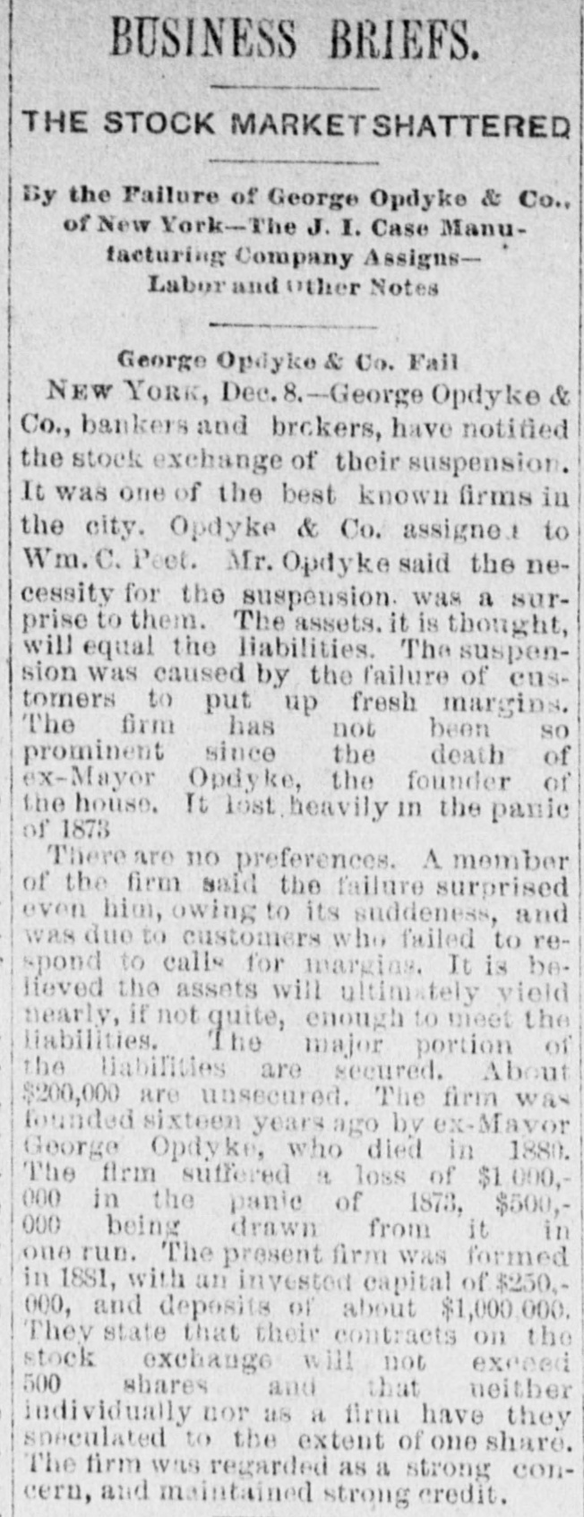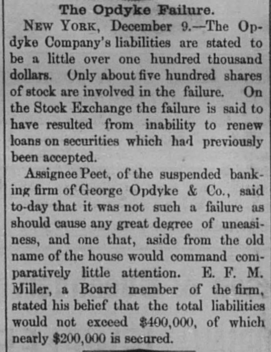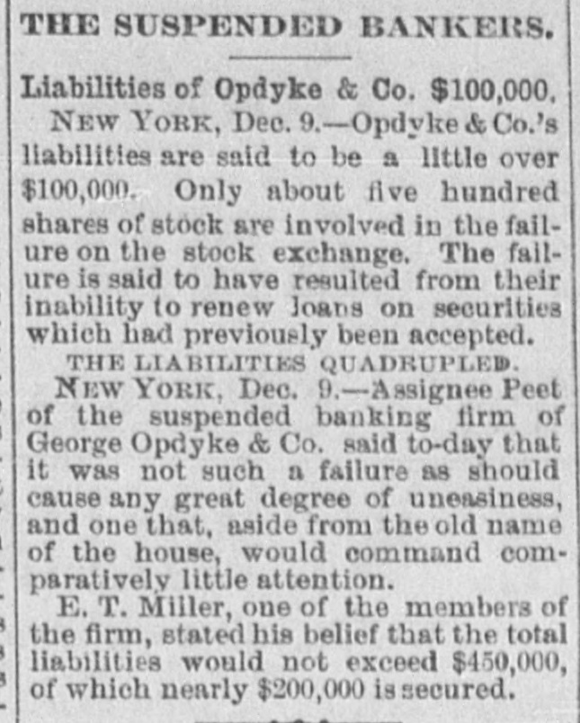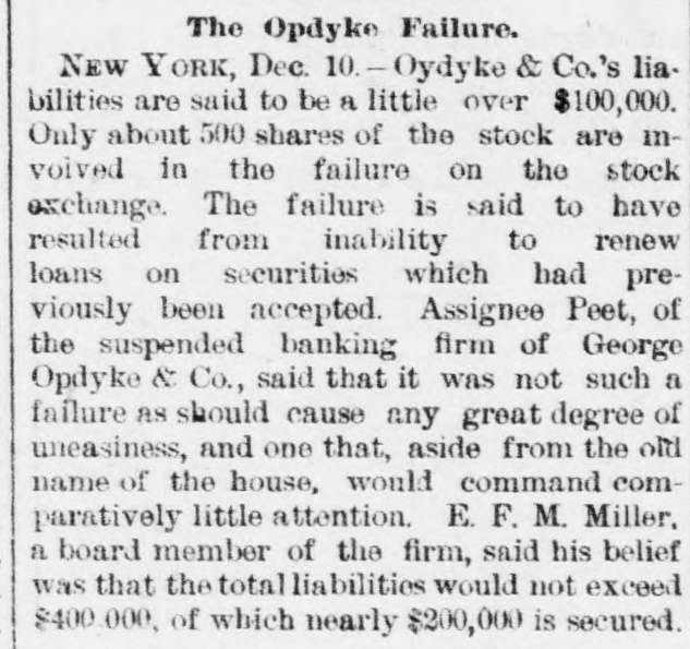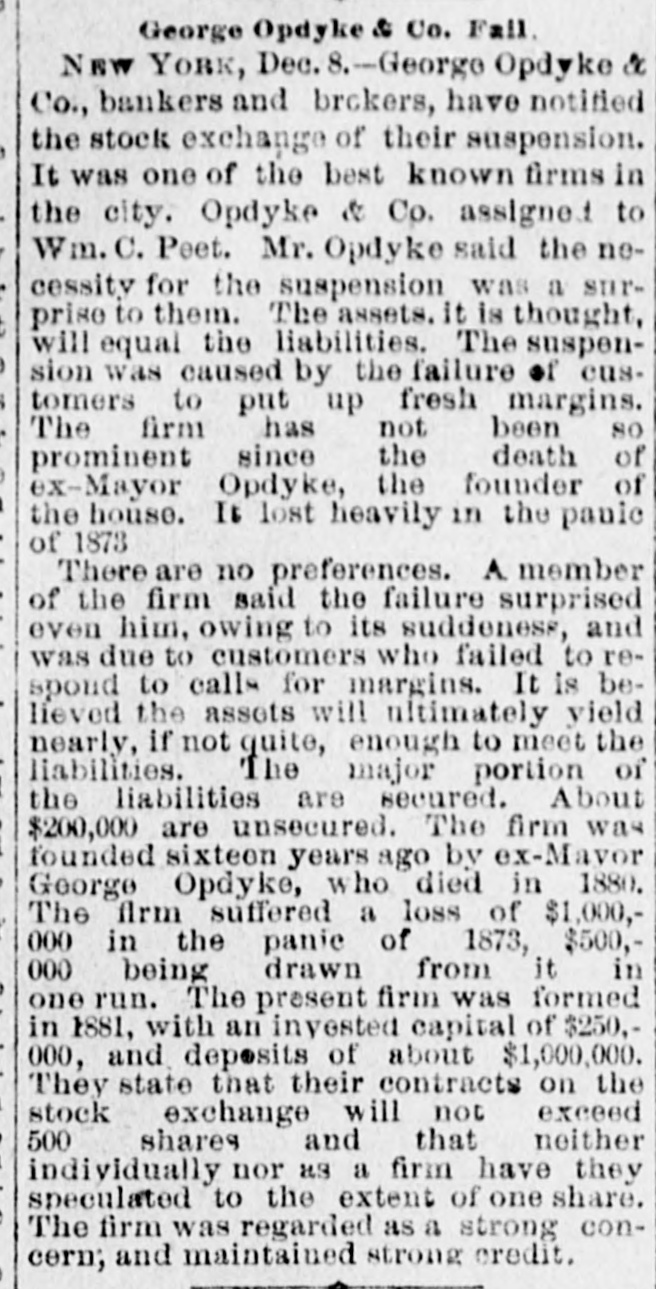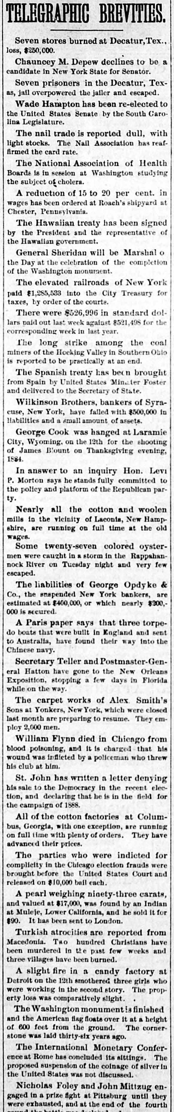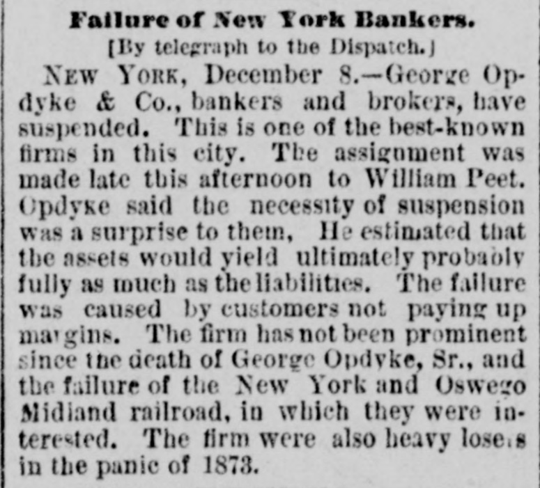 News Briefs. George Opdyke & Co., bankers and brokers, of New York, yesterday suspended. Opdyke & Co, had a capital invested of about $250,000, and deposits amounting to $1,000,000. M. Morth, who was shot by Mme. Clovis Hughes in Paris, died yesterday. Mother Mandelbaum, of New York, her son and Herman Stroude were arrested in Hamilton, Ontario, yesterday. Cook, the leader of the train robbers at Little Rock, Arkansas, made a full confession yesterday, and says his associates were Ciffford King and Adolphus Parker, a boy of 16 years. Ten watches and about $500 have been recovered. Last October the residence of Mr. R. Jones, at Raleigh, N. C., was destroyed by fire. Yesterday Sarah Ann Dennts, a servant girl, who had stolen some silverware, confessed that she had set it on fire. Two feet of snow fell in Montreal yesterday. A pearl weighing ninety carats, and valued at $17,000, was shipped from Guaymas to London Sun. day. It was purchased for $90 from an Indian, who found It in Lower California. Mr. James I. McLane, the treasurer of the Maryland Jockey club, has resigned. Jonas H. Powers, Way ne Powers and George Gib. son were yesterday sentenced in Scou county, Va, to be hanged February 6th, for the murder of a traveller for a small sum of money. Hugh Miller was stabbed and killed by Joe Roe, at Glasgow, Ky., yesterday for hurrahing for Cleve. land,and Hendricks. The wife of Deacon Ephraim Arch, of Quague, Long Island, eloped on Sunday with an unknow a negro, and It is thought they have gone to Florida, The board of United States commissioners of the New Orleans exposition yesterday adopted resolutions calling on Congress to adjourn la time to allow members to attend the opening. Among the deaths that occurred in New York last week were 127 from consumption, It from prieumonia, and 48 from bronchitis, the largest record known of diseases of that nature in the alstory of the health department. A delegation representing the woman's suffrage party called upon Sir John A. MacDonald, prime minister of Canada, yesterday, and thanked him for incorporating womann's suffrage in the pending Canadian franchise bill.