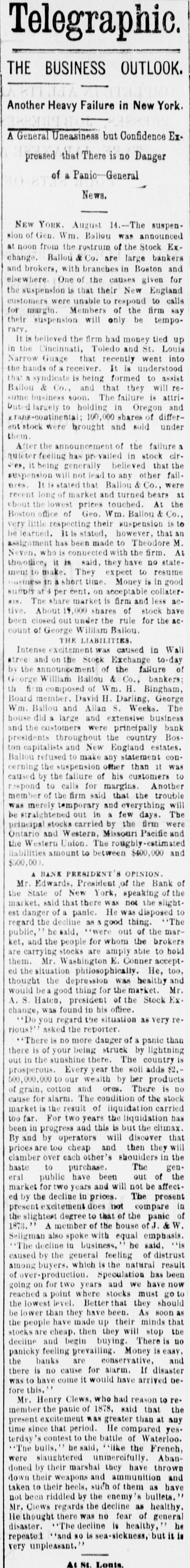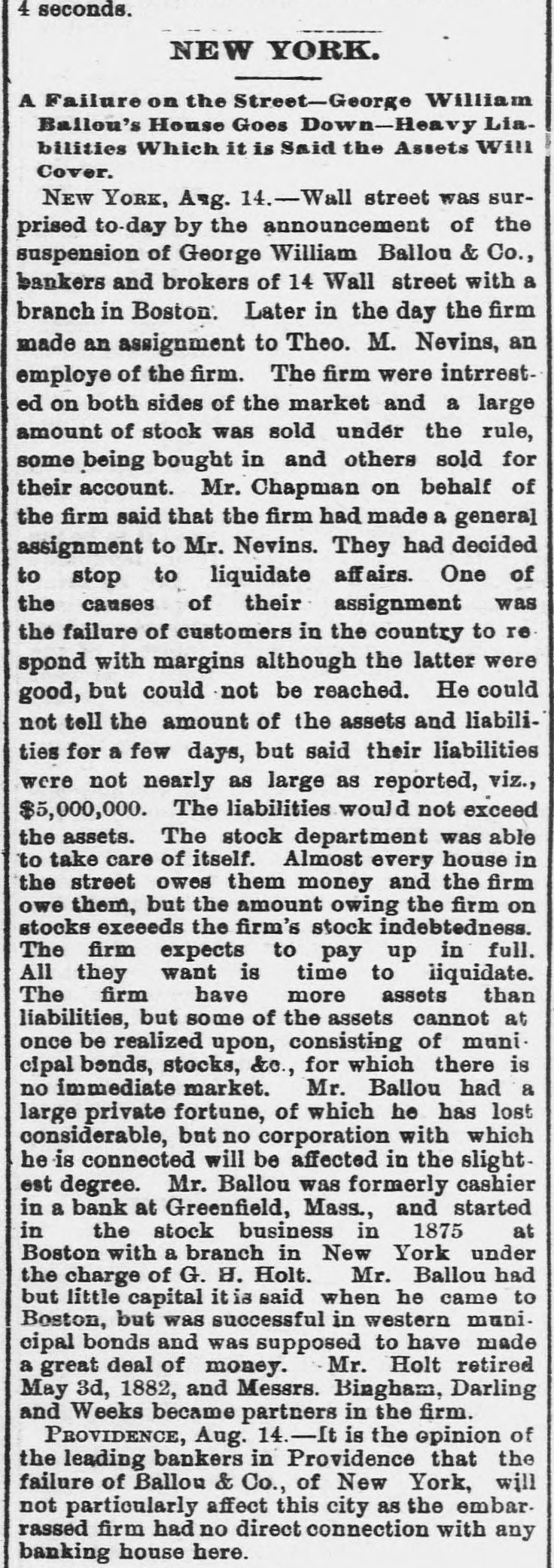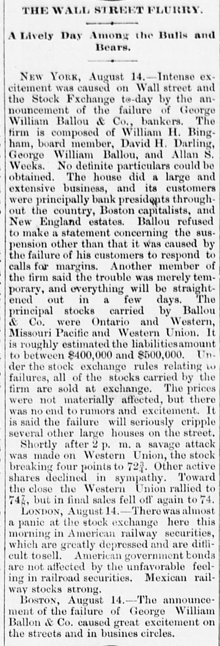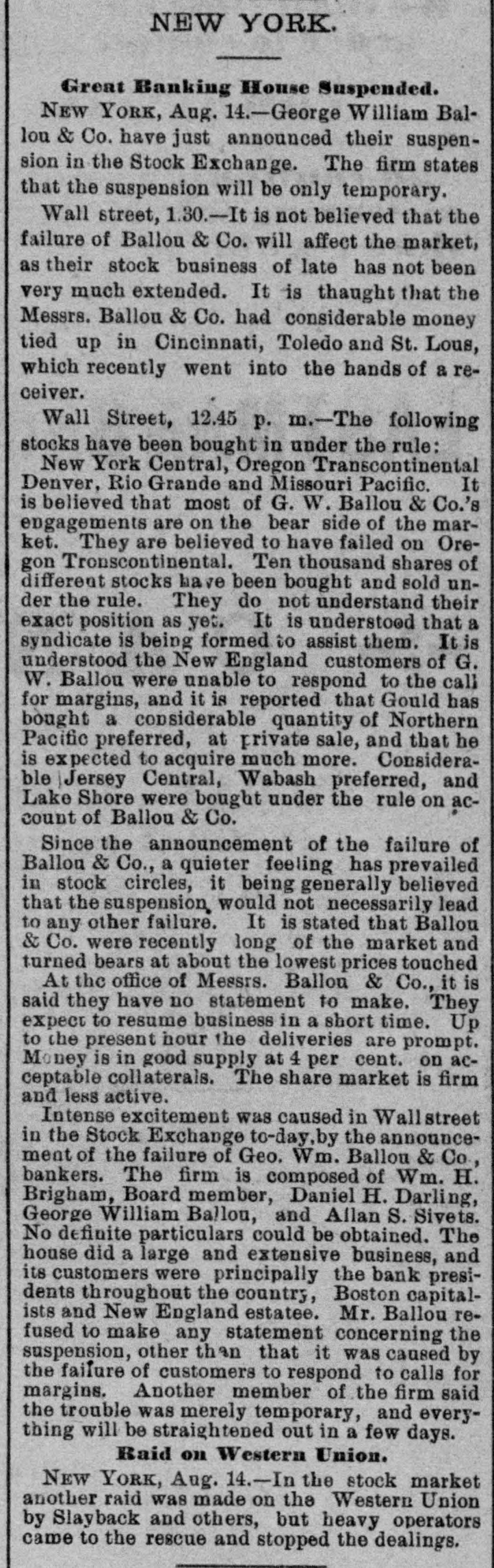 NEW YORK. Great Banking House Suspended. NEW YORK, Aug. 14.-George William Ballou & Co. have just announced their suspension in the Stock Exchange. The firm states that the suspension will be only temporary. Wall street, 1.30.-It is not believed that the failure of Ballou & Co. will affect the market, as their stock business of late has not been very much extended. It is thaught that the Messrs. Ballou & Co. had considerable money tied up in Cincinnati, Toledo and St. Lous, which recently went into the hands of a receiver. Wall Street, 12.45 p. m.-The following stocks have been bought in under the rule: New York Central, Oregon Transcontinental It Denver, Rio Grande and Missouri Pacific. is believed that most of G. W. Ballou & Co.'s engagements are on the bear side of the market. They are believed to have failed on Oregon Tronscontinental. Ten thousand shares of different stocks have been bought and sold under the rule. They do not understand their exact position as yet. It is understood that a syndicate is being formed to assist them. It is understood the New England customers of G. W. Ballou were unable to respond to the call for margins, and it is reported that Gould has bought a considerable quantity of Northern Pacific preferred, at private sale, and that he is ex pected to acquire much more. Considerable Jersey Central, Wabash preferred, and Lake Shore were bought under the rule on account of Ballou & Co. Since the announcement of the failure of Ballon & Co., a quieter feeling has prevailed in stock circles, it being generally believed that the suspension would not necessarily lead to any other failure. It is stated that Ballou & Co. were recently long of the market and turned bears at about the lowest prices touched At the office of Messrs. Ballou & Co., it is said they have no statement to make. They expect to resume business in a short time. Up to the present hour the deliveries are prompt. Money is in good supply at 4 per cent. on acceptable collaterals. The share market is firm and less active. Intense excitement was caused in Wallstreet in the Stock Exchange to-day, the announcement of the failure of Geo. Wm. Ballou & Co., bankers. The firm is composed of Wm. H. Brigham, Board member, Daniel H. Darling, George William Ballou, and Allan S. Sivets. No definite particulars could be obtained. The house did a large and extensive business, and its customers were principally the bank presidents throughout the country, Boston capitalists and New England estatee. Mr. Ballou refused to make any statement concerning the suspension, other than that it was caused by the failure of customers to respond to calls for margins. Another member of the firm said the trouble was merely temporary, and everything will be straightened out in a few days. Raid on Western Union. NEW YORK, Aug. 14.-In the stock market another raid was made on the Western Union by Slayback and others, but heavy operators came to the rescue and stopped the dealings.