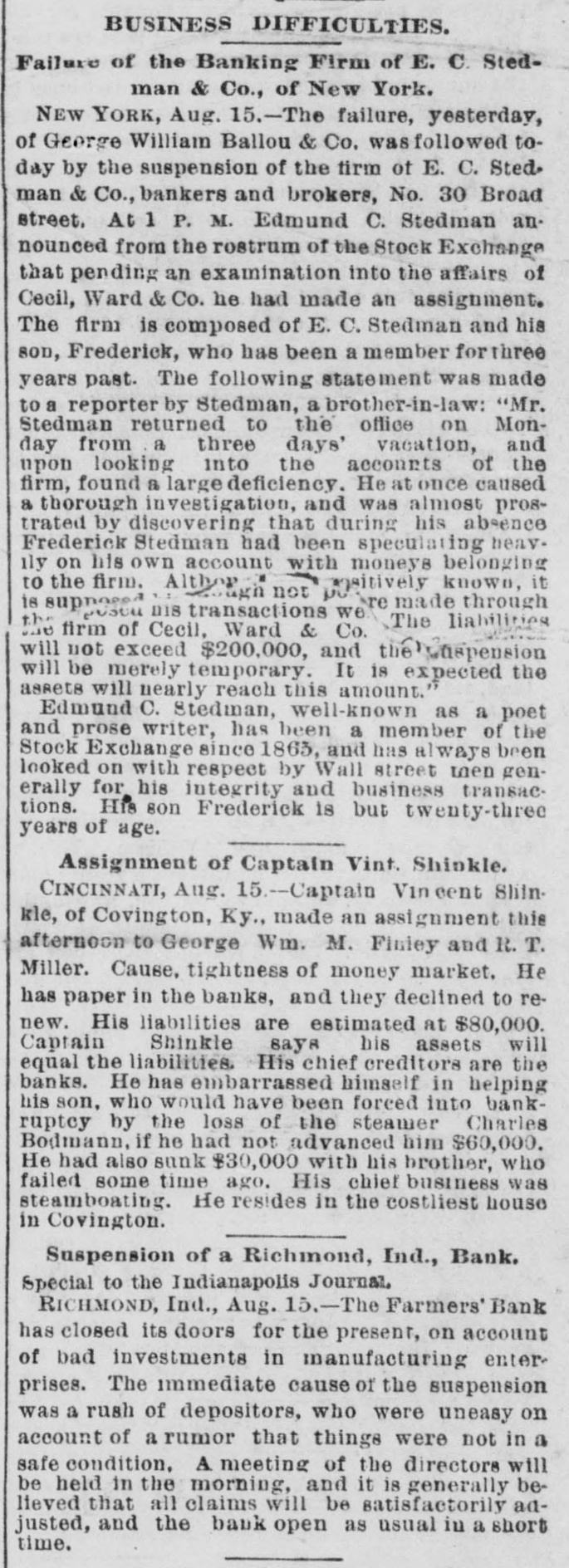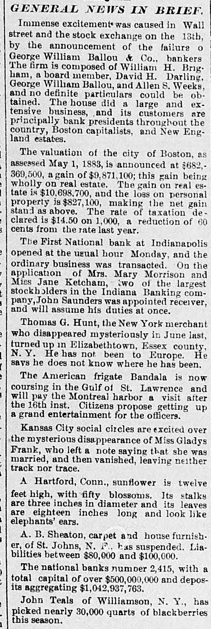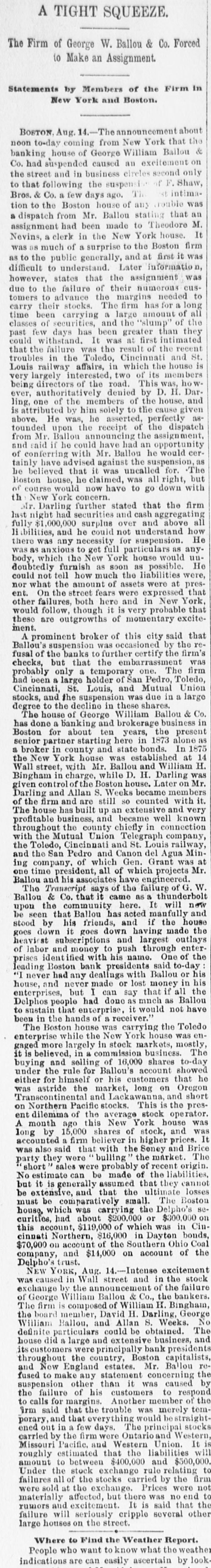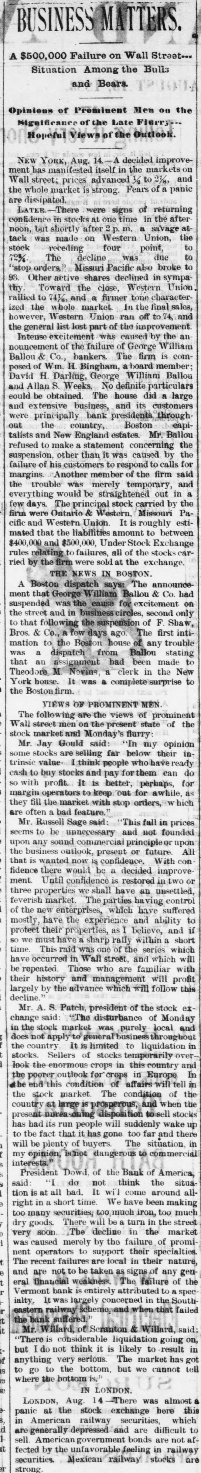NEW YORK. Great Banking House Suspended. NEW YORK, Aug. 14.-George William Ballou & Co. have just announced their suspension in the Stock Exchange. The firm states that the suspension will be only temporary. Wall street, 1.30.-It is not believed that the failure of Ballou & Co. will affect the market, as their stock business of late has not been very much extended. It is thaught that the Messrs. Ballou & Co. had considerable money tied up in Cincinnati, Toledo and St. Lous, which recently went into the hands of a receiver. Wall Street, 12.45 p. m.-The following stocks have been bought in under the rule: New York Central, Oregon Transcontinental It Denver, Rio Grande and Missouri Pacific. is believed that most of G. W. Ballou & Co.'s engagements are on the bear side of the market. They are believed to have failed on Oregon Tronscontinental. Ten thousand shares of different stocks have been bought and sold under the rule. They do not understand their exact position as yet. It is understood that a syndicate is being formed to assist them. It is understood the New England customers of G. W. Ballou were unable to respond to the call for margins, and it is reported that Gould has bought a considerable quantity of Northern Pacific preferred, at private sale, and that he is ex pected to acquire much more. Considerable Jersey Central, Wabash preferred, and Lake Shore were bought under the rule on account of Ballou & Co. Since the announcement of the failure of Ballon & Co., a quieter feeling has prevailed in stock circles, it being generally believed that the suspension would not necessarily lead to any other failure. It is stated that Ballou & Co. were recently long of the market and turned bears at about the lowest prices touched At the office of Messrs. Ballou & Co., it is said they have no statement to make. They expect to resume business in a short time. Up to the present hour the deliveries are prompt. Money is in good supply at 4 per cent. on acceptable collaterals. The share market is firm and less active. Intense excitement was caused in Wallstreet in the Stock Exchange to-day, the announcement of the failure of Geo. Wm. Ballou & Co., bankers. The firm is composed of Wm. H. Brigham, Board member, Daniel H. Darling, George William Ballou, and Allan S. Sivets. No definite particulars could be obtained. The house did a large and extensive business, and its customers were principally the bank presidents throughout the country, Boston capitalists and New England estatee. Mr. Ballou refused to make any statement concerning the suspension, other than that it was caused by the failure of customers to respond to calls for margins. Another member of the firm said the trouble was merely temporary, and everything will be straightened out in a few days. Raid on Western Union. NEW YORK, Aug. 14.-In the stock market another raid was made on the Western Union by Slayback and others, but heavy operators came to the rescue and stopped the dealings.