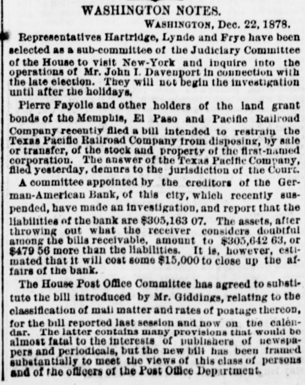 WASHINGTON NOTES. WASHINGTON, Dec. 22, 1878. Representatives Hartridge, Lynde and Frye have been selected as a sub-committee of the Judiciary Committee of the House to visit New-York and inquire into the operations of Mr. John I. Davenport in connection with the late election. They will not begin the investigation until after the holidays. Pierre Fayolle and other holders of the land grant bonds of the Memphis, El Paso and Pacific Railroad Company recently filed a bill intended to restrain the Texas Pacific Railroad Company from disposing, by sale or transfer, of the stock and property of the first-named corporation. The answer of the Texas Pacific Company, filed yesterday, demurs to the jurisdiction of the Court. A committee appointed by the creditors of the German-American Bank, of this city, which recently suspended, have made an investigation, and report that the liabilities of the bank are $305,163 07. The assets, after throwing out what the receiver considers doubtful among the bills receivable, amount to $305,642 63, or $479 56 more than the liabilities. It is, however, estimated that it will cost some $15,000 to close up the affairs of the bank. The House Post Office Committee has agreed to substitute the bill introduced by Mr. Giddings, relating to the classification of mail matter and rates of postage thereon, for the bill reported last session and now on the caléndar. The latter contains many provisions that would be almost fatal to the interests of publishers of newspapers and periodicals, but the new bill has been tramed substantially to meet the views of this class of persons and of the officers of the Post Office Department.