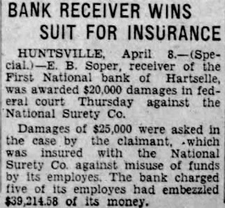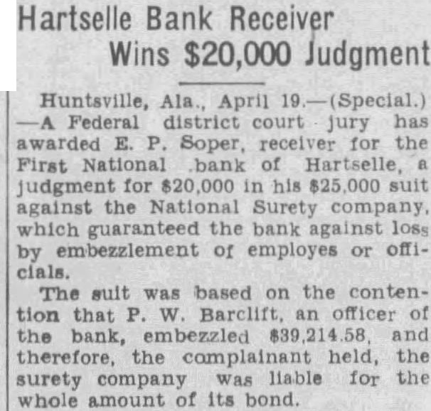 BANK RECEIVER WINS SUIT FOR INSURANCE April Soper, receiver of the First National bank of Hartselle, awarded against National Co. Damages of were asked in the case with the National Surety Co. funds The charged had embezzled of its money.