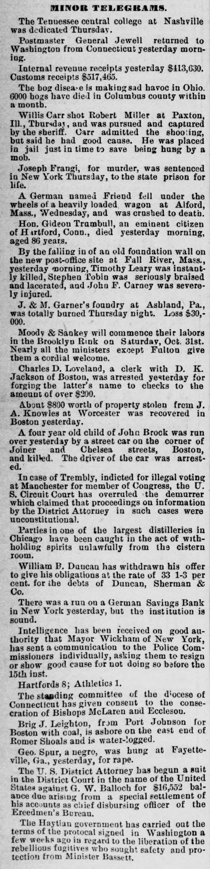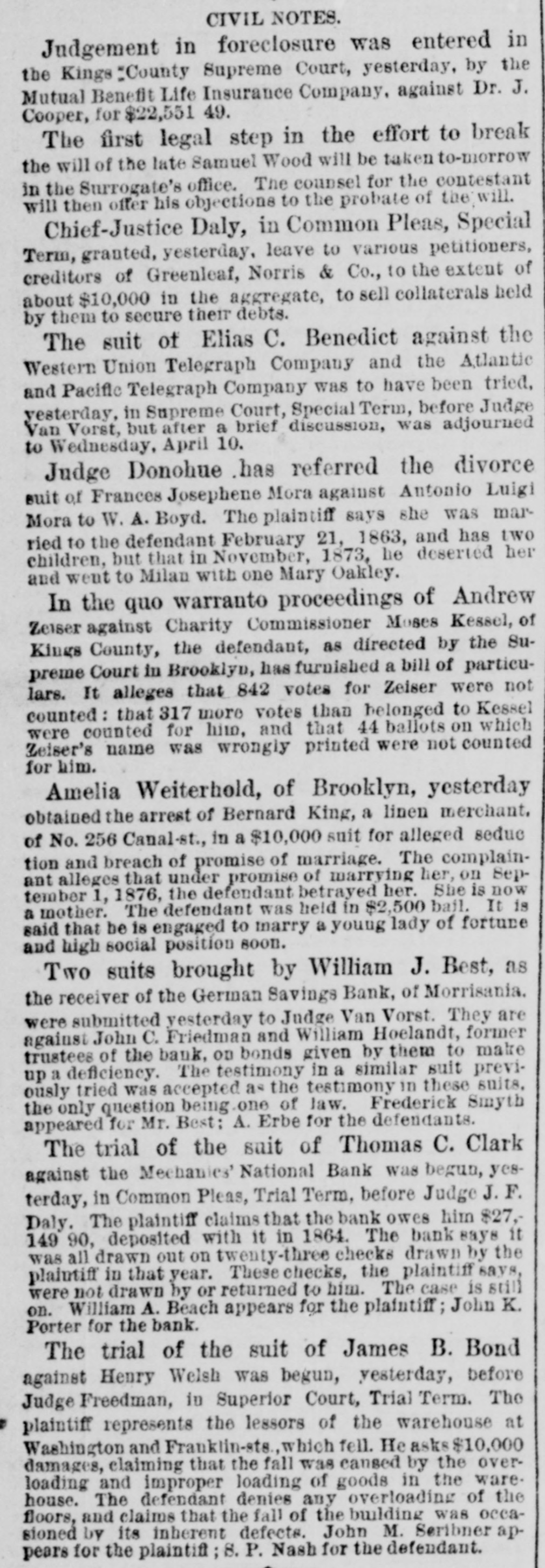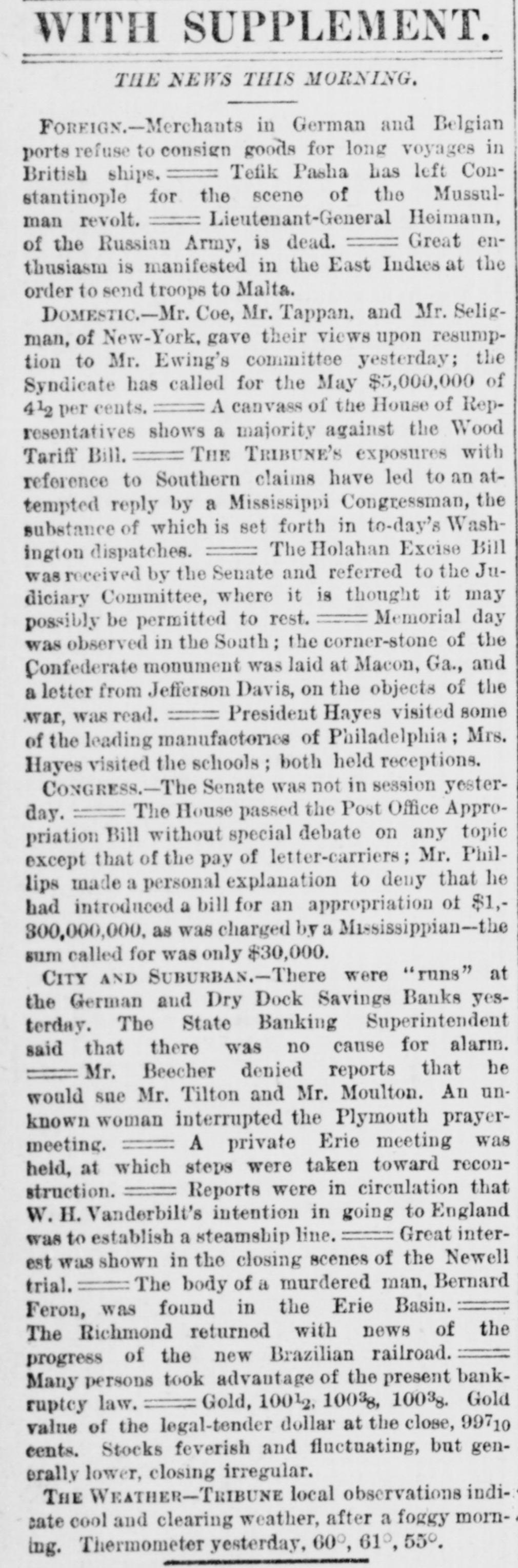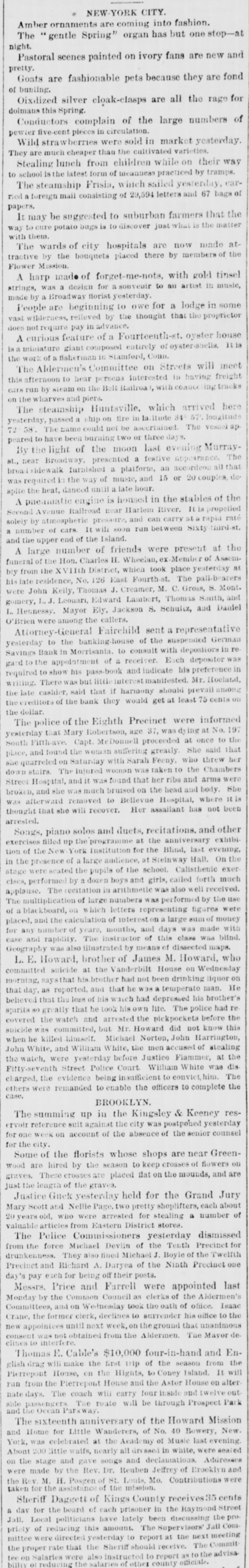 NEW-YORK CITY. Amber ornaments are coming into fashion. The .. gentle Spring" organ has but one stop-at night. Pastoral scenes painted on ivory fans are new and pretty. Goats are fashionable pets because they are fond of bunting. Oixdized silver cloak-clasps are all the rage for dolmans this Spring. Conductors complain of the large numbers of pewter five-cent pieces in circulation. Wild strawberries were sold in market yesterday. They are much cheaper than the cultivated varieties. Stealing lunch from children while on their way to school is the latest form of meanness practiced by tramps. The steamship Frisia, which sailed yesterday, carried foreign mail consisting of 29,594 letters and 67 bags of papers. It may be suggested to suburban farmers that the way to cure potato bugs is to discover just what is the matter with them. The wards of city hospitals are now made attractive by the bouquets placed there by members of the Flower Mission A harp made of forget-me-nots, with gold tinsel strings, was a design for souveair to all artist in music, made by a Broadway florist yesterday. People are beginning to owe for a lodge in some vast wilderness, relieved by the thought that the proprietor does not require pay in advance. A enrious feature of a Fourteenth-st. oyster house is a miniature giant composed entirely of oyster-shells It is the work of a fisherman in Stamford, Conn. The Aldermen's Committee on Streets will meet this afternoon to hear persons interested in having freight cars run by steam on the Belt Railroa with coance ing tracks on the wharves and piera. The steamship Huntsville, which arrived here yesterday, passed a ship on fire in la.itude 349 57' longitad 72 58. The name could not be ascertained The vessel ap peared to have been burning two or three days. By the light of the moon last evening Murrayst., near Broadway, presented a festive appearance. The broad sidewalk furnished a platform, an accordeon all that was required is the way of music, and 15 or 20 couples de spite the heat, danced until a late hour. A paeamatic engine is housed in the stables of the Second Avenue Railroad near Harlem River. It is propelled solely by atmospheric pressure, and can carry at a rapid raté a number of cars It will soon run between Sixty third- st. and the upper end of the Island. A large number of friends were present at the funeral of the Hon. Charles H. Wheelan, ex Member of Assem. biy from the XVIIth District, which took place yesterday at his late residence, No. 126 East Fourth-st. The pall-bearers were John Keily, Thomas J. Creamer, M. C. Gross, S. Mont. gomery, L. J. Leonari, Edward Lambert, Thomas Smith, and L. Hennessy, Mayor Ely, Jackson S. Schultz, and Daniel O'Brien were among the callers. Attorney-General Fairchild sent a representative yesterday to the banking-house of the suspended German Savings Bank in Morrisania. to consult with depositors in re gard to the appointment of a receiver. Each depositor was required to show his pass-book and indicate his preference in riting. There was but little interest manifested Mr. Hoeland, the late cashier said that if harmony should prevail among the creditors of the bank they would get at least 75 cents on the dollar. The police of the Eighth Precinet were informed yesterday that Mary Robertson, age 37, was dy ing at No. 197 South Fifthave, Capt. McDonnell proceeded at once to the place, and found the woman suffering greatly She said that she quarreled on Saturday with Sarah Feeny, who threw her down stairs. The injured woman was taken to the Chambers Street Hospital, and it wasfound that her ribs and arms were broken, and she was much bruised on the head and body. She was afterward removed to Bellevue Hospital, where thought that she will recover. Her assailant has not been arrested. Songs, piano solos and duets, recitations. and other exercises filled up the programme at the anniversary exhibition of the New York Institution for the Blind, last evening, in the presence of a large audience, at Steinway Hall. On the stage were seated the pupils of the school Calisthenic exer elses, performed by a dozen boys and girls, called forth much applause. The recitation in arithmette was also well received. The multiplication of large numbers was performed by the use of a blackboard, on which letters representing figures were placed, and the calculation of intereston a large sum of money for any number of years, months, and days was made with ease and rapidity. The instructor of this class was blind. Geography was also illustrated by means of dissected maps. L. E. Howard, brother of James M. Howard, who committed suicide at the Vanderbilt House on Wednesday morning, saysthat his brother had not been drinking liquor on that day, as reported, and that he W38 temperate man. He believed that the loss of his watch had depressed his brother's spirits 80 greatly that he took his own life. The police had re covered the watch and arrested the pickpockets before the suicide was committed, but Mr. Howard did not know this when he killed himself. Michael Norton, John Harrington, John White, and William White, the men accused of stealing the watch, were yesterday before Justice Fiammer, at the Fitty-seventh Street Police Coart William White was dis charged, the evidence being insufficient to convict,him The others case. were remanded to enable the officers to complete the BROOKLYN. The summing up in the Kingsley & Keeney resrvoir reference suit against the city was postpolied yesterday for one week on account of the absence of the senior counsel for the city. Some of the florists whose shops are near Greenwood are hired by the season to keep crosses of flowers on graves. These crosses are placed dat on the mounds, and are just the length of the graves. Justice Guck yesterday held for the Grand Jury Mary Scott and Nellie Page. two pretty shoplifters, each about 20 years old, who were arrested for stealing a number of valuable articles from Eastern District s