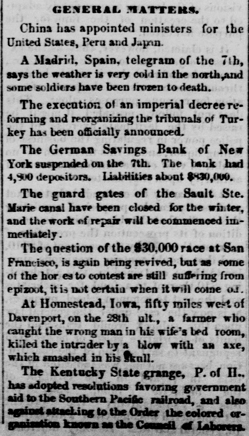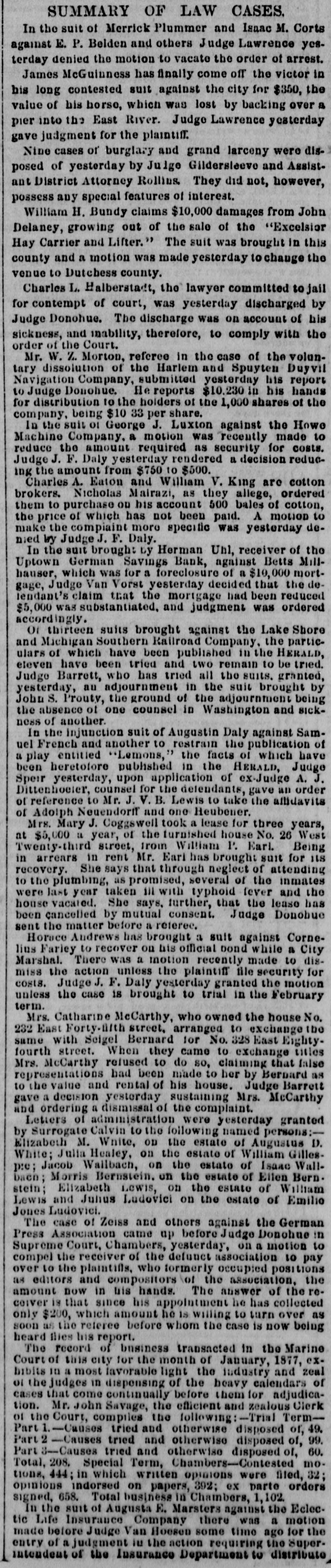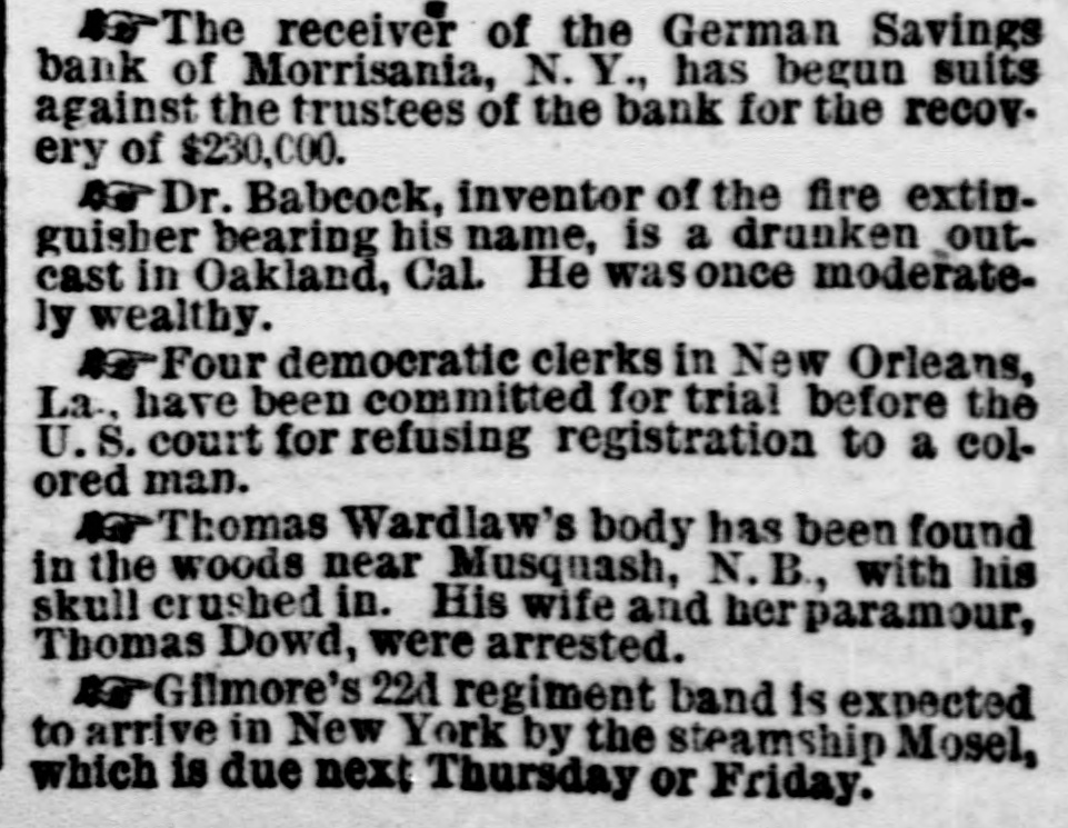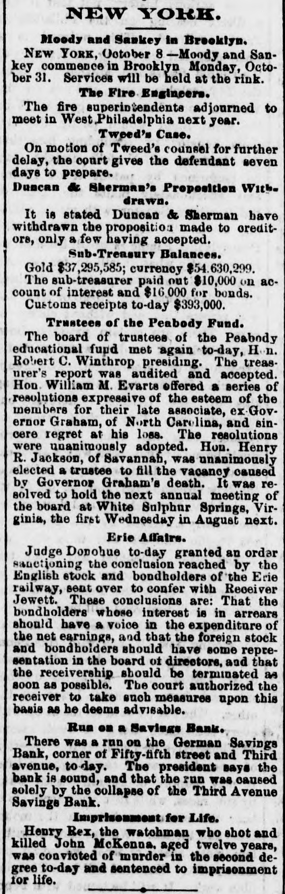NEW-YORK CITY. Amber ornaments are coming into fashion. The .. gentle Spring" organ has but one stop-at night. Pastoral scenes painted on ivory fans are new and pretty. Goats are fashionable pets because they are fond of bunting. Oixdized silver cloak-clasps are all the rage for dolmans this Spring. Conductors complain of the large numbers of pewter five-cent pieces in circulation. Wild strawberries were sold in market yesterday. They are much cheaper than the cultivated varieties. Stealing lunch from children while on their way to school is the latest form of meanness practiced by tramps. The steamship Frisia, which sailed yesterday, carried foreign mail consisting of 29,594 letters and 67 bags of papers. It may be suggested to suburban farmers that the way to cure potato bugs is to discover just what is the matter with them. The wards of city hospitals are now made attractive by the bouquets placed there by members of the Flower Mission A harp made of forget-me-nots, with gold tinsel strings, was a design for souveair to all artist in music, made by a Broadway florist yesterday. People are beginning to owe for a lodge in some vast wilderness, relieved by the thought that the proprietor does not require pay in advance. A enrious feature of a Fourteenth-st. oyster house is a miniature giant composed entirely of oyster-shells It is the work of a fisherman in Stamford, Conn. The Aldermen's Committee on Streets will meet this afternoon to hear persons interested in having freight cars run by steam on the Belt Railroa with coance ing tracks on the wharves and piera. The steamship Huntsville, which arrived here yesterday, passed a ship on fire in la.itude 349 57' longitad 72 58. The name could not be ascertained The vessel ap peared to have been burning two or three days. By the light of the moon last evening Murrayst., near Broadway, presented a festive appearance. The broad sidewalk furnished a platform, an accordeon all that was required is the way of music, and 15 or 20 couples de spite the heat, danced until a late hour. A paeamatic engine is housed in the stables of the Second Avenue Railroad near Harlem River. It is propelled solely by atmospheric pressure, and can carry at a rapid raté a number of cars It will soon run between Sixty third- st. and the upper end of the Island. A large number of friends were present at the funeral of the Hon. Charles H. Wheelan, ex Member of Assem. biy from the XVIIth District, which took place yesterday at his late residence, No. 126 East Fourth-st. The pall-bearers were John Keily, Thomas J. Creamer, M. C. Gross, S. Mont. gomery, L. J. Leonari, Edward Lambert, Thomas Smith, and L. Hennessy, Mayor Ely, Jackson S. Schultz, and Daniel O'Brien were among the callers. Attorney-General Fairchild sent a representative yesterday to the banking-house of the suspended German Savings Bank in Morrisania. to consult with depositors in re gard to the appointment of a receiver. Each depositor was required to show his pass-book and indicate his preference in riting. There was but little interest manifested Mr. Hoeland, the late cashier said that if harmony should prevail among the creditors of the bank they would get at least 75 cents on the dollar. The police of the Eighth Precinet were informed yesterday that Mary Robertson, age 37, was dy ing at No. 197 South Fifthave, Capt. McDonnell proceeded at once to the place, and found the woman suffering greatly She said that she quarreled on Saturday with Sarah Feeny, who threw her down stairs. The injured woman was taken to the Chambers Street Hospital, and it wasfound that her ribs and arms were broken, and she was much bruised on the head and body. She was afterward removed to Bellevue Hospital, where thought that she will recover. Her assailant has not been arrested. Songs, piano solos and duets, recitations. and other exercises filled up the programme at the anniversary exhibition of the New York Institution for the Blind, last evening, in the presence of a large audience, at Steinway Hall. On the stage were seated the pupils of the school Calisthenic exer elses, performed by a dozen boys and girls, called forth much applause. The recitation in arithmette was also well received. The multiplication of large numbers was performed by the use of a blackboard, on which letters representing figures were placed, and the calculation of intereston a large sum of money for any number of years, months, and days was made with ease and rapidity. The instructor of this class was blind. Geography was also illustrated by means of dissected maps. L. E. Howard, brother of James M. Howard, who committed suicide at the Vanderbilt House on Wednesday morning, saysthat his brother had not been drinking liquor on that day, as reported, and that he W38 temperate man. He believed that the loss of his watch had depressed his brother's spirits 80 greatly that he took his own life. The police had re covered the watch and arrested the pickpockets before the suicide was committed, but Mr. Howard did not know this when he killed himself. Michael Norton, John Harrington, John White, and William White, the men accused of stealing the watch, were yesterday before Justice Fiammer, at the Fitty-seventh Street Police Coart William White was dis charged, the evidence being insufficient to convict,him The others case. were remanded to enable the officers to complete the BROOKLYN. The summing up in the Kingsley & Keeney resrvoir reference suit against the city was postpolied yesterday for one week on account of the absence of the senior counsel for the city. Some of the florists whose shops are near Greenwood are hired by the season to keep crosses of flowers on graves. These crosses are placed dat on the mounds, and are just the length of the graves. Justice Guck yesterday held for the Grand Jury Mary Scott and Nellie Page. two pretty shoplifters, each about 20 years old, who were arrested for stealing a number of valuable articles from Eastern District s
