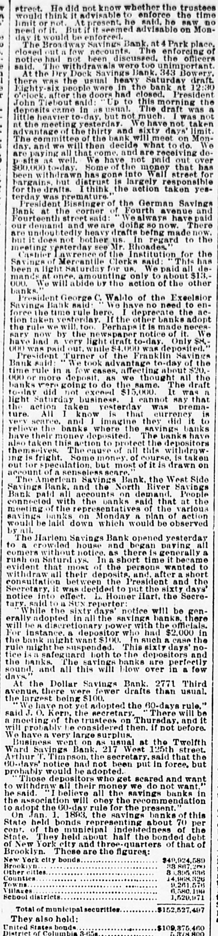 and nu SZUJABS ey enjorce eye sjunooou MOJ " 1110 per ice had not been discussed. the officer 1. The withdrawals were too unimportant the Dry Dock Savings Bank. 343 Bowery e was the usual heavy Saturday draft hty-six people were in the bank at 12:30 ock. after the doors had closed. President n Tiebout said: Up to this morning the osits came in as usual. The draft was e heavier to-day. but not much. I was not 10 meeting yesterday. We have not taken antage of the thirty and sixty days' limit committee of the bank will meet on Monand we will then decide what to do. We paying all that come. and are receiving dets as well. We have not paid out over 000 to-day. Some of the money that has 1 withdrawn has gone into Wall street for rains. but distrust is largely responsible he drafts. I think the action taken yesay was premature. esident Bissinger of the German Savings k at the corner of Fourth avenue and teenth street said: We always have paid demand and we are doing so now. There indoubtedly heavy drafts being made now. t does not bother us. In regard to the ting yesterday see Mr. Rhoades." shier awrence of the Institution for the ngs of Mercantile Clerks said: This has n. light Saturday for us. We paid all dede at once. amounting only to about $13.We will abide by the action of the other s." sident George C. Waldo of the Excelsior -ue 07 peou ou DAWY OM :ping NUMB HMU . the time rule here. I deprecate the actaken vesterday. If the other banks adopt ale we will. too. Perhaps it is made necesnow by the newspaper notice of it. We had A very light draft to-day. Only $8.personed. SUM 000't$ AMM uno pind SUA sident Turner of the Franklin Savings : said: We took advantage to-day of the -'OAS enoque cases. MOJ R up alna out 114 though OM SW Tisodop олош ,10 s vere going to do the same. The draft u SUM 11 '000'91$ редэха 100 PIP A Saturday business. 1 cannot say that action taken yesterday Was prema#! servence think SI mour I IIV scaree. and I imagine they did it to ve the banks where the savings banks their money deposited. The banks have taken this action to protect the depositors selves. The cause of all this withdraw4 fright. Some money. of course. is taken or speculation. but most of it is drawn on secure securites v jo que . American Savings Bank, the West Side gs Bank. and the North River Savings paid all accounts on demand. People reted with the banks said that at the ing of the representatives of the various gs banks on Monday a plan of action I be laid down which would be observed , I. Harlem Savings Bank opened yesterday crowded house and began paving all 8 SI there SB received another 9.1 on Saturday In a short time it became nt that most of the persons wanted to short B rette 'pun peposits. that II" iltation between the President and the tary. it was decided to put the sixty days' e into effect. L. Homer Hart. the Secrerepreter was " 04 plus hile the sixty days' notice will be gen* adopted in all the savings banks. there e R. discretionary power with the officials. up $2.000 puy 044 B ink might want $100. In such a case the night he suspended. This sixty days' no, a safeguard both to the depositors and anks. The savings banks are perfectly Moj B up JOAO MOTH IIIM sills 118 pun i the Dollar Savings Bank. 2771 Third 1e. there were fewer drafts than usual. rgest being $100. e have not yet adopted the 60-days rule." . O. Kern. the secretary. There will be ting of the trustees on Thursday. and it robably be considered then. if not before. ave n very large surplus. iness went on as usual at the Twelfth Savings Bank. 217 West 125th street. r 'I'. Timpson. the secretary. said that the vs' notice had not been put in force. but bly would be adopted. hose depositors who get scared and want hdraw all their money we do not want." d. "I believe all the savings banks in sociation will obey the recommendation