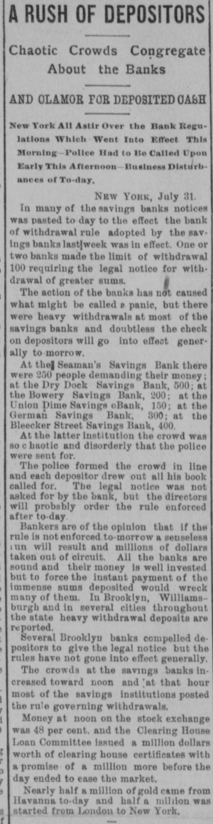 A RUSH OF DEPOSITORS Chaotic Crowds Congregate About the Banks AND OLAMOR FOR DEPOSITED CASH New York All Astir Over the Bank Regulations Which Went Into Effect This Morning-Police Had to Be Called Upon Early This Afternoon-Business Disturbances of To-day. NEW YORK, July 31. In many of the savings banks notices was pasted to day to the effect the bank of withdrawal rule adopted by the savings banks last|week was in effect. One or two banks made the limit of withdrawal 100 requiring the legal notice for withdrawal of greater sums. The action of the banks has not caused what might be called 8 panie, but there were heavy withdrawals at most of the savings banks and doubtless the check on depositors will go into effect generally to-morrow. At the Seaman's Savings Bank there were 250 people demanding their money; at the Dry Dock Savings Bank, 500; at the Bowery Savings Bank, 200; at the the Union Dime Savings oBank, 150; at German Savings Bank, 300; at the Bleecker Street Savings Bank, 400. At the latter institution the crowd was so e haotic and disorderly that the police were sent for. The police formed the crowd in line and each depositor drew out all his book called for. The legal notice was not asked for by the bank, but the directors will probably order the rule enforced after to-day Bankers are of the opinion that if the rule is not enforced to-morrow a senseless run will result and millions of dollars taken out of circuit. All the banks are sound and their money is well invested but to force the instant payment of the immense sums deposited would wreck many of them. In Brooklyn, Williamsburgh and in several cities throughout the state heavy withdrawal deposits are reported. Several Brooklyn banks compelled depositors to give the legal notice but the rules have not gone into effect generally. The crowds at the savings banks increased toward noon and 'at that hour most of the savings institutions posted the rule governing withdrawals. Money at noon on the stock exchange was 48 per cent. and the Clearing House Loan Committee issued a million dollars worth of clearing house certificates with a promise of a million more before the day ended to ease the market. Nearly half a million of gold came from Havanna to-day and half a million was started from London to New York,