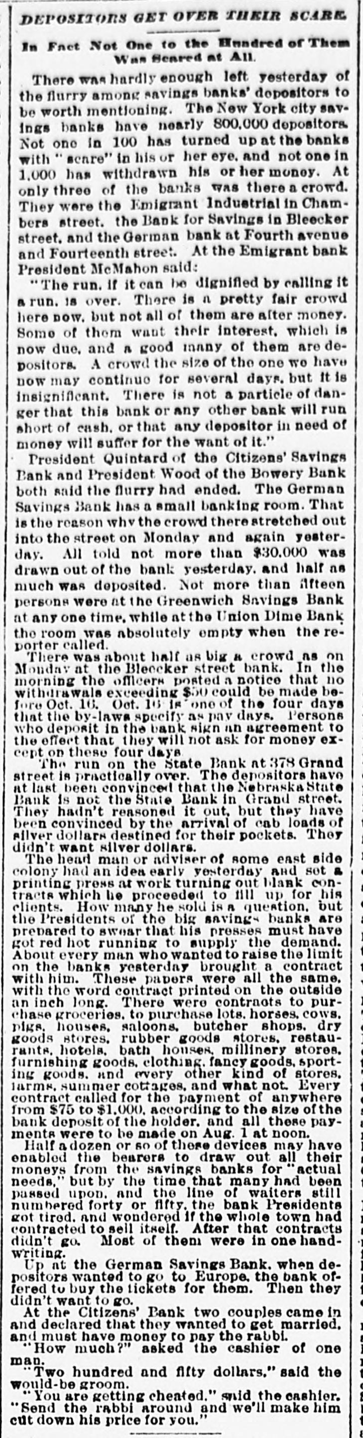 one in 100 has turned up at the banks scare" in his or her eye. and not one in has withdrawn his or her money. At three of the banks was there a crowd. were the Emigrant Industrial in Chamstreet. the Bank for Savings in Bleecker and the German bank at Fourth avenue Fourteenth street. At the Emigrant bank esident McMahon said: The run. if it can be dignified by calling it 18 over. There is n pretty fair crowd DOW. but not all of them are after money. of them want their interest. which is due, and a good many of them are desitors. A crowd the size of the one we have may continue for several days. but It is significant. There is not a particle of danthat this bank or any other bank will run of cash. or that any depositor in need of will suffer for the want of it." President Quintard of the Citizens' Savings and President Wood of the Bowery Bank said the flurry had ended. The German vings Bank has a small banking room. That he reason whv the crowd there stretched out the street on Monday and again yesterAll told not more than $30,000 was out of the bank yesterday. and half as was deposited. Not more than fifteen were at the Greenwich Savings Bank one time. while at the Union Dime Bank room was absolutely empty when the recalled. 'here was about half as big H crowd as on uday at the Bleocker street bank. In the the officers posted a notice that no hdrawals exceeding $50 could be made beOct. 16. Oct. 16 1s one of the four days the by-laws specify as pay days. Persons deposit in the bank sign an agreement to effect that they will not ask for money exon these four days The run on the State Bank at 378 Grand is practically over. The depositors have been convinced that the Nebraska State is not the State Bank in Grand street. hadn't reasoned it out, but they have convinced by the arrival of cab loads of dollars destined for their pockets. They want silver dollars. he head man or adviser of some east side had an idea early yesterday and set a press at work turning out blank conwhich he proceeded to fill up for his How many he sold is a question. but Presidents of the big savings banks are pared to swear that his presses must have red hot running to supply the demand. every man who wanted to raise the limit the banks yesterday brought a contract him. These papers were all the same. the word contract printed on the outside inch long. There were contracts to purgroceries. to purchase lots. horses. cows. houses. saloons. butcher shops. dry stores. rubber goods stores. restauhotels. bath houses. millinery stores. nishing goods. clothing. fancy goods, sportgoods. and every other kind of stores. summer cottages. and what not. Every called for the payment of anywhere $75 to $1,000, according to the size of the deposit of the holder. and all these paywere to be made on Aug. 1 at noon. a dozen or so of these devices may have the bearers to draw out all their from the savings banks for "actual but by the time that many had been upon. and the line of waiters still nbered forty or fifty. the bank Presidents tired. and wondered if the whole town had tracted to sell itself. After that contracts go. Most of them were in one hand-
