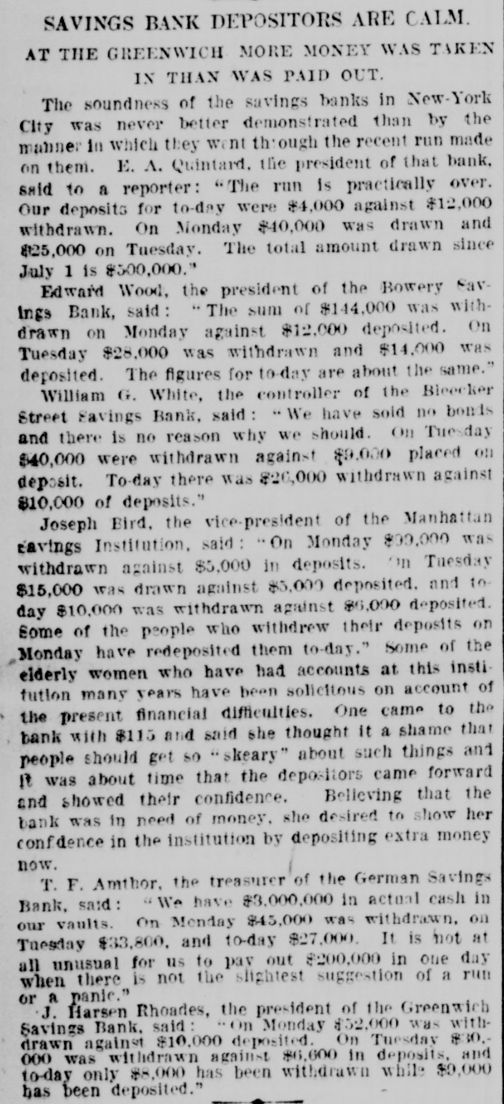 SAVINGS BANK DEPOSITORS ARE CALM. AT THE GREENWICH MORE MONEY WAS TAKEN IN THAN WAS PAID OUT. The soundness of the savings banks in New-York City was never better demonstrated than by the manner 10 which they went th:ough the recent run made on them. E. A. Quintard, the president of that bank, said to a reporter: "The run is practically over. Our deposits for to-day were $4,000 against $12,000 withdrawn. On Monday $40,000 was drawn and $25,000 on Tuesday. The total amount drawn since July 1 is $500,000." Edward Wood, the president of the Bowery SavIngs Bank, said: The sum of $144,000 was withdrawn on Monday against $12,000 deposited. On Tuesday $28,000 was withdrawn and $14,000 was deposited. The figures for to-day are about the same." William G. White, the controller of the Bleecker Street Savings Bank, said: "We have sold no bonds and there is no reason why we should. On Tuesday $40,000 were withdrawn against $9,000 placed on deposit. To-day there was $26,000 withdrawn against $10,000 of deposits." Joseph Bird, the vice-president of the Manhattan davings Institution, said : "On Monday $99,000 was withdrawn against $5,000 in deposits. On Tuesday $15,000 was drawn against $5,000 deposited. and today $10,000 was withdrawn against $6,000 deposited. Some of the people who withdrew their deposits on Monday have redeposited them to-day." Some of the elderly women who have had accounts at this institution many years have been solicitous on account of the present financial difficulties. One came to the bank with $115 and said she thought it a shame that people should get so "skeary" about such things and It was about time that the depositors came forward and showed their confidence. Believing that the bank was in need of money, she desired to show her confidence in the institution by depositing extra money now. T. F. Amthor, the treasurer of the German Savings Bank, said: "We have $3,000,000 in actual cash in our vaults. On Monday $45,000 was withdrawn, on Tuesday $33,800. and to-day $27,000. It is not at all unusual for us to pay out $200,000 in one day when there is not the slightest suggestion of a run or a panic." J. Harsen Rhoades, the president of the Greenwich Savings Bank. said: "On Monday $52,000 was withdrawn against $10,000 deposited. On Tuesday $30,000 was withdrawn against $6,600 in deposits, and to-day only $8,000 has been withdrawn while $9,000 has been deposited."