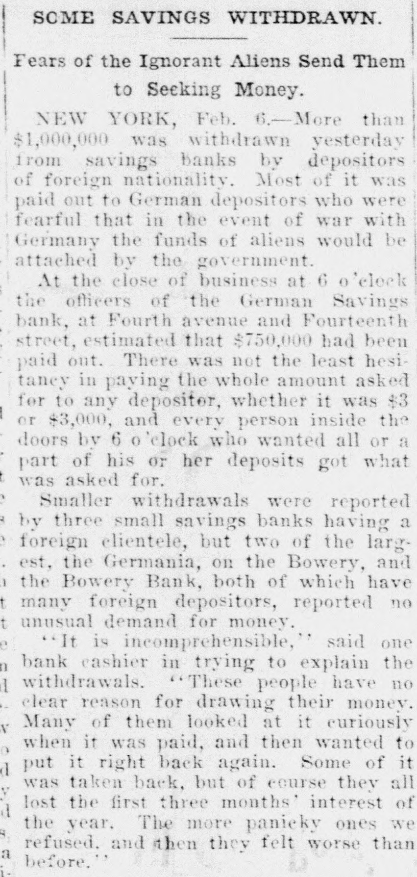 SOME SAVINGS WITHDRAWN. Fears of the Ignorant Aliens Send Them to Seeking Money. NEW YORK, Feb. 6.-More than $1,000,000 was withdrawn yesterday from savings banks by depositors of foreign nationality. Most of it was paid out to German depositors who were fearful that in the event of war with Germany the funds of aliens would be attached by the government. At the close of business at 6 o'elock the officers of the German Savings bank, at Fourth avenue and Fourteenth street, estimated that $750,000 had been paid out. There was not the least hesitancy in paying the whole amount asked for to any depositer, whether it was $3 or $3,000, and every person inside the doors by 6 o'clock who wanted all or a part of his or her deposits got what was asked for. Smaller withdrawals were reported by three small savings banks having a foreign clientele, but two of the largest, the Germania, on the Bowery, and the Bowery Bank, both of which have many foreign depositors, reported no unusual demand for money. "It is incomprehensible,' said one bank cashier in trying to explain the withdrawals. "These people have no clear reason for drawing their money. Many of them looked at it curiously when it was paid, and then wanted to put it right back again. Some of it was taken back, but of course they all lost the first three months' interest of the year. The more panicky ones we refused. and then they felt worse than a before."