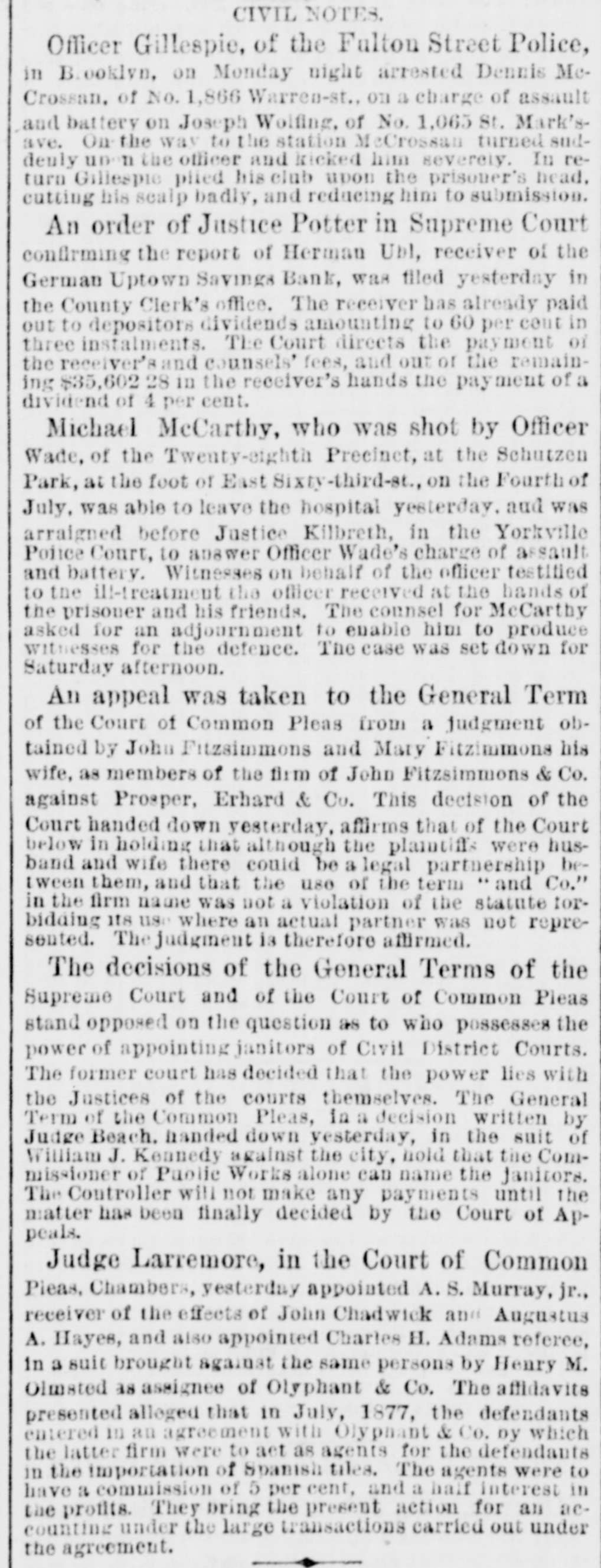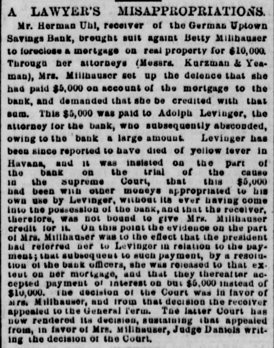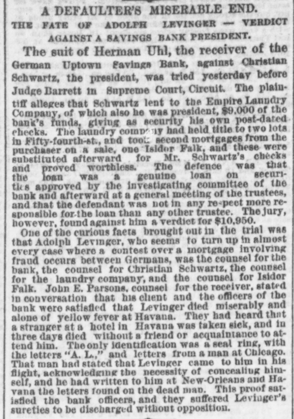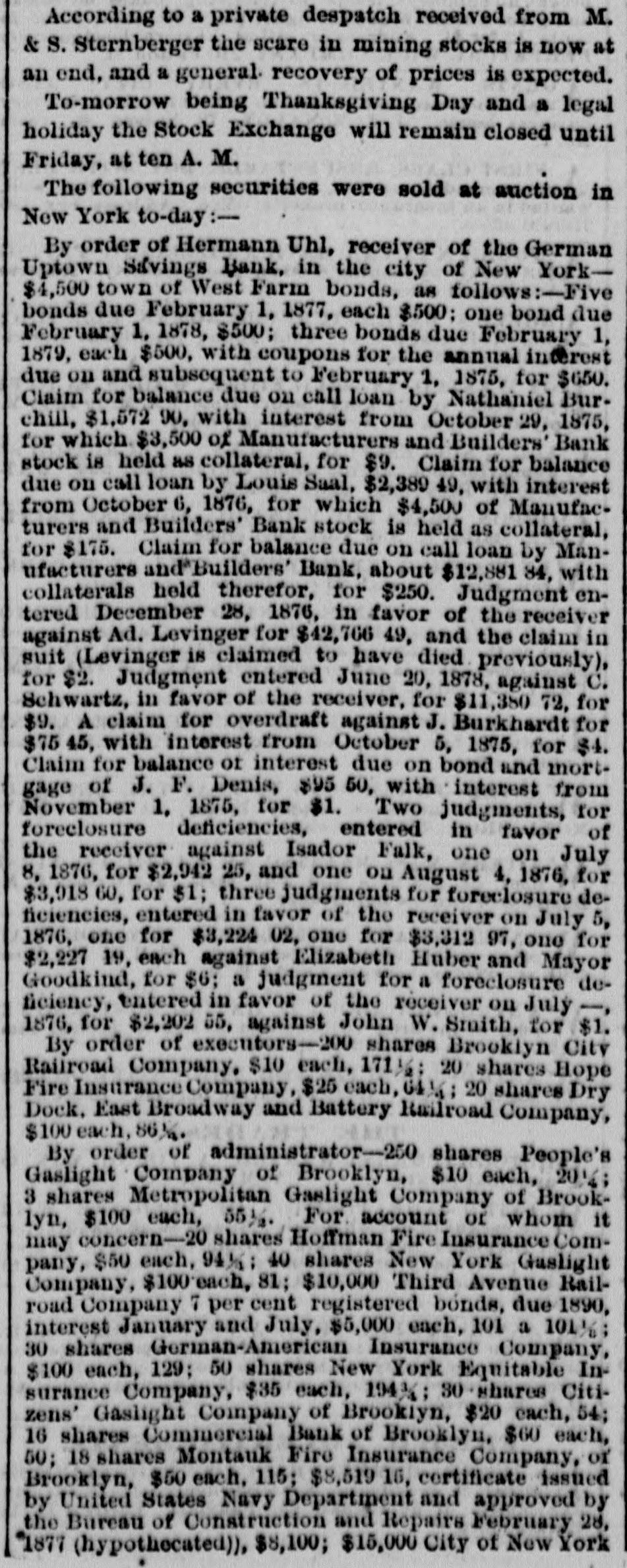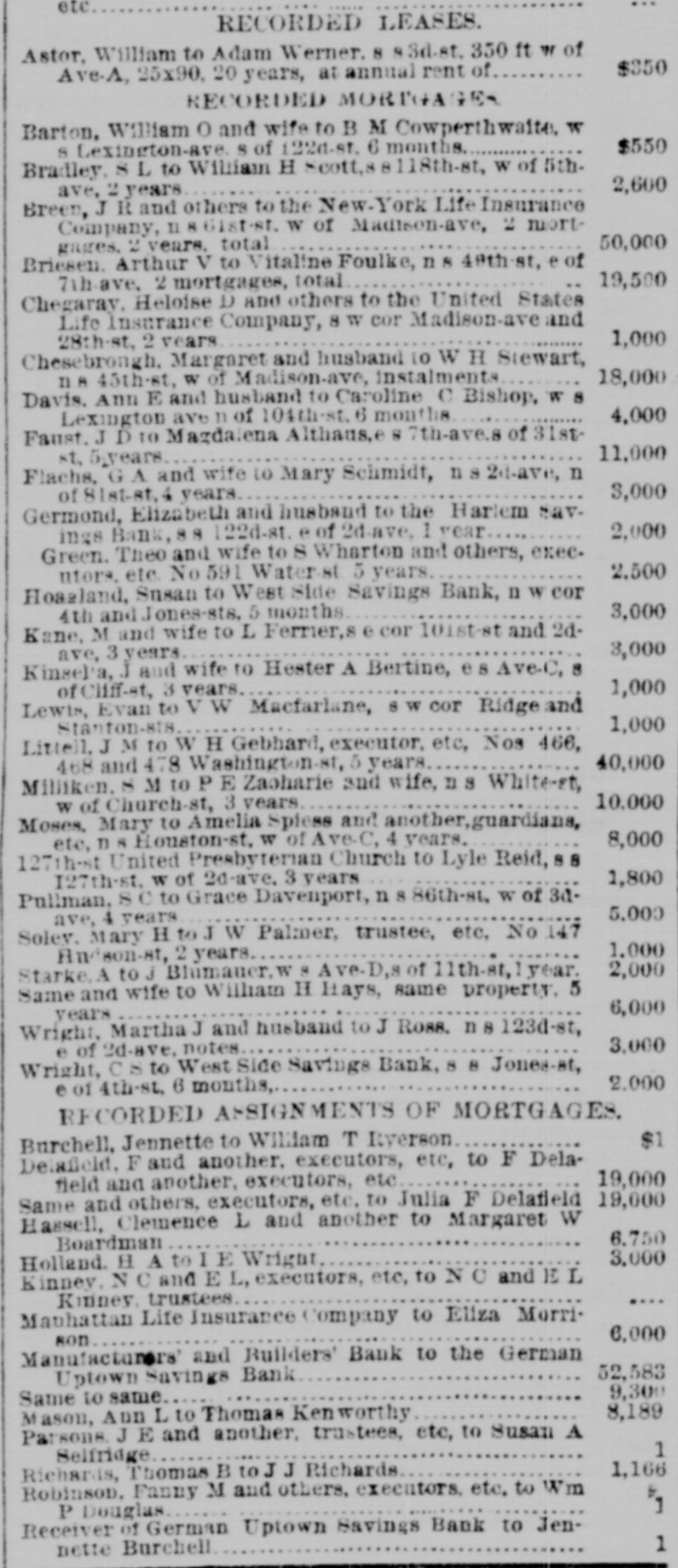 etc RECORDED LEASES. Astor, William to Adam Werner. 8 9 3d-st. 350 ft W of $850 Ave.A, 25x90. 20 years, at annual rent of RECORDED MORTGAGES Barton. William O and wife to B M Cowperthwaite, w $550 S Lexington-ave S of 122d-st. 6 months Bradley. 8 L to William H Scott, 118th-st, W of 5th2,600 ave, 2 years Breen, J R and others to the New. York Life Insurance Company, II 8 61st-st. W of Madison-ave, 2 mort. 50,000 gages. 2 years. total Briesen Arthur V to Vitaline Foulke, n 8 48th.st. e of 19,500 7th-ave, 2 mortgages, total Chegaray. Heloise D and others to the United States Life Insurance Company, 8 W cor Madison-ave and 1,000 28th-st. 2 years Chesebrough. Margaret and husband to W H Stewart, 18,000 n A 45th-st, W of Madison-ave, instalments Davis. Ann E and husband to Caroline C Bishop, W 8 4,000 Lexington ave 11 of 104th.st. 6 months Faust. J D TO Mazdalena Althaus,e 8 7th-ave.s of 31st11,000 st. 5-years Flachs, GA and wife to Mary Schmidt, 2d-ave, n 3,000 of 81st-st. 4 years Germond, Elizabeth and husband to the Harlem sav2,000 ings Bank, 88 122d-st. e of 2d-ave, 1 year Green. Theo and wife to S Wharton and others, exec. 2.500 utors, etc. No 591 Waterst 5 years Hoazland, Snsan to West Side Savings Bank, n W cor 3,000 4th and Jones-sts. 5 months Kane, M and wife to L Ferrier,s cor 101st-st and 2d3,000 ave, 3 years Kinsel'a, J and wife to Hester A Bertine, 08 Ave-C, 8 1,000 of Cliff-st, 3 years Lewis, Evan to V W Macfarlane, SW cor Ridge and 1,000 Stanton-sta Littell, J M to W H Gebhard, executor, etc, Nos 466, 40,000 468 and 478 Washington-st, 5 years Milliken. 8 M to P E Zaoharie and wife, ns White-et, 10.000 W of Church-st, 3 years Moses, Mary to Amelia Spless and another, guardians, 8,000 etc, n S Houston-st. w of Ave-C, 4 years. 127th-st United Presbyterian Church to Lyle Reid, 88 1,800 127th-st. W of 2d-ave. 3 years Pullman. SC to Grace Davenport, n 8 86th-st. W of 3d5.000 ave, 4 years Soley. Mary H to J W Palmer, trustee, etc. No 147 1.000 Audson-st, 2 years 2,000 Starke A to. Bhimaner, W 8 Ave-D,s of 11th-st,lyear. Same and wife to William H Hays, same property, 5 6,000 years Wright, Martha J and husband to J Ross. n 123d-st, 3.000 e of 2d-ave. notes Wright, CS to West Side Savings Bank, 8 8 Jones-st, 2.000 e of 4th-st. 6 months, RECORDED ASSIGNMENTS OF MORTGAGES $1 Burchell, Jennette to William T Iverson Delaicid, F and another. executors, etc, to F Dela19,000 field and another, executors, etc 19,000 Same and others, executors, etc. to Julia F Delafield Hassell, Clemence L and another to Margaret W 6.750 Boardman 3,000 Holland H A to IE Wright Kinney, NC and E L, executors, etc, to NO and E L Kinney trustees Manhattan Life Insurance company to Eliza Morri6,000 son Manufacturers' and Builders' Bank to the German 52,583 Uptown Savings Bank 9,300 Same to same 8,189 Mason, Aun L to Thomas Kenworthy Parsons J E and another. trustees, etc, to Susan A 1 Selfridge 1,166 Richards, Thomas B toJJ Richards Robinson. Fanny M and others. executors. etc. to Wm 1 P Douglas Receiver of German Uptown Savings Bank to Jen1 nette Burchell