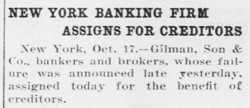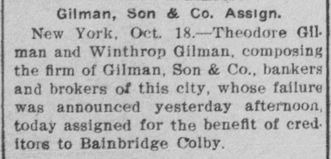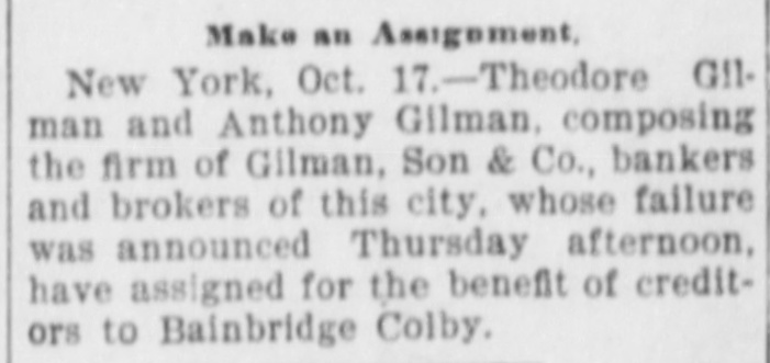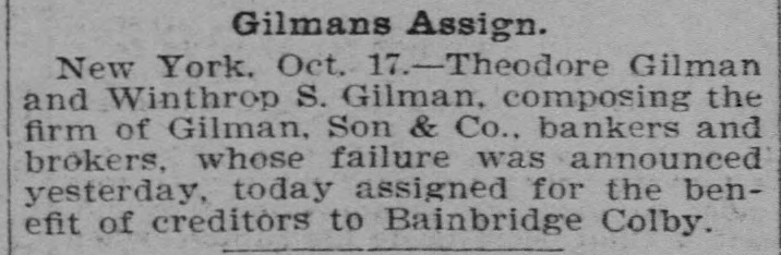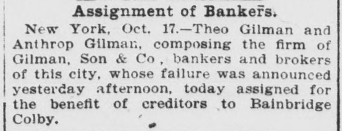 Assignment of Bankers. New York, Oct. 17.-Theo Gilman and Anthrop Gilman, composing the firm of Gilman, Son & Co , bankers and brokers of this city, whose failure was announced yesterday afternoon, today assigned for the benefit of creditors to Bainbridge Colby.