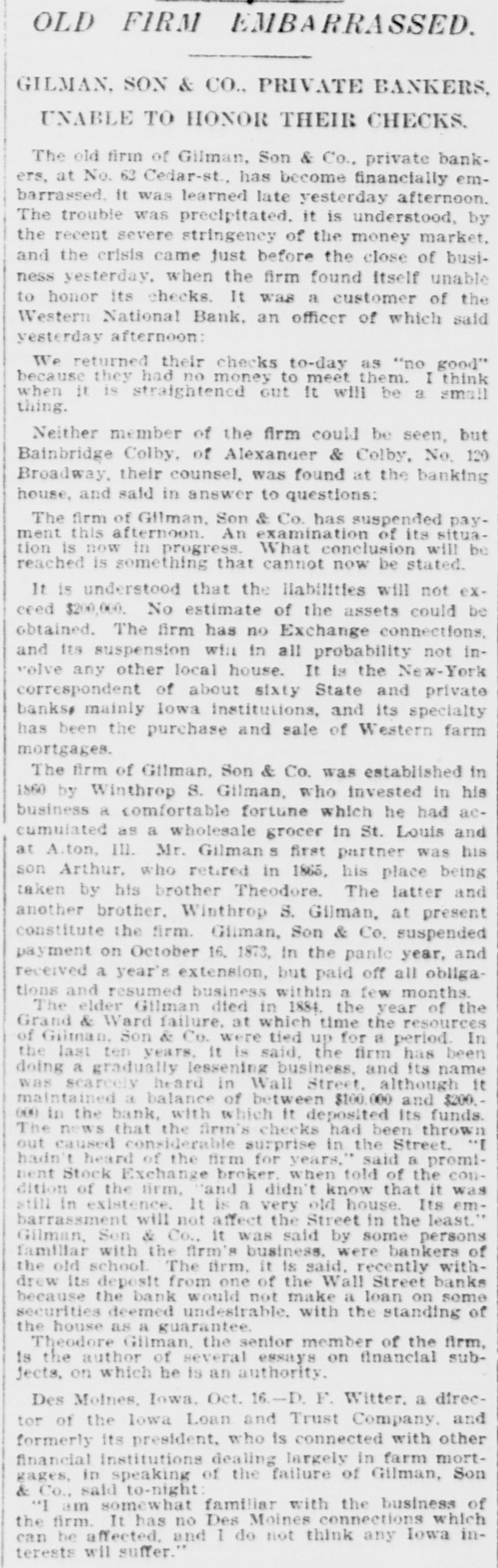 OLD FIRM EMBARRASSED GILMAN, SON & CO., PRIVATE BANKERS, UNABLE TO HONOR THEIR CHECKS. The old firm of Gilman, Son & Co., private bankers, at No. 63 Cedar-st. has become financially embarrassed. it was learned late yesterday afternoon. The trouble was precipitated. it is understood, by the recent severe stringency of the money market. and the erisis came just before the close of business yesterday, when the firm found itself unable to honor its checks. It was a customer of the Western National Bank, an officer of which said yesterday afternoon We returned their checks to-day as "no good" because they had no money to meet them. I think when it is straightened out It will be a small thing. Neither member of the firm could be seen, but Bainbridge Colby, of Alexander & Colby, No. 120 Broadway, their counsel, was found at the banking house, and said in answer to questions: The firm of Gilman, Son & Co. has suspended payment this afternoon. An examination of its situation is now in progress. What conclusion will be reached is something that cannot now be stated. It is understood that the liabilities will not exceed $200,000. No estimate of the assets could be obtained. The firm has no Exchange connections. and its suspension will in all probability not involve any other local house. It is the New-York correspondent of about sixty State and private banks mainly Iowa institutions, and its specialty has been the purchase and sale of Western farm mortgages. The firm of Gilman, Son & Co. was established in 1860 by Winthrop S. Gilman, who invested in his business a comfortable fortune which he had accumulated as a wholesale grocer in St. Louis and at A.ton. III. Mr. Gilman S first partner was his son Arthur, who retired in 1865, his place being taken by his brother Theodore. The latter and another brother. Winthrop S. Gilman, at present constitute the firm. Gliman, Son & Co. suspended payment on October 16. 1873, in the pante year, and received a year's extension, but paid off all obligations and resumed business within a few months. The elder Gilman died in 1884. the year of the Grand & Ward failure, at which time the resources of Gilman. Son & Co. were tied up for a period. In the last ten years. it is said, the firm has been doing a gradually lessening business, and its name was scareely heard in Wall Street, although It maintained a balance of between $100.000 and $200.000 in the bank, with which it deposited Its funds. The news that the firm's checks had been thrown out caused considerable surprise in the Street. "I hadn't heard of the firm for years," said a prominent Stock Exchange broker. when told of the condition of the firm, and I didn't know that it was still in existence. It is a very old house. Its embarrassment will not affect the Street in the least." Gilman, Son & Co., It was said by some persons familiar with the firm's business. were bankers of the old school The firm. it is said, recently withdrew its deposit from one of the Wall Street banks because the bank would not make a loan on some securities deemed undestrable, with the standing of the house as a guarantee. Theodore Gilman, the senfor member of the firm, is the author of several essays on financial subjects, on which he is an authority. Des Moines, Iowa. Oct. 16.-D. F. Witter. a director of the Iowa Loan and Trust Company and formerly its president, who is connected with other financial institutions dealing largely in farm mortgages, in speaking of the failure of Gilman, Son & Co., said to-night "I am somewhat familiar with the business of the firm. It has no Des Moines connections which can be affected. and I do not think any Iowa interests will suffer."