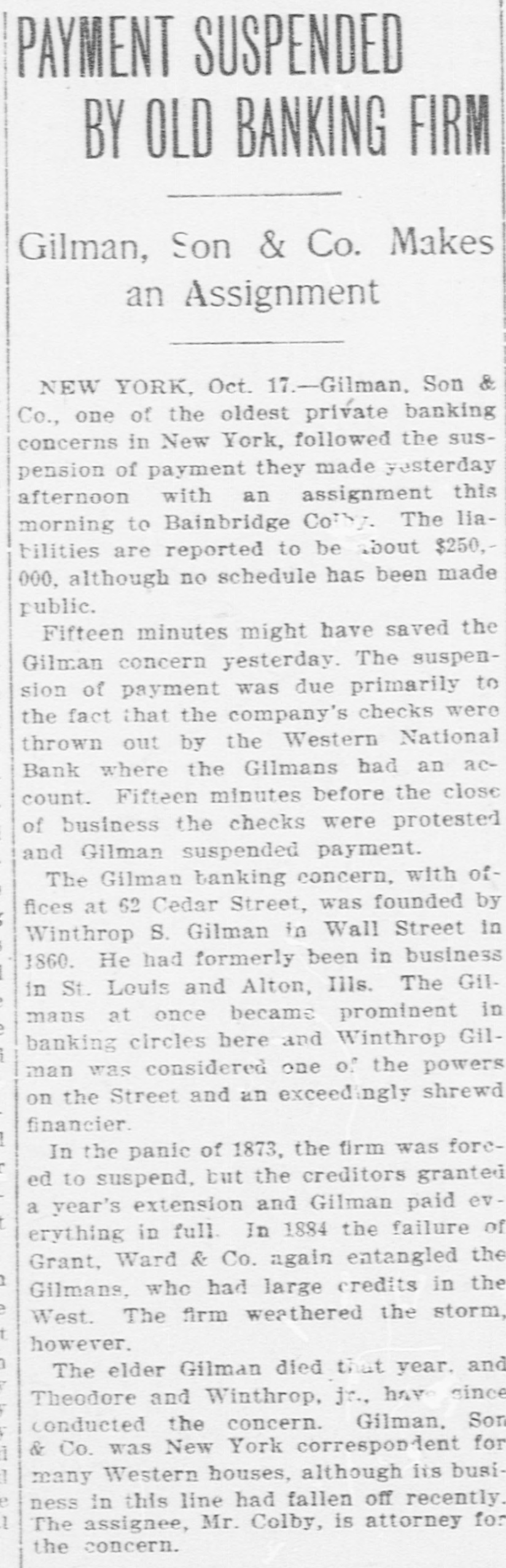 PAYMENT SUSPENDED BY OLD BANKING FIRM Gilman, Son & Co. Makes an Assignment NEW YORK, Oct. 17.-Gilman. Son & Co., one of the oldest private banking concerns in New York, followed the suspension of payment they made yesterday afternoon with an assignment this morning to Bainbridge Colby. The liabilities are reported to be about $250,000, although no schedule has been made public. Fifteen minutes might have saved the Gilman concern yesterday. The suspension of payment was due primarily to the fact that the company's checks were thrown out by the Western National Bank where the Gilmans had an account. Fifteen minutes before the close of business the checks were protested and Gilman suspended payment. The Gilman banking concern, with offices at 62 Cedar Street, was founded by Winthrop S. Gilman in Wall Street in 1860. He had formerly been in business in St. Louis and Alton, Ills. The GIImans at once became prominent in banking circles here and Winthrop Gilman was considered one of the powers on the Street and an exceedingly shrewd financier. In the panic of 1873, the firm was foreed to suspend, but the creditors granted a year's extension and Gilman paid everything in full. In 1884 the failure of Grant, Ward & Co. again entangled the Gilmans, who had large credits in the West. The firm weathered the storm, however. The elder Gilman died that year. and Theodore and Winthrop, jr., have since conducted the concern. Gilman, Son & Co. was New York correspondent for many Western houses, although its business in this line had fallen off recently. The assignee, Mr. Colby, is attorney for the concern.