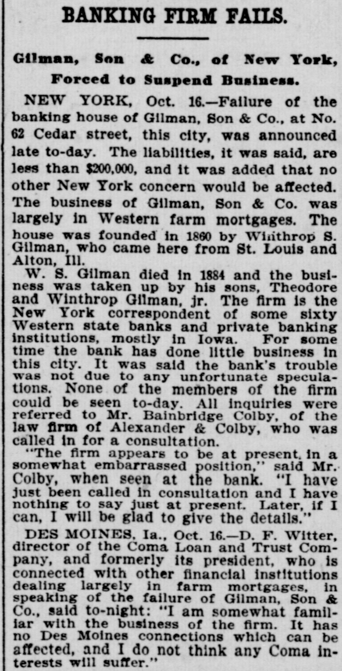 BANKING FIRM FAILS. Gilman, Son & Co., of New York, Forced to Suspend Business. NEW YORK, Oct. 16.-Failure of the banking house of Gilman, Son & Co., at No. 62 Cedar street, this city, was announced late to-day. The liabilities, it was said, are less than $200,000, and it was added that no other New York concern would be affected. The business of Gilman, Son & Co. was largely in Western farm mortgages. The house was founded in 1860 by Whithrop S. Gilman, who came here from St. Louis and Alton, Ill. W. S. Gilman died in 1884 and the business was taken up by his sons, Theodore and Winthrop Gilman, jr. The firm is the New York correspondent of some sixty Western state banks and private banking institutions, mostly in Iowa. For some time the bank has done little business in this city. It was said the bank's trouble was not due to any unfortunate speculations. None of the members of the firm could be seen to-day. All inquiries were referred to Mr. Bainbridge Colby, of the law firm of Alexander & Colby, who was called in for a consultation. "The firm appears to be at present, in a somewhat embarrassed position," said Mr. Colby, when seen at the bank. "I have just been called in consultation and I have nothing to say just at present. Later, if I can, I will be glad to give the details." DES MOINES, Ia., Oct. 16.-D. F. Witter, director of the Coma Loan and Trust Company, and formerly its president, who is connected with other financial institutions dealing largely in farm mortgages, in speaking of the failure of Gilman, Son & Co., said to-night: "I am somewhat familiar with the business of the firm. It has no Des Moines connections which can be affected, and I do not think any Coma interests will suffer."