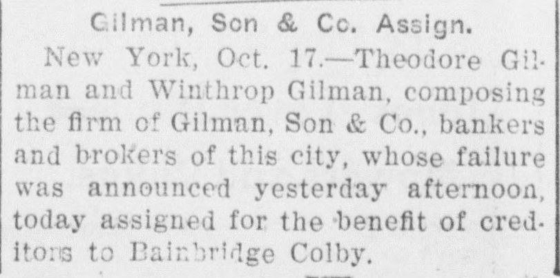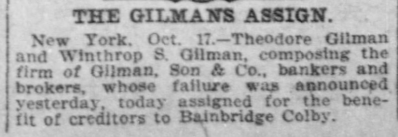 Gilman, Son & Co. Assign. New York, Oct. 17.-Theodore Gilman and Winthrop Gilman, composing the firm of Gilman, Son & Co., bankers and brokers of this city, whose failure was announced yesterday afternoon, today assigned for the benefit of creditons to Bainbridge Colby.
