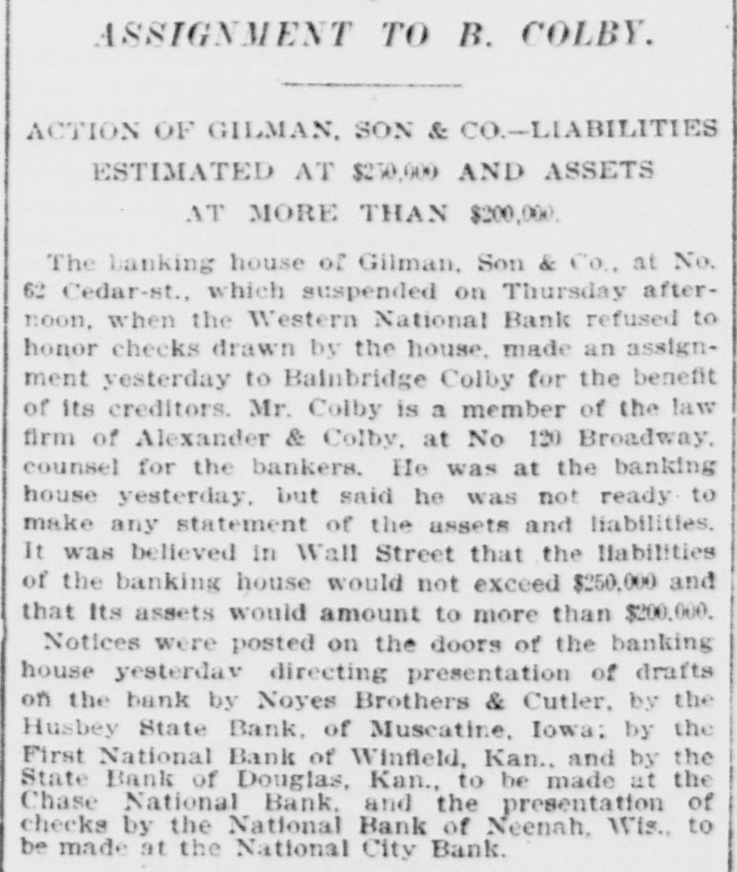 ASSIGNMENT TO B. COLBY. ACTION OF GILMAN, SON & CO.-LIABILITIES ESTIMATED AT $230,000 AND ASSETS AT MORE THAN $200,000. The banking house of Gilman, Son & Co., at No. 62 Cedar-st. which suspended on Thursday afternoon, when the Western National Bank refused to honor checks drawn by the house. made an assignment yesterday to Bainbridge Colby for the benefit of its creditors. Mr. Colby is a member of the law firm of Alexander & Colby, at No 120 Broadway, counsel for the bankers. He was at the banking house yesterday, but said he was not ready to make any statement of the assets and liabilities. It was believed in Wall Street that the liabilities of the banking house would not exceed $250,000 and that Its assets would amount to more than $200,000. Notices were posted on the doors of the banking house yesterday directing presentation of drafts on the bank by Noyes Brothers & Cutler, by the Husbey State Bank, of Muscatine, Iowa: by the First National Bank of Winfield, Kan., and by the State Bank of Douglas, Kan., to be made at the Chase National Bank, and the presentation of checks by the National Bank of Neenah, Wis., to be made at the National City Bank.