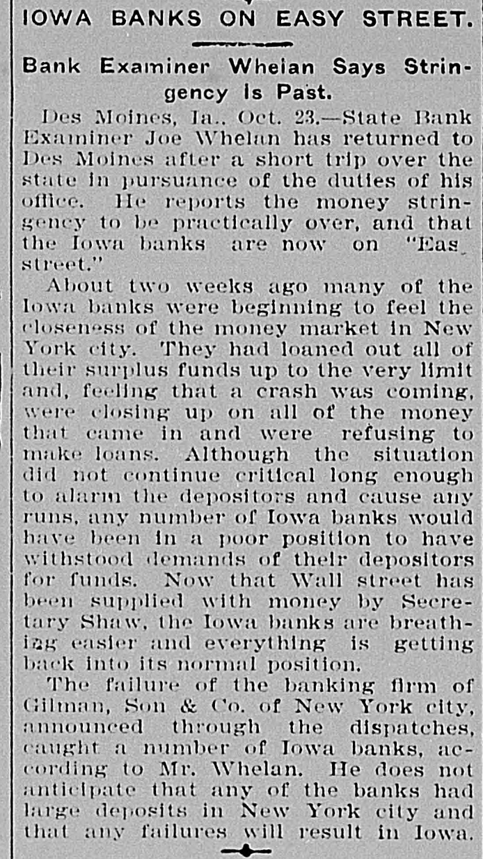 IOWA BANKS ON EASY STREET. Bank Examiner Wheian Says Stringency is Past. Des Moines, Ia.. Oct. 23.-State Bank Examiner Joe Whelan has returned to Des Moines after a short trip over the state in pursuance of the duties of his office. He reports the money stringency to be practically over, and that the Iowa banks are now on "Eas street." About two weeks ago many of the Iowa banks were beginning to feel the closeness of the money market in New York city. They had loaned out all of their surplus funds up to the very limit and, feeling that a crash was coming, were closing up on all of the money that came in and were refusing to make loans. Although the situation did not continue critical long enough to alarm the depositors and cause any runs, any number of Iowa banks would have been in a poor position to have withstood demands of their depositors for funds. Now that Wall street has been supplied with money by Secretary Shaw, the Iowa banks are breathlag easier and everything is getting back into its normal position. The failure of the banking firm of Gilman, Son & Co. of New York city, announced through the dispatches, caught a number of Iowa banks, according to Mr. Whelan. He does not anticipate that any of the banks had large deposits in New York city and that any failures will result in Iowa.