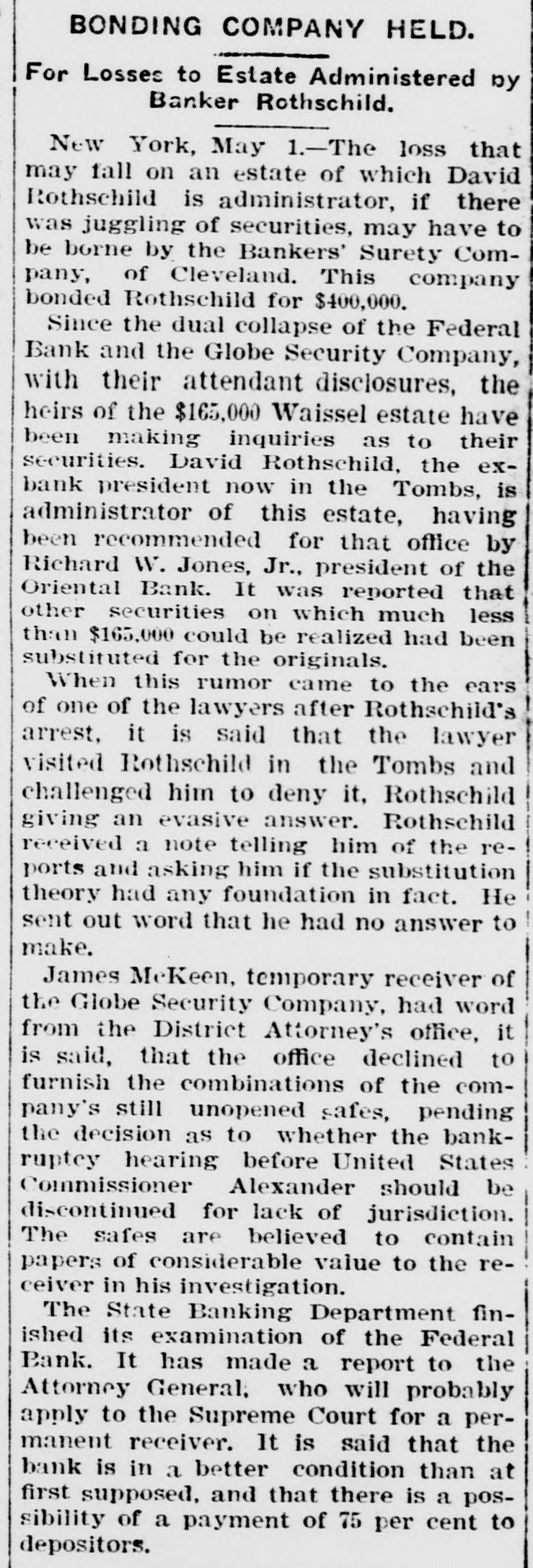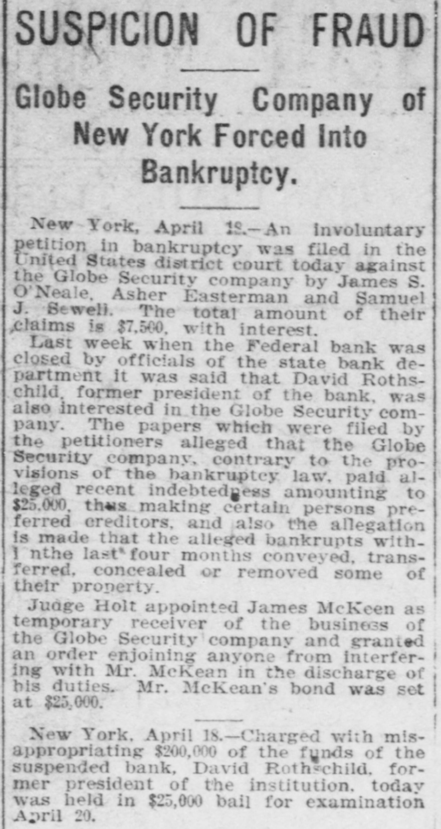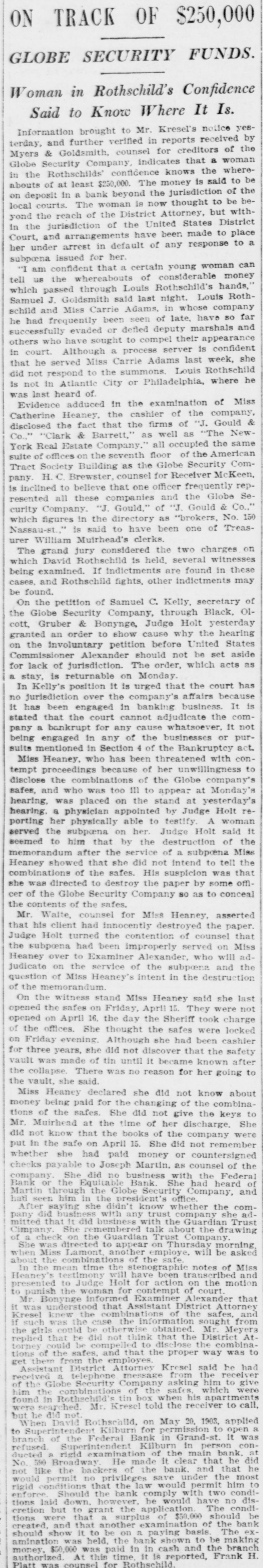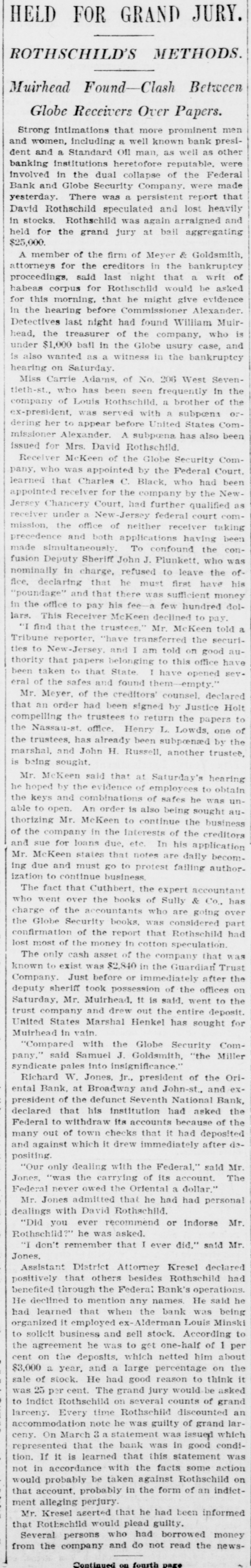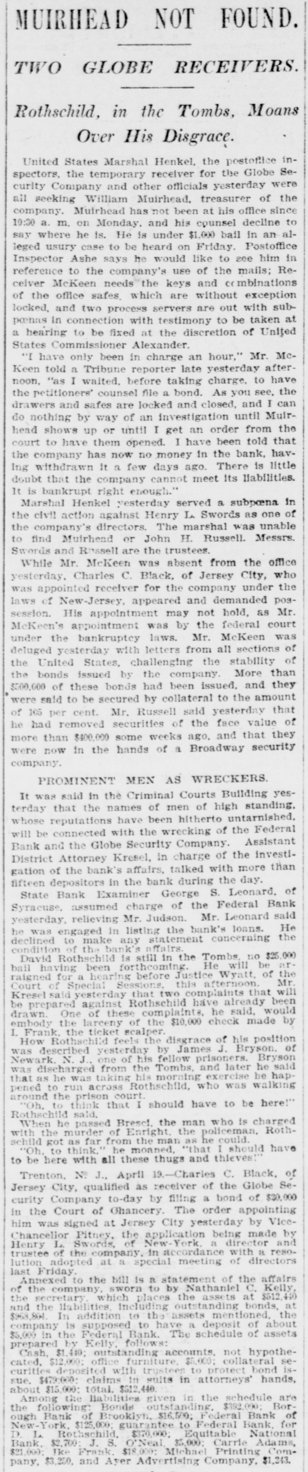 MUIRHEAD NOT FOUND. TWO GLOBE RECEIVERS. Rothschild, in the Tombs, Moans Over His Disgrace. United States Marshal Henkel, the postoffice inspectors, the temporary receiver for the Globe Security Company and other officials yesterday were all seeking William Muirhead, treasurer of the company. Muirhead has not been at his office since 10:30 a. m. on Monday. and his counsel decline to say where he is. He is under $1.000 bail in an alleged usury case to be heard on Friday. Postoffice Inspector Ashe says he would like to see him in reference to the company's use of the mails; Receiver McKeen needs the keys and ombinations of the office safes. which are without exception locked. and two process servers are out with subpoenas in connection with testimony to be taken at a hearing to be fixed at the discretion of United States Commissioner Alexander. "I have only been in charge an hour," Mr. McKeen told a Tribune reporter late yesterday afternoon, "as I waited, before taking charge. to have the petitioners' counsel file a bond. As you see, the drawers and safes are locked and closed, and I can do nothing by way of an investigation until Muirhead shows up or until I get an order from the court to have them opened. I have been told that the company has now no money in the bank, having withdrawn It a few days ago. There is little doubt that the company cannot meet Its liabilities. It is bankrupt right enough." Marshal Henkel yesterday served a subpoena in the civil action against Henry L. Swords as one of the company's directors. The marshal was unable to find Muirhead or John H. Russell. Messrs. Swords and Russell are the trustees. While Mr. McKeen was absent from the office yesterday, Charles C. Black, of Jersey City, who was appointed receiver for the company under the laws of New-Jersey, appeared and demanded possession. His appointment may not hold, as Mr. McKeen's appointment was by the federal court under the bankruptcy laws. Mr. McKeen was deluged yesterday with letters from all sections of the United States, challenging the stability of the bonds issued by the company. More than $500.000 of these bonds had been issued, and they were said to be secured by collateral to the amount of 105 per cent. Mr. Russell said yesterday that he had removed securities of the face value of more than $400,000 some weeks ago, and that they were now in the hands of a Broadway security company. PROMINENT MEN AS WRECKERS. It was said in the Criminal Courts Building yesterday that the names of men of high standing, whose reputations have been hitherto untarnished, will be connected with the wrecking of the Federal Bank and the Globe Security Company. Assistant District Attorney Kresel, in charge of the investigation of the bank's affairs, talked with more than fifteen depositors in the bank during the day. State Bank Examiner George S. Leonard. of Syracuse, assumed charge of the Federal Bank yesterday, relieving Mr. Judson. Mr. Leonard said he was engaged in listing the bank's loans. He declined to make any statement concerning the condition of the bank's affairs. David Rothschild is still in the Tombs, no $25,000 bail having been forthcoming. He will be arraigned for a hearing before Justice Wyatt, of the Court of Special Sessions, this afternoon. Mr. Kresel said yesterday that two complaints that will be prepared against Rothschild have already been drawn. One of these complaints, he said, would embody the larceny of the $10,000 check made by I. Frank the ticket scalper. How Rothschild feels the disgrace of his position was described yesterday by James J. Bryson. of Newark. N. J., one of his fellow prisoners. Bryson was discharged from the Tombs, and later he said that as he was taking his morning exercise be happened to run across Rothschild, who was walking around the prison court. "Oh, to think that I should have to be here!" Rothschild sald. When he passed Bresci, the man who is charged with the murder of Enright, the policeman, Rothschild got as far from the man as he could. "Oh, to think." he moaned, "that I should have to be here with all these thugs and thleves!" Trenton, N. J., April 19.-Charles C. Black, of Jersey City, qualified as receiver of the Globe Security Company to-day by filing a bond of $20,000 in the Court of Ghancery. The order appointing him was signed at Jersey City yesterday by ViceChancellor Pitney, the application being made by Henry L. Swords, of New-York a director and trustee of the company, in accordance with a resolution adopted at a special meeting of directors last Friday. Annexed to the bill is a statement of the affairs of the company, sworn to by Nathaniel C. Kelly, the secretary which places the assets at $512,440 and the liabilities including outstanding bonds, at $968,804 In addition to the assets mentioned, the company is supposed to have a deposit of about $5,000 in the Federal Bank. The schedule of assets prepared by Kelly, follows: Cash, $1,440; outstanding accounts, not hypothecated, $12,000; office furniture. $5,000; collateral securities deposited with trustees to protect bond issue. $479,000 claims in suits in attorneys' hands, about $15,000: total. $512,440 Among the liabilities given in the schedule are the following: Bonds outstanding, $392,000; Borough Bank of Brooklyn, $16,500; Federal Bank of New-York. $125,000 guarantee to Federal Bank, for D. L. Rethschild, $370,000; Equitable National Bank, $2,700 J. S. O'Neal $5,000; Carrie Adams, $21,000: Ike Frank. $18,000: Michael Printing Com-
