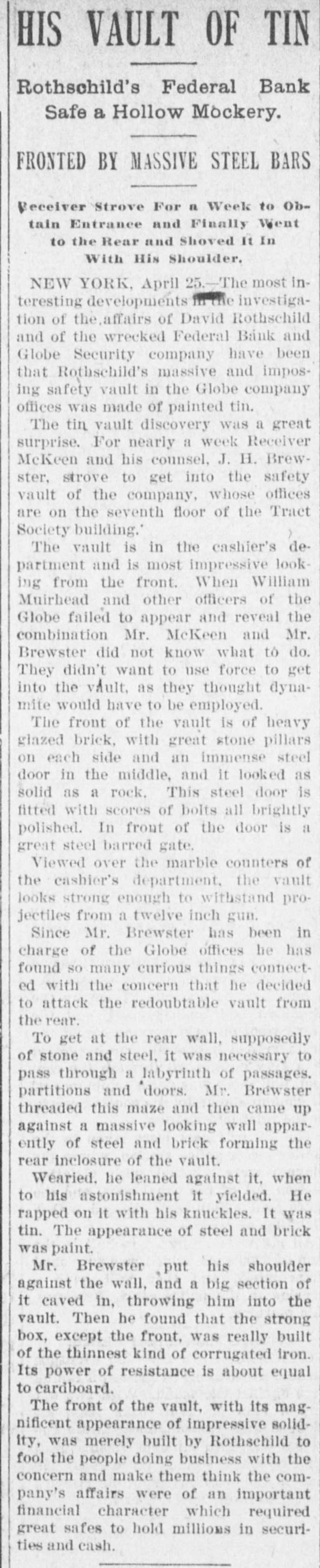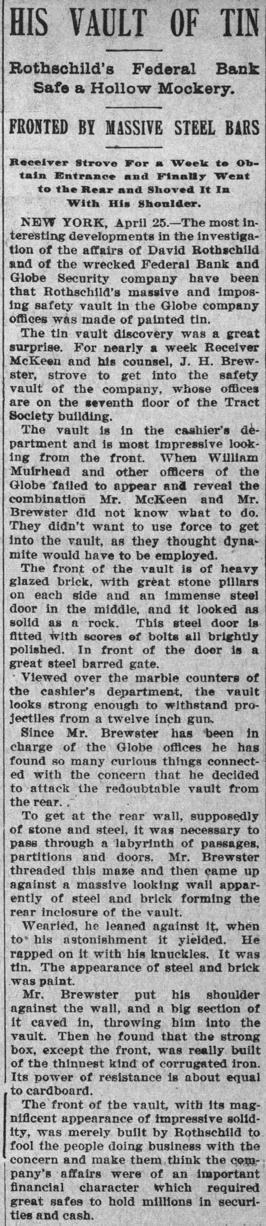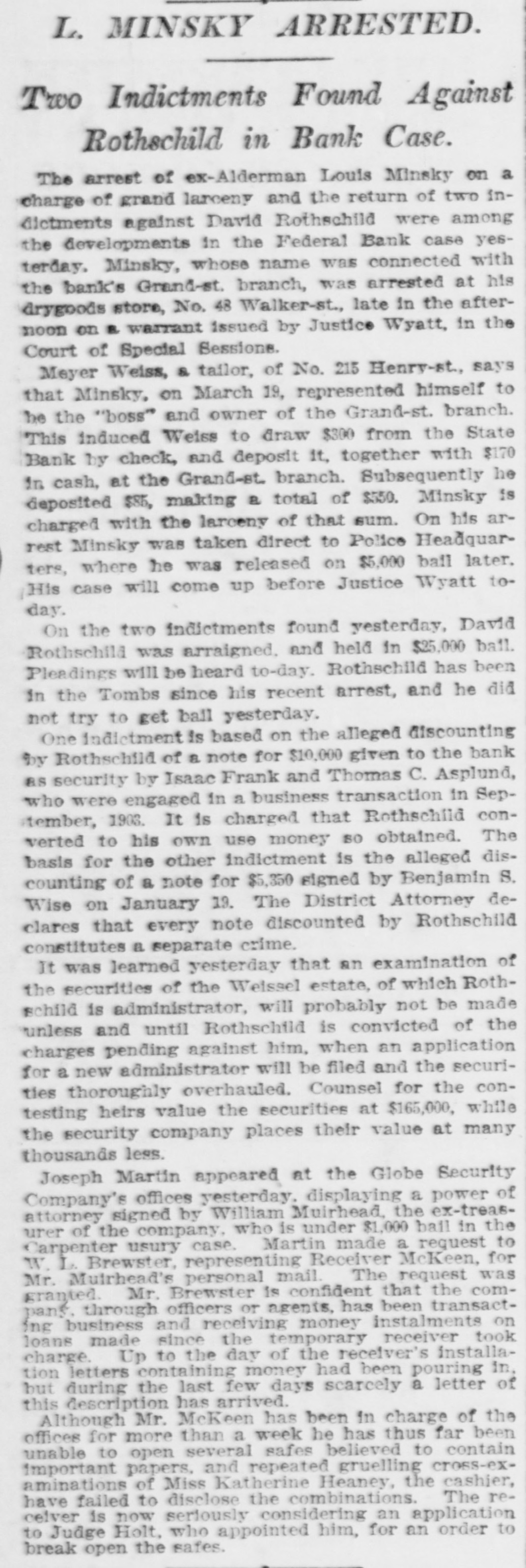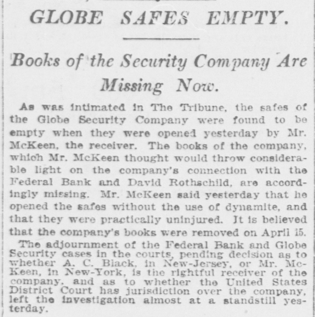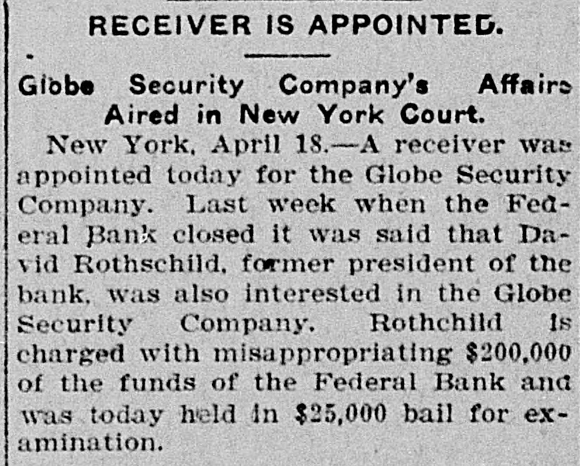MUIRHEAD NOT FOUND. TWO GLOBE RECEIVERS. Rothschild, in the Tombs, Moans Over His Disgrace. United States Marshal Henkel, the postoffice inspectors, the temporary receiver for the Globe Security Company and other officials yesterday were all seeking William Muirhead, treasurer of the company. Muirhead has not been at his office since 10:30 a. m. on Monday. and his counsel decline to say where he is. He is under $1.000 bail in an alleged usury case to be heard on Friday. Postoffice Inspector Ashe says he would like to see him in reference to the company's use of the mails; Receiver McKeen needs the keys and ombinations of the office safes. which are without exception locked. and two process servers are out with subpoenas in connection with testimony to be taken at a hearing to be fixed at the discretion of United States Commissioner Alexander. "I have only been in charge an hour," Mr. McKeen told a Tribune reporter late yesterday afternoon, "as I waited, before taking charge. to have the petitioners' counsel file a bond. As you see, the drawers and safes are locked and closed, and I can do nothing by way of an investigation until Muirhead shows up or until I get an order from the court to have them opened. I have been told that the company has now no money in the bank, having withdrawn It a few days ago. There is little doubt that the company cannot meet Its liabilities. It is bankrupt right enough." Marshal Henkel yesterday served a subpoena in the civil action against Henry L. Swords as one of the company's directors. The marshal was unable to find Muirhead or John H. Russell. Messrs. Swords and Russell are the trustees. While Mr. McKeen was absent from the office yesterday, Charles C. Black, of Jersey City, who was appointed receiver for the company under the laws of New-Jersey, appeared and demanded possession. His appointment may not hold, as Mr. McKeen's appointment was by the federal court under the bankruptcy laws. Mr. McKeen was deluged yesterday with letters from all sections of the United States, challenging the stability of the bonds issued by the company. More than $500.000 of these bonds had been issued, and they were said to be secured by collateral to the amount of 105 per cent. Mr. Russell said yesterday that he had removed securities of the face value of more than $400,000 some weeks ago, and that they were now in the hands of a Broadway security company. PROMINENT MEN AS WRECKERS. It was said in the Criminal Courts Building yesterday that the names of men of high standing, whose reputations have been hitherto untarnished, will be connected with the wrecking of the Federal Bank and the Globe Security Company. Assistant District Attorney Kresel, in charge of the investigation of the bank's affairs, talked with more than fifteen depositors in the bank during the day. State Bank Examiner George S. Leonard. of Syracuse, assumed charge of the Federal Bank yesterday, relieving Mr. Judson. Mr. Leonard said he was engaged in listing the bank's loans. He declined to make any statement concerning the condition of the bank's affairs. David Rothschild is still in the Tombs, no $25,000 bail having been forthcoming. He will be arraigned for a hearing before Justice Wyatt, of the Court of Special Sessions, this afternoon. Mr. Kresel said yesterday that two complaints that will be prepared against Rothschild have already been drawn. One of these complaints, he said, would embody the larceny of the $10,000 check made by I. Frank the ticket scalper. How Rothschild feels the disgrace of his position was described yesterday by James J. Bryson. of Newark. N. J., one of his fellow prisoners. Bryson was discharged from the Tombs, and later he said that as he was taking his morning exercise be happened to run across Rothschild, who was walking around the prison court. "Oh, to think that I should have to be here!" Rothschild sald. When he passed Bresci, the man who is charged with the murder of Enright, the policeman, Rothschild got as far from the man as he could. "Oh, to think." he moaned, "that I should have to be here with all these thugs and thleves!" Trenton, N. J., April 19.-Charles C. Black, of Jersey City, qualified as receiver of the Globe Security Company to-day by filing a bond of $20,000 in the Court of Ghancery. The order appointing him was signed at Jersey City yesterday by ViceChancellor Pitney, the application being made by Henry L. Swords, of New-York a director and trustee of the company, in accordance with a resolution adopted at a special meeting of directors last Friday. Annexed to the bill is a statement of the affairs of the company, sworn to by Nathaniel C. Kelly, the secretary which places the assets at $512,440 and the liabilities including outstanding bonds, at $968,804 In addition to the assets mentioned, the company is supposed to have a deposit of about $5,000 in the Federal Bank. The schedule of assets prepared by Kelly, follows: Cash, $1,440; outstanding accounts, not hypothecated, $12,000; office furniture. $5,000; collateral securities deposited with trustees to protect bond issue. $479,000 claims in suits in attorneys' hands, about $15,000: total. $512,440 Among the liabilities given in the schedule are the following: Bonds outstanding, $392,000; Borough Bank of Brooklyn, $16,500; Federal Bank of New-York. $125,000 guarantee to Federal Bank, for D. L. Rethschild, $370,000; Equitable National Bank, $2,700 J. S. O'Neal $5,000; Carrie Adams, $21,000: Ike Frank. $18,000: Michael Printing Com-