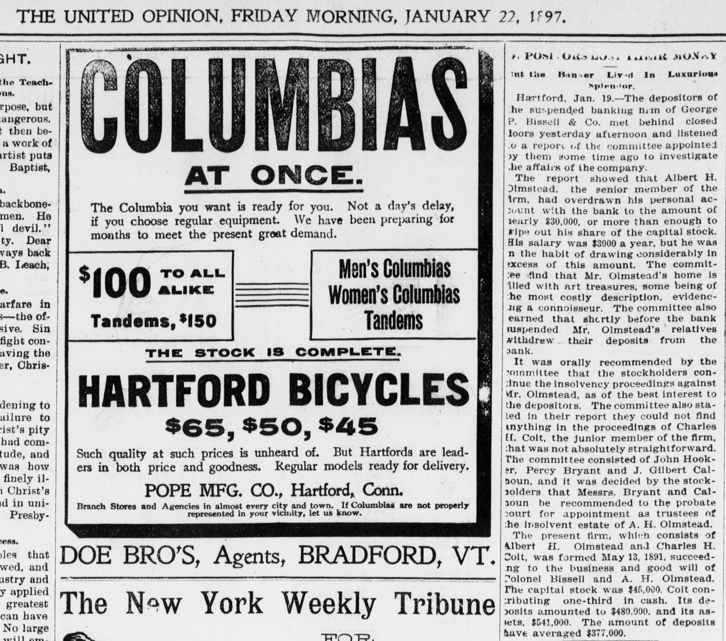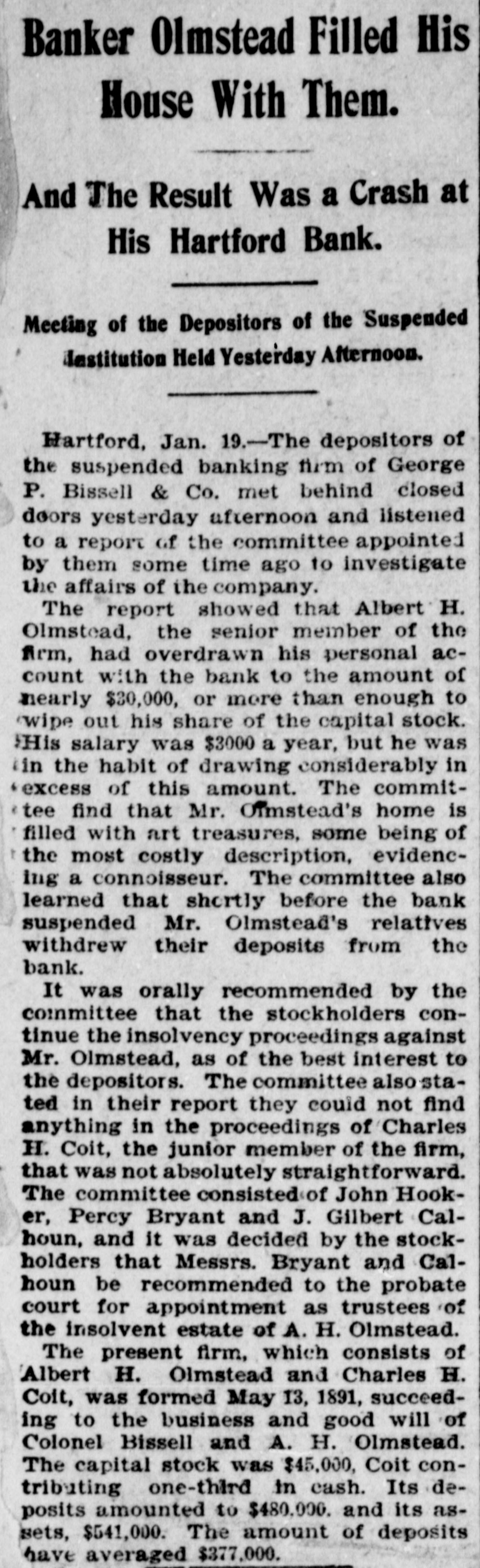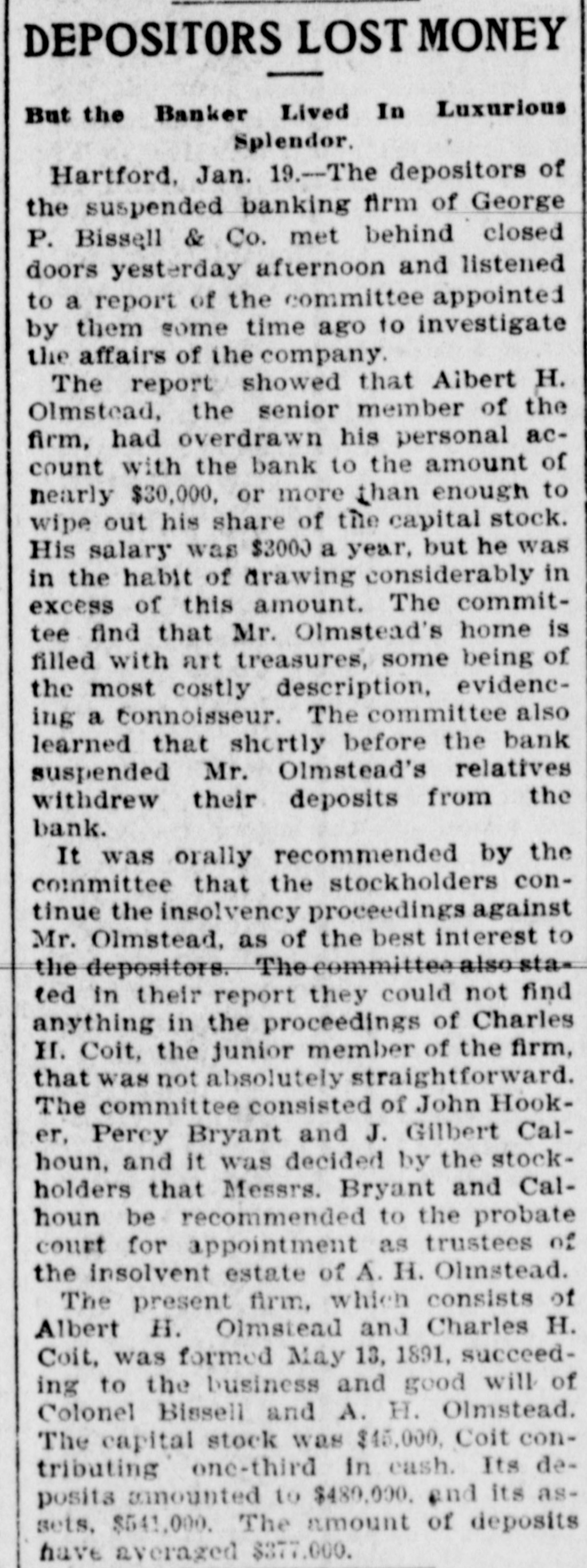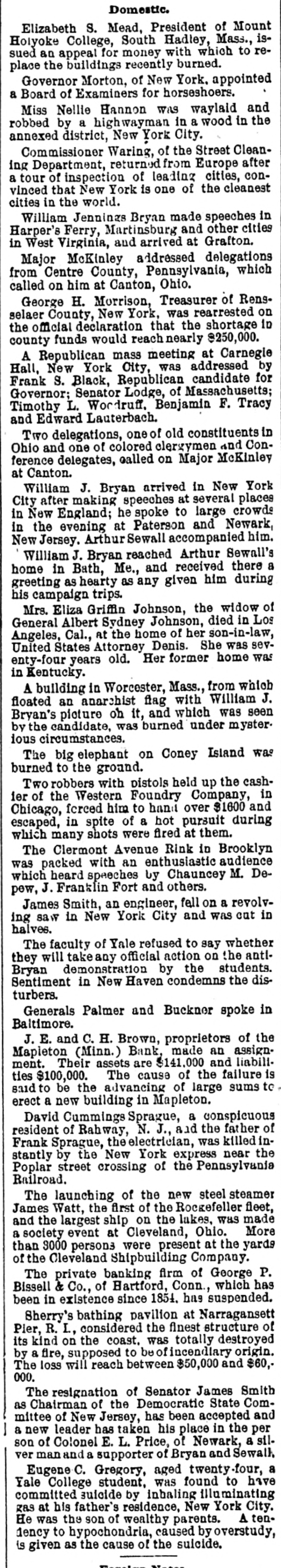 Domestic. Elizabeth S. Mead, President of Mount Holyoke College, South Hadley, Mass., issued an appeal for money with which to replace the buildings recently burned. Governor Morton, of New York. appointed a Board of Examiners for horseshoers. Miss Nellie Hannon was waylaid and robbed by a highwayman in a wood in the annexed district, New York City. Commissioner Waring, of the Street Cleaning Department, returned from Europe after a tour of inspection of leading cities, convinced that New York is one of the cleanest cities in the world. William Jennings Bryan made speeches in Harper's Ferry, Martinsburg and other cities in West Virginia, and arrived at Grafton. Major McKinley addressed delegations from Centre County, Pennsylvania, which called on him at Canton, Ohio. George H. Morrison, Treasurer of Rensselaer County, New York, was rearrested on the official declaration that the shortage in county funds would reach nearly $250,000. A Republican mass meeting at Carnegie Hall, New York City, was addressed by Frank S. Black, Republican candidate for Governor; Senator Lodge, of Massachusetts; Timothy L. Woodruff. Benjamin F. Tracy and Edward Lauterbach. Two delegations, one of old constituents in Ohio and one of colored clergymen and Conference delegates, called on Major McKinley at Canton. William J. Bryan arrived in New York City after making speeches at several places in New England; he spoke to large crowds in the evening at Paterson and Newark, New Jersey. Arthur Sewall accompanied him. William J. Bryan reached Arthur Sewall's home in Bath, Me., and received there a greeting as hearty as any given him during his campaign trips. Mrs. Eliza Griffin Johnson, the widow of General Albert Sydney Johnson, died in Los Angeles, Cal., at the home of her son-in-law, United States Attorney Denis. She was seventy-four years old. Her former home was in Kentucky. A building in Worcester, Mass., from which floated an anarchist flag with William J. Bryan's picture oh it, and which was seen by the candidate, was burned under mysterious circumstances. The big elephant on Coney Island was burned to the ground. Two robbers with pistols held up the cashier of the Western Foundry Company, in Chicago, forced him to hand over $1600 and escaped, in spite of a hot pursuit during which many shots were fired at them. The Clermont Avenue Rink in Brooklyn was packed with an enthusiastic audience which heard speeches by Chauncey M. Depew, J. Franklin Fort and others. James Smith, an engineer, fall on a revolving saw in New York City and was cut in halves. The faculty of Yale refused to say whether they will takeany official action on the antiBryan demonstration by the students. Sentiment in New Haven condemns the disturbers. Generals Palmer and Buckner spoke in Baltimore. J. E. and C. H. Brown, proprietors of the Mapleton (Minn.) Bank, made an assignment. Their assets are $141,000 and liabilities $100,000. The cause of the failure is said to be the advancing of large sums to erect a new building in Mapleton. David Cummings Sprague, a conspicuous resident of Rahway, N. J., and the father of Frank Sprague, the electrician, was killed instantly by the New York express near the Poplar street crossing of the Pennsylvania Railroad. The launching of the new steel steamer James Watt, the first of the Rockefeller fleet, and the largest ship on the lakes, was made a society event at Cleveland, Ohio. More than 3000 persons were present at the yards of the Cleveland Shipbuilding Company. The private banking firm of George P. Bissell & Co., of Hartford, Conn., which has been in existence since 1854. has suspended. Sherry's bathing pavilion at Narragansett Pier, R. L, considered the finest structure of its kind on the coast. was totally destroyed by a fire, supposed to be of incendiary origin. The loss will reach between $50,000 and $60,000. The resignation of Senator James Smith as Chairman of the Democratic State Committee of New Jersey, has been accepted and a new leader has taken his place in the per son of Colonel E. L. Price, of Newark, a silver man and a supporter of Bryan and Sewall. Eugene C. Gregory, aged twenty-four, a Yale College student, was found to have committed suicide by inhaling illuminating gas at his father's residence, New York City. He was the son of wealthy parents. A tendency to hypochondria, caused by overstudy, is given as the cause of the suicide.
