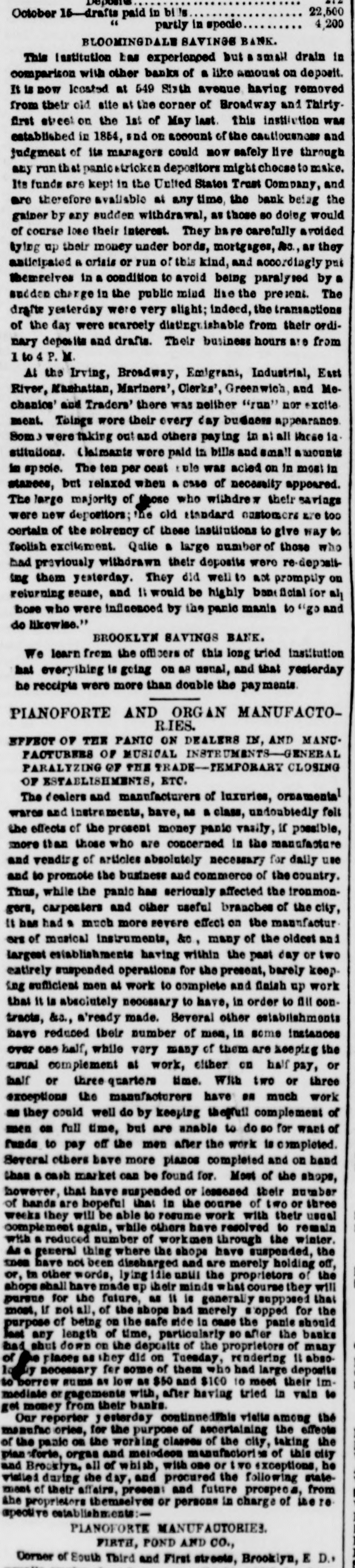 gold on deposit, not more than $10,000. Several pas. ple came for their specie in the morning. The besiness generally was more healthy than it has been for come days past. DRY-DOCK BANK. All is perfectly quiet at this institution, and it con Linues, for the present, to meet all demands against in gold. EAST RIVER BANK. The excitement which was manifested about this bank when it first suspended specie payments appears to have subsided; but the officers decline giving my information relative to the affairs of the institution. FULTON BANK. This bank is doing business as usual, specio ments alone being suspended. Before refuing spocia, pay. they had paid out $60,000 in gold to depositors, have $122,000 left. They did not refuse specionalM ME Wednesday morning. Several small specie deposits were made yesterday morning, and before the bank closed & large amount of gold had been deposited One house put in over $6,000. There seems to be a very general impression that business improve. The bank paid to the Clearing-House in the morning $16,000 in gold. In cases where billholders required small sums of specie they were cheerfully accomme! dated. Where it was evident that the gold was wanted for brokers and speculators, it - refund. The receipts were $125,000, payments $225,100, up to GROCERS' BANK. This bank was doing no business. Mr. Charles Denison, the President, was on Tuesday appointed Receiver for the institution, but it has not yet been decided to go into liquidation, as the decision of the Courts will admit of the vacation of the order, and permit the Bank to resume business if its managers desire to. GREENWICH BANK. The amount of deposits and money paid out at this institution was about one half of that on the preceding day. On Tuesday, the deposits were, in round REALbers, $60,000, while on the following day they amounted to not far from $30,000. The amount drawn out yes. terday in bills exceeded the deposits by perhaps $20,000, while on Tuesday-the eventful day of the week-the drain on the treasure in their vaults was $100,000. They express themselves perfectly satisfied with the present appearance of financial matters, and calmly await the progress of events, being assured that the worst has passed. HANOVER BANK. The Hanever Bank has received some ten or twelve thousand dollars in gold on deposit, according to the statement of its President. Our reporter was requested not to interrupt the tellers, and was able to learn nothing more than that the transactions were not extraordinary. IMPORTERS' AND TRADERS' BANK. The Importers' and Traders' Bank received some $8,000 in gold on deposit. Many depositors are drawing out their deposits in bills in the fear that a receiver may be appointed, and their deposits be locked up. IRVING BANK. This bank opened at the usual hour yesterday morning for the transaction of all business except redemption in specie, and its counters were visited durirg the day by numerous depositors. Confidence appeared to be entirely restored among its customers, and they were returning for the usual business transactions. LEATHER MANUFACTURERS' BANK. The business of this institution was resumed on Wednesday morning, with the same restrictions as in the case of the other banks. The Teller was directed in his discretion to pay specie on the bills of the bank when presented in small amounts, and when the transaction seemed to be in good faith. When the bank suspended on Tuesday they bad over $40,000 in coin is their vault and $90,000 in the Clearing House. MANHATTAN COMPANY. The line leading to the teller's wicket of the Manhattan Company numbered near fifty persons within a few minutes after the doors were opened; there WES no excitement however, and the usual business was transacted with the exception of paying out onin. Many were present to have checks certified. MERCHANTS' BANK. But few persons were present, and these manifested LO evidence of distrust or excitement. No change was perceptible in the business, except in the non-payment of coin. NATIONAL BANK. There was no excitement about the doors of this institution. The usual routine of business was followed with the exception of paying coin. In some instances bank bills were paid on checks, but this was avoided by the bank as far as possible. There were but few persons in attendance at the bank during the day. There was over $500,000 in coin in the vault of the bank when the doors were closed. BANK OF NORTH AMERICA. Everything was quiet at this bank, and business was conducted as usual-the payment of coin to depositors excepted. When bills of the bank were presented in small amounts, they were redeemed in specie. In cases where it was evident that the coin was asked for purposes of speculation, it was refused. MERCHANTS' EXCHANGE BANK. This bank is continuing business as usual, with the exception of payments in specie. They yesterdey morning paid their indebtedness to the Clearing House, and opened their doors for business as usual The officers state that the Bank is in & situation to move along with the customary business without barrasement. While our reporter was in the Bank yesterday & number of deposits were made, and all was quiet outside, there being no crowd or excited ment. MARINE BANK. Before closing this bank paid out, in the two days' run, to depositors and bill-holders, $50,000. They have now less than $25,000 in the vaults. Business goes on as usual, specie payments excepted. The receipts yesterday were $64,000, of which $5,000 was is specie, and disbursements $44,000. To accommodate legitimate business the bank paid specie for bills is small amounts. MARKET BANK. This bank is doing business as usual, with the exception of refusing specie payments. Current bills are received on deposit and checks certified and paid