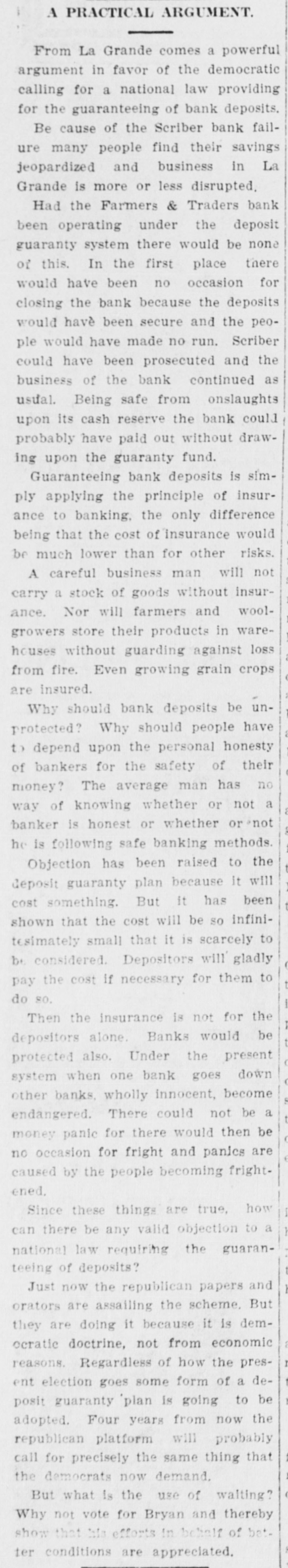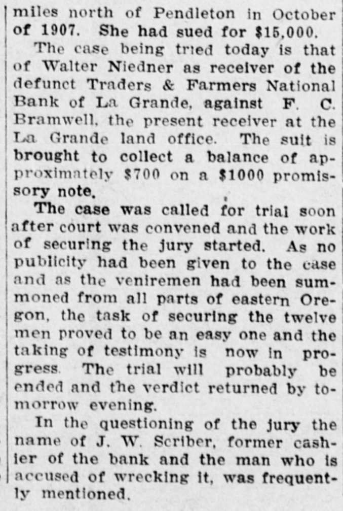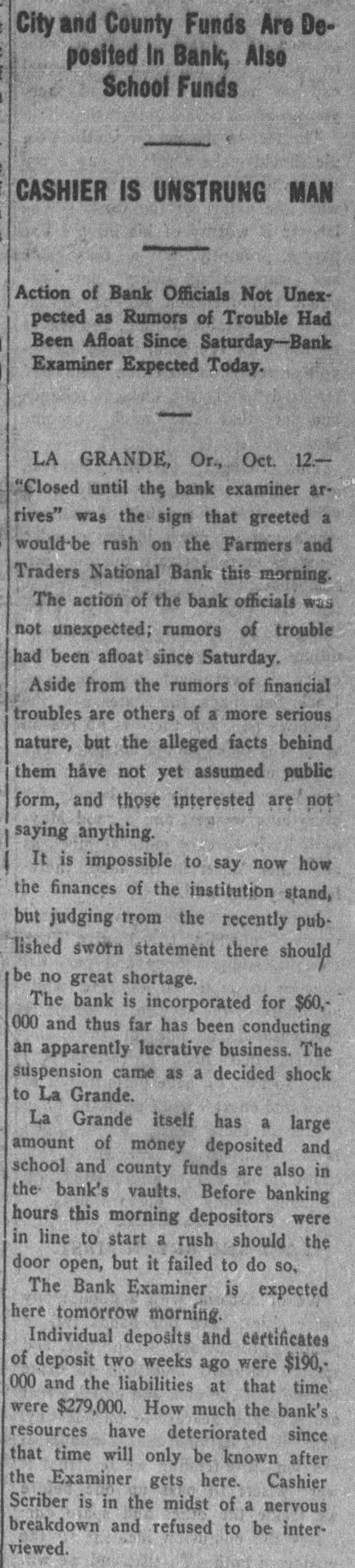 La Grande, Ore., Oct. 12.-(Special.)-This morning the Farmers' & Traders' National bank of this city failed to open its doors and a bank examiner will be here tomorrow to inquire into the condition of its affairs. The refusal of the bank to open its doors this morning was due to the fear of a run caused by a general suspicion that has been aroused as to the honesty of the bank's cashier, J. W. Scriber. Forgery Is Suspected. Last Friday N. K. West, a prominent merchant of this city, received notice from the First National bank at Elgin informing him that they held a note "signed by him for $2000 and in favor of the Farmers' & Traders' national. Knowing he had never issued such a note, Mr. West called upon Scriber to explain. He was then informed by Scriber that the affair would be attended to and for him, West, to think no more about it. Auto Race to Elgin. However, Mr. West was not satisfied and securing an auto started for Elgin to investigate. At the same time Scriber also started out by auto for Elgin in hopes of beating West to that place. On the way to Elgin West's auto collided with a buggy and as a result Scriber beat him to Elgin by half an hour. Reaching the bank Scriber secured the note and the Elgin bankers are now non-committal regarding the matter. Suspicion Causes Run. Saturday the news of West's experience became known in La Grande and suspicion became aroused as to the safety of Scriber's bank. Some deposits were withdrawn Saturday, but not enough to affect the bank seriously. However, it was feared a run would occur today and in consequence Scriber ordered the bank closed today. Today Scriber is reported to be suffering from nervous prostration and is ill at his home. However, in an interview with the La Grande Observer, he declared he would use all his private means to protect the bank's depositors and furthermore declared that the bank has ample means to pay off every depositor at full face. Bank Is Solvent. The last statement issued by the bank September 23, showed the bank to be solvent. At that time the deposits amounted to $190,000 and the notes and securities to $161,000. Cash amounting to $50,000 was then on hand or available. It is the general opinion in La Grande that a reciver will be appointed to take charge of the bank's V affairs. However, it is not believed the depositors will suffer at all undess further irregularities are discovered. La Grande's other banks, of which there are two, are in stronger condiG tions than at any time in the past. No fears whatever are entertained d for their safety. h