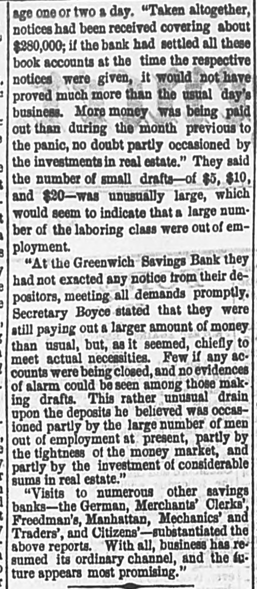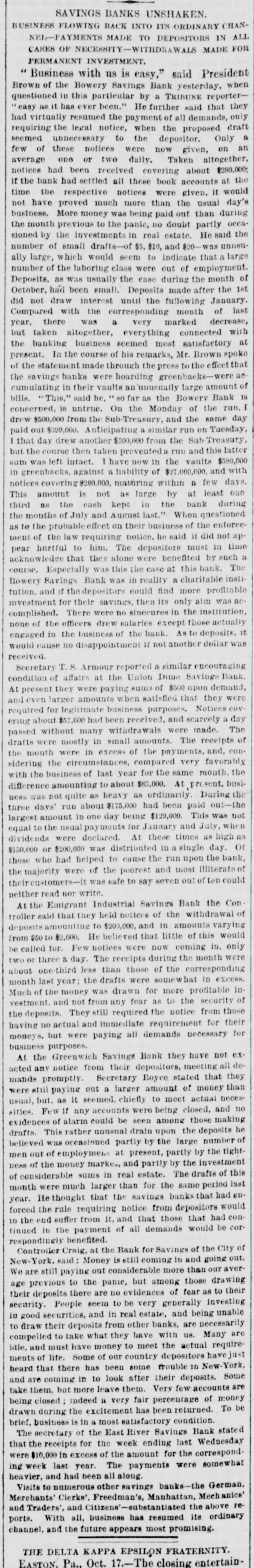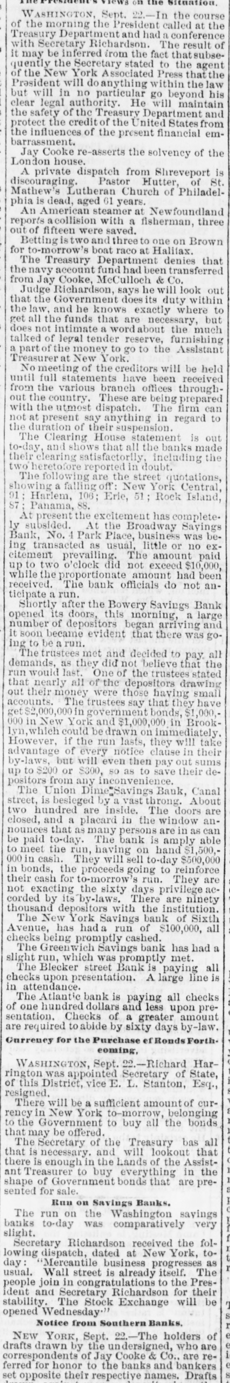 WASHINGTON. Sent. 22.-In the course of the morning the President called at the Treasury Department and had a conference with Secretary Richardson. The result of it may be inferred from the fact thatsubsequently the Secretary stated to the agent of the New York Associated Press that the President will o anything within the law but will in no particular go beyond his clear legal authority. He will maintain the safety of the Treasury Department and protect the credit of the United States from the influences of the present financial embarrassment. Jay Cooke re-asserts the solvency of the London house. A private dispatch from Shreveport is discouraging. Pastor Hutter, of St. Mathew's Lutheran Church of Philadelphia is dead, aged 61 years. An American steamer at Newfoundland reports collision with a fisherman, three out of fifteen were saved. Bettingist and three to one on Brown for to-morrow's boat raco at Halifax. The Treasury Department denies that the navy account fund had been transferred from Jay Cooke, McCulloch & Co. Judge Richardson, says he will look out that the Government does its duty within the law, and he knows exactly where to get all the funds that are necessary, but does not intimate a word about the much talked of legal tender reserve, furnishing a part of the money to go to the Assistant Treasurer at New York. No meeting of the creditors will be held until full statements have been received from the various branch offices throughout the country. These are being prepared with the utmost dispatch. The firm can not at present say anything in regard to the duration of their suspension. The Clearing House statement is out to-day and shows that all the banks made their clearing satisfactorily, including the two heretofore reported in doubt. The following are the street quotations, showing a falling off New York Central, 91 Harlem, 106: Erie, 51; Rock Island, 87 Panama, 88. At present the excitement has complete. ly subsided. At the Broadway Sayings Bank, No. 4 Park Place, business was being transacted as usual, little or no exeitement prevailing. The amount paid up to two o'clock did not exceed $10,000, while the proportionate amount had been received. The bank officials do not anticipate a run. Shortly after the Bowery Savings Bank opened its doors, this morning, a large number of depositors began arriving and it soon became evident that there was going to be a run. The trustees met and decided to pay. all demands, as they did not believe that the run would last. One of the trustees stated that nearly all of the depositors drawing out their money were those having small accounts. The trustees say that they have et $2,000,000 government bonds, $1,000,000 in New York and $1,000,000 in Brooklyn, which could be drawn on immediately. However, if the run lasts, they will take advantage of every notice clause in their by-laws, but will even then pay out sums deup to $200 or $300, SO as to save their positors from any inconvenience. The Union Dime"Savings Bank, Canal street, is besieged by a vast throng. About two hundred are inside. The doors are closed, and a placard in the window announces that as many persons are in as can be paid to-day. The bank is amply able to meet the run, having on hand $1,500,000ir cash. They will sell to-day $500,000 in bonds, the proceeds going to reinforce their cash for to-morrow's run. They are not exacting the sixty days privilege accorded by its (by-laws. There are ninety thousand depositors with the institution. The New York Savings bank of Sixth Avenue, has had a run of $100,000, all checks being promptly cashed. The Greenwich Savings bank has had a slight run, which was promptly met. The Blecker street Bank is paying all checks upon presentation. A large line is in attendance. The Atlantic bank is paying all checks of one hundred dollars and less upon presentation. Checks of a greater amount are required to abide by sixty days by-law. Currency for the Purchase ef Ronds Fortheoming, WASHINGTON, Sept. 22.-Richard Harrington was appointed Secretary of State, of this District, vice E. L. Stanton, Esq., resigned. There will be a sufficient amount of currency in New York to-morrow, belonging to the Government to buy all the bonds that may be offered. The Secretary of the Treasury bas all that is necessary. and will lookout that there is enough in the hands of the Assistant Treasurer to buy everything in the shape of Government bonds that are presented for sale. Run on Savings Banks. The run on the Washington sayings banks to-day was comparatively very slight. Secretary Richardson received the following dispatch, dated at New York, today: Mercantile business progresses as usual. Wall street is already itself. The people join in congratulations to the President and Secretary Richardson for their stability. The Stock Exchange will be opened Wednesday Notice from Southern Banks. NEW YORK, Sept. 92 The holders of e drafts drawn by the undersigned, who are of Jay ree ferred honor to the banks correspondents for Cooke & and Co., bankers are Drafts set opposite their respective names.