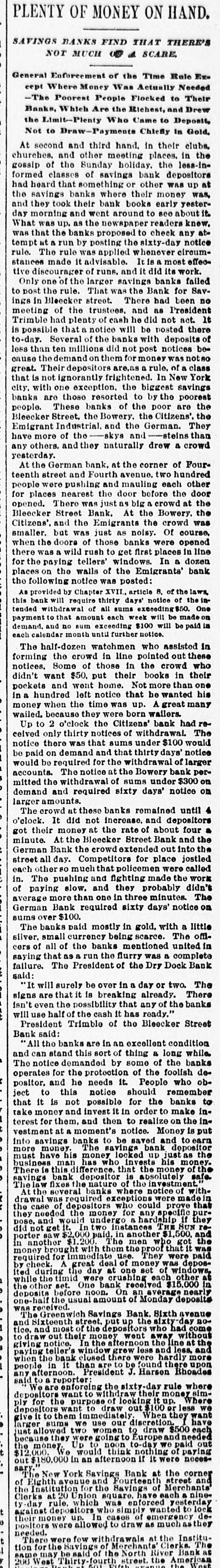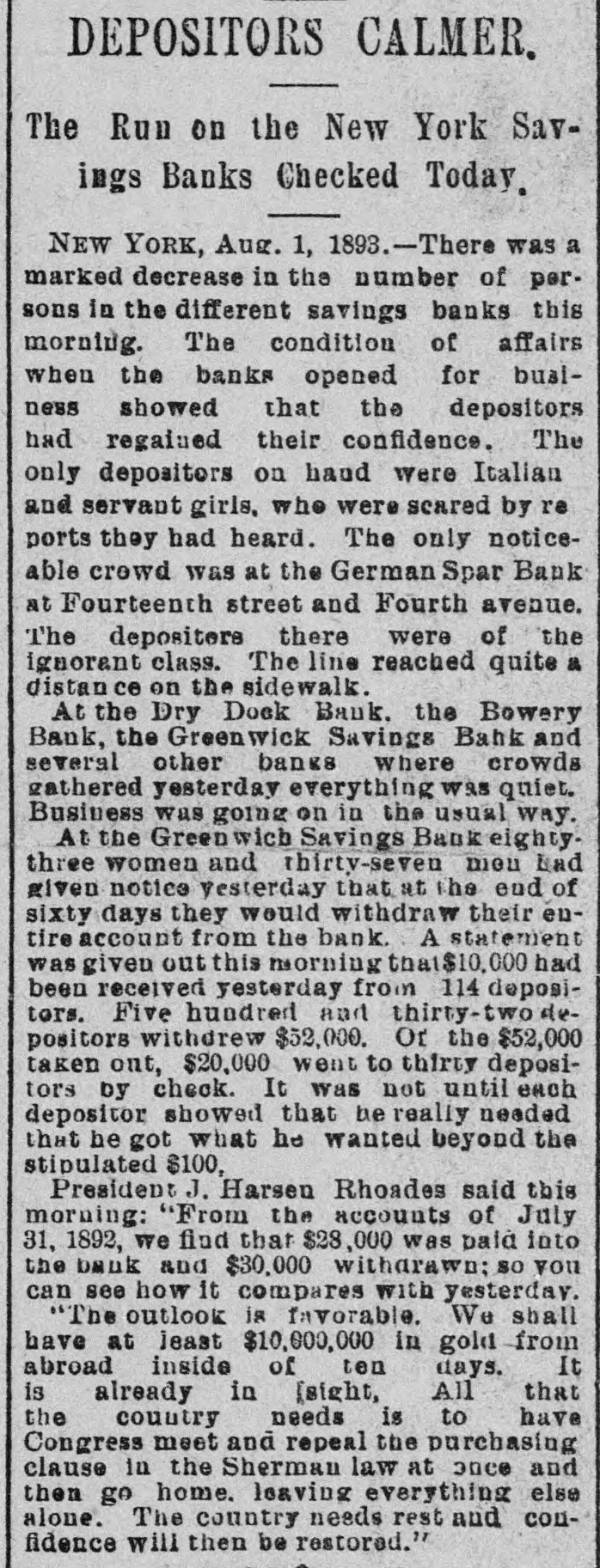 DEPOSITORS CALMER. The Run on the New York Savings Banks Checked Today. NEW YORK, Aug. 1, 1893. - There was a marked decrease in the number of persons in the different savings banks this morning. The condition of affairs when the banks opened for bualness showed that the depositors had regained their confidence. The only depositors on hand were Italian and servant girls. who were scared by re ports they had heard. The only noticeable crowd was at the German Spar Bank at Fourteenth street and Fourth avenue. The depositers there were of the ignorant class. The line reached quite a distan ce on the sidewalk. At the Dry Dock Bauk. the Bowery Bank, the Greenwick Savings Bahk and several other banks where crowds gathered yesterday everything was quiet. Business was going on in the usual way. At the Green wich Savings Bank eightythree women and thirty-seven men End given notice yesterday that at the end of sixty days they would withdraw their entire account from the bank. A statement was given out this morning that 1$10,000 had been received yesterday from 114 depositors. Five hundred and thirty-two depositors withdrew $52,000. Or the $52,000 taken ont, $20,000 went to thirty depositors by check. It was not until each depositor showed that be really needed that he got what he wanted beyond the stipulated $100, President J. Harsen Rhoades said this morning: "From the accounts of July 31, 1892, we find that $28,000 was paid into the bank and $30,000 withdrawn; so you can see how it compares with yesterday. "The outlook is favorable. We shall have at least $10,000,000 in gold from abroad inside of ten days. It is already in (sight, All that the country needs is to have Congress meet and repeal the purchasing clause in the Sherman law at once and then go home. leaving everything else alone. The country needs rest and confidence will then be restored."