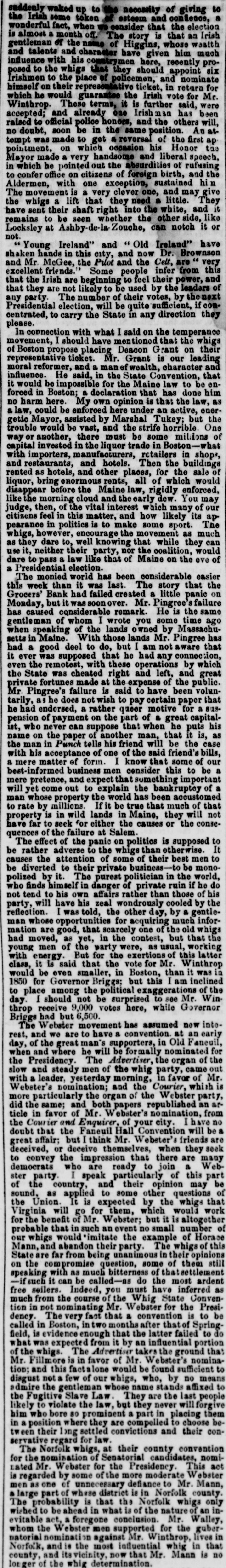 waked up to necessity of giving to the Irish some and token esteem confesce, wonderful fact, when we consider that the election almost month story is that gentleman of the whose and talents have given him much influence with here, recently proposed to the whigs should appoint six to Irishmen the place and policemon, nominate himself on their represe ticket in return for which he would the Irish vote for Mr Winthrop These terms. is further said, were accepted; and already Irish has been raised to official police honors, and the others will no doubt, soon be in the same position. Au a of the made reversa first to was tempt occasion Honor which on his pointment. the Mayor made very handsome and liberal speech, in which he pointed out the absurditie of rufusing to confer office on citizens of foreign birth, and the Aldermen, with one exception, sustained The movement is very clever one. and may give the whigs a lift that they need a little They have sent their shaft right into the white, and remains to be seen whether the other side, like Locksley at Ashby de la Zouche, can notch it or not Young Ireland and Old Ireland have shaken hands in this city, and now Dr Brownson and Mr. McGee, the Proo and the Cell, are very excellent friends Some people infer from this that the Irish are beginning to feel their power, and that they are not likely to be used by the leaders of any party The number of their votes, by the next Presidential election, will be quite sufficient, if con centrated, to carry the State in any direction they please. In connection with what said on the temperance movement, should have mentioned that the whigs of Boston propose placing Deacon Grant on their representative ticket. Mr Grant is our leading moral reformer and man of wealt character and influence He said, in the State Convention. that would be impossible for the Maine law to be en forced in Boston; a declaration that has done him no harm here. My own opinion is that the law, alaw, could be enforced here under an active, ener getic Mayor, assisted by Marshal Tukey; but the trouble would be vast, and the strife horrible One way or another. there must be some millions of capital invested in the liquor trade in Boston with importers, manufacturers, retailers in shops and restaurants and hotels. Then the buildings rented as hotels, and other places, for the sale of liquor, bring enormous rents, all of which would disappear before the Maine law, rigidly enforced like the morning cloud and the early dew You may judge, then, of the vital interest which many of our citizens feel in this matter. and how likely its ap pearance in politics is to make some sport The whigs, however, encourage the movement as much as they dare to, well knowing that while they can use it, neither their party, nor the coalition. would dare to pass law like that of Maine on the eve of Presidential election The monied world has been considerable easier this week than it was last The story that the Grocers' Bank had failed cre little panic on Monday, but it wassoon over. Mr Pingree has caused considerable remark He is the gentleman of whom I wrote you some time when speaking of the lands owned by Massachusetts in Maine With those lands Mr. Pingree has had a good deel to do, but I am not aware that it ever was supposed that he had any connection. even the remotest. with these operations by which the State was cheated right and left. and great private fortunes made at the expense of the public. Mr Pingree's failure is said to have been volun tarily, as he does not wish to pay certain paper that he had endorsed, rather queer motive for pension of payment on the part of a great capital ist, who never can suppose that when he puts his name on the paper of anoth man, that is, the man in Punch lls his friend will be the case with his acceptance of one of the said friend's bills. mere matter of form know that some of our best-informed business men consider this to be mere pretence, and expect that something important will yet come out to explain the bankruptcy of a man whose property the world has been accustomed to rate by millions. If it be true that much of that property is in wild lands in Maine, they will not have far to seek for either the causes or the consequences of the failure at Salem The effect of the panic on politics is supposed be rather adverse to the whigs than otherwise. causes the attention of some of their best men to be diverted to their private business to be mono polized by it The purest politician in the world. who finds himself in danger of private ruin if he do not tend to his own affairs rather than those of his party, will have his zeal wondrously cooled by the reflection was told, the other day, by gentle man whose opportunities for acquiring much information are good, that scarcely one of the old whigs had moved, yet, in the contest but that the young men of the party were, as usual. working with energy But for the exertions of this latter class, it is said that the vote for Mr Winthrop would be even smaller in Boston, than it was 1850 for Governor Briggs: but this am inclined to place among the political exaggerations of the day I should not be surprised to see Mr Win throp receive 9,000 votes here, while Governor Brigge had but 6,500 The Webster movement has assumed new into rest. and we are to have convention at an earl day, of the great man' supporters, in Old Faneui when and where he will be formally nominated for the Presidency The Advertiser, the organ of the slow and steady men of the whig party, came with a leader, yesterday morning in favor of Mr Webster's nomination; and the Courier. whish more particularly the organ of the Webster party did the same; and both papers republished an ticle in favor of Mr Webster' nomination, from the Courier and Enquirer, of your city have doubt that the Faneuil Hall Convention will be great affair; but think Mr. Webster' friends are deceived, or deceive themselves when they seek to convey t