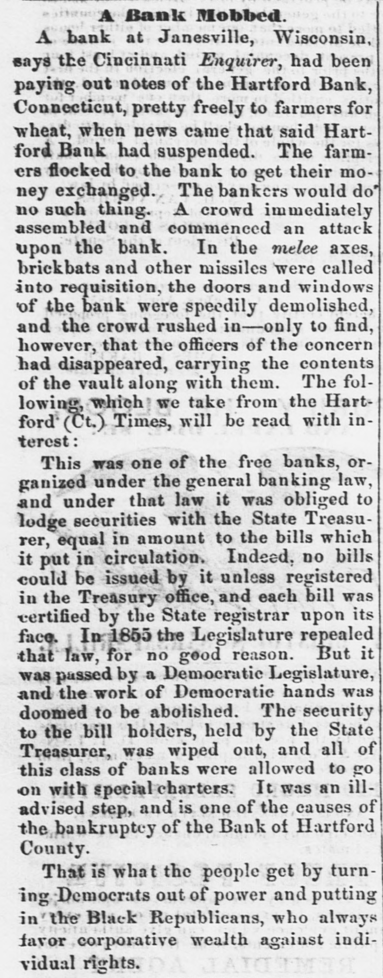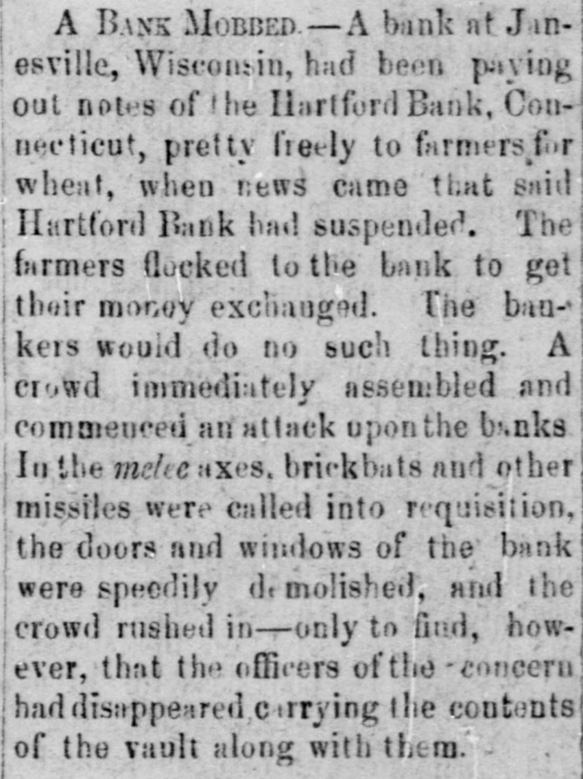 THE MONEY PANIC IN NEW YORK. [Correspondence of the National Intelligencer NEW YORK, Aug. 25-P. M. The failure of the Ohio Life and Trust Company has had an injurious effect on the stock market, and other failures have created A senection. The truth is stock gambling has become one of the prominent vices of the times, and reform must be brought about by 8A vere suffering, as well upon the innocent and confiding as upon the adventurous portion of the community. The Journal of Commerce, in desoanting upon the above failure, cautions the public against yielding to the effect of a sudden penic, and says "Speculation has carried prices above their aver. age value, and by a natural swing of the pendulum they have in many cases been brought again very low, many of them doubtions for below their proper equilibrium. We have no idea that there will be an ectipse because the cashier of the Obio Life and Trust Company has carried that company beyond its depth, or that business in New York will come to n dead stand in consequence. Let us all take a long breath; there is nobody chasing us; and what we took for an enemy is nothing, after all, but our own shadows." The Post cays: "The real stringency of money that now exists is not in the best established circles of trade, but almost entirely in the more speculative branches; and these will continue to fedi is growing stringency until the annual financial tide reaches in ebb, which is generally within 8 fortnight of New Year's day, before or after. Our banking system is H great conservative element in this emergency, And if its administration will be dispreet, the failure of the Obio Life and Trust Company may result in & public benefit. Indeed, it can only be converted into a pub lic injury by the loss of self possession, and by the sacrifices that Attend a state of anarchy and panic." The financial panic occasioned by the suspension of the Ohio Trust Company was increased by the announcement of the surpension of the houses of DeLannay, Iselin & Clarke, Jno. Thompson and E S. Monroe, bankers and stock brokers, and the reported failure of 8 Hariford bank; the Rhode Island Central Bank of East Greenwich; the Tiverten Bank of Rhode Island; the Farmers' Bank of Wickford; the Warren Bank of Pennsylvania; the Bank of Kanawha, Virginia, and the Hancock Bank of Maine. It is expected that the shock will be seriously telt throughout the West. The Cincinnati Gazette, of Tuesday, 8AV9 the announcement of the suspension of the New York branch of the Ohio Life Insurance and Trust Com pany fell upon the citizens of Cincinnati like a clap of thunder in 8 clear sky. The company, it *says, had been regarded 88 among the safest and most substantial banking institutions in the country, Its business in Cincinnati had been carefully managed and yielded 8 fair profit. On the fourth of July 8 semi-annual cash dividend was declared of four and a-half per cent. A