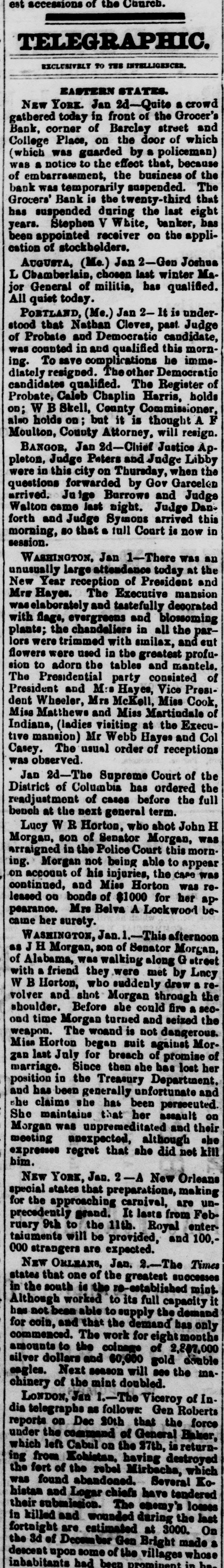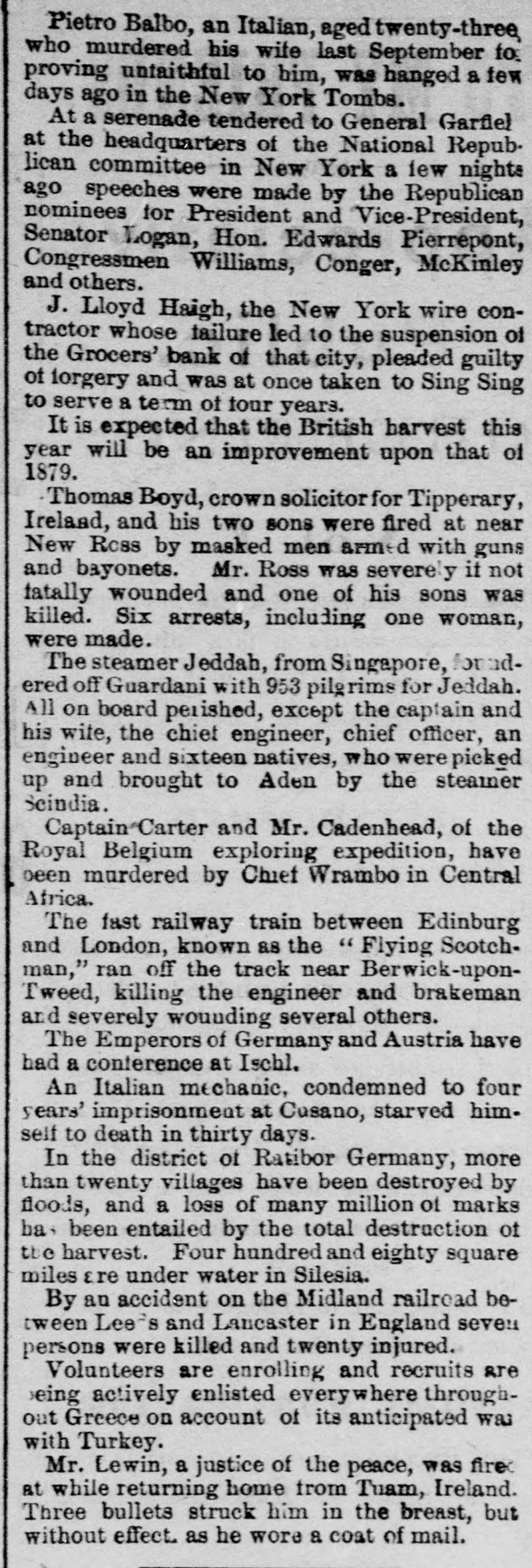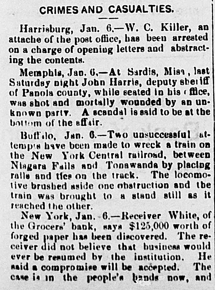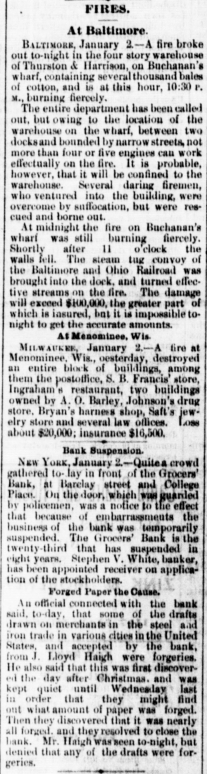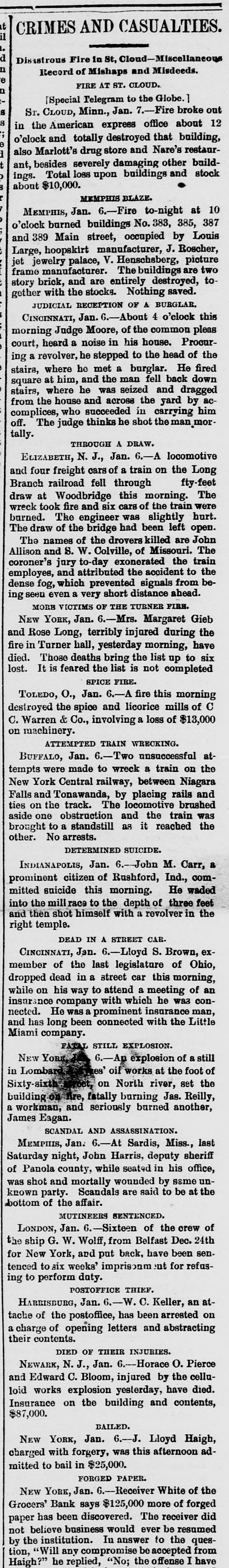 CRIMES AND CASUALTIES. Disastrous Fire in St, Cloud-Miscellaneous Record of Mishaps and Misdeeds. FIRE AT ST. CLOUD. [Special Telegram to the Globe.] Sr. CLOUD, Minn., Jan. 7.-Fire broke out in the American express office about 12 o'clock and totally destroyed that building, also Marlott's drug store and Nare's restaurant, besides severely damaging other buildings. Total loss upon buildings and stock about $10,000. MEMPHIS BLAZE. MEMPHIS, Jan. 6.-Fire to-night at 10 o'clock burned buildings No. 383, 385, 387 and 389 Main street, occupied by Louis Large, hoopskirt manufacturer, J. Roscher, jet jewelry palace, V. Henschsberg, picture frame manufacturer. The buildings are two story brick, and are entirely destroyed, together with the stocks. Nothing saved. JUDICIAL RECEPTION OF A BURGLAR. CINCINNATI, Jan. 6.-About 4 o'clock this morning Judge Moore, of the common pleas court, heard a noise in his house. Procuring a revolver, he stepped to the head of the stairs, where he met a burglar. He fired square at him, and the man fell back down stairs, where he was seized and dragged from the house and across the yard by accomplices, who succeeded in carrying him off. The judge thinks he shot the man.mortally. THROUGH A DRAW. ELIZABETH, N. J., Jan. 6.-A locomotive and four freight cars of a train on the Long fty-feet Branch railroad fell through draw at Woodbridge this morning. The wreck took fire and six cars of the train were burned. The engineer was slightly hurt. The draw of the bridge had been left open. The names of the drovers killed are John Allison and S. W. Colville, of Missouri. The coroner's jury to-day exonerated the train employes, and attributed the accident to the dense fog, which prevented signals from being seen even a very short distance ahead. MORE VICTIMS OF THE TURNER FIRE. NEW YORK, Jan. 6.-Mrs. Margaret Gieb and Rose Long, terribly injured during the fire in Turner hall, yesterday morning, have died. Those deaths bring the list up to six lost. It is feared the list is not completed SPICE FIRE. TOLEDO, O., Jan. 6.-A fire this morning destroyed the spice and licorice mills of C C. Warren & Co., involving a loss of $13,000 on machinery. ATTEMPTED TRAIN WRECKING. BUFFALO, Jan. 6.-Two unsuccessful attempts were made to wreck a train on the New York Central railway, between Niagara Falls and Tonawanda, by placing rails and ties on the track. The locomotive brushed aside one obstruction and the train was brought to a standstill as it reached the other. No arrests. DETERMINED SUICIDE. INDIANAPOLIS, Jan. 6.-John M. Carr, a prominent citizen of Rushford, Ind., committed suicide this morning. He waded into the mill race to the depth of three feet and then shot himself with a revolver in the right temple. DEAD IN A STREET CAR. CINCINNATI, Jan. 6.-Lloyd S. Brown, exmember of the last legislature of Ohio, dropped dead in a street car this morning, while on his way to attend a meeting of an insurance company with which he was connected. He was a prominent insurance man, and has long been connected with the Little Miami company. FATAL STILL EXPLOSION. NEW York, 6.-An explosion of a still in Lombard oil works at the foot of Sixty-sixth street, on North river, set the building fire, fatally burning Jas. Reilly, a workman, and seriously burned another, James Eagan. SCANDAL AND ASSASSINATION. MEMPHIS, Jan. 6.-At Sardis, Miss., last Saturday night, John Harris, deputy sheriff of Panola county, while seated in his office, was shot and mortally wounded by some unknown party. Scandals are said to be at the bottom of the affair. MUTINEERS SENTENCED. LONDON, Jan. 6.-Sixteen of the crew of the ship G. W. Wolff, from Belfast Dec. 24th for New York, and put back, have been sentenced to six weeks' imprisonm ent for refusing to perform duty. POSTOFFICE THIEF. HARRISBURG, Jan. 6.-W. C. Keller, an attache of the postoffice, has been arrested on a charge of opening letters and abstracting their contents. DIED OF THEIR INJURIES. NEWARK, N. J., Jan. 6.-Horace 0. Pierce and Edward C. Bloom, injured by the celluloid works explosion yesterday, have died. Insurance on the building and contents, $87,000. BAILED. NEW YORK, Jan. 6.-J. Lloyd Haigh, charged with forgery, was this afternoon admitted to bail in $25,000. FORGED PAPER. NEW YORK, Jan. 6.-Receiver White of the Grocers' Bank says $125,000 more of forged paper has been discovered. The receiver did not believe business would ever be resumed by the institution. In answer to the question, Will any compromise be accepted from Haigh?" he replied, "No; the offense I have