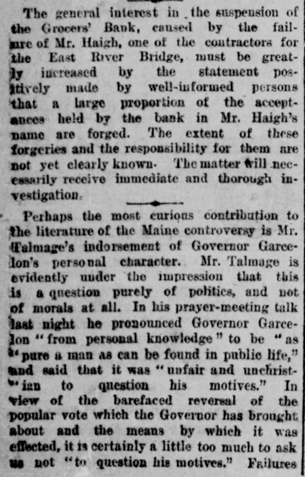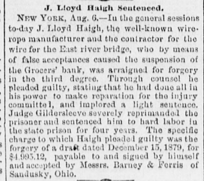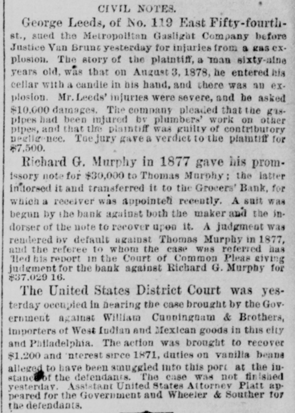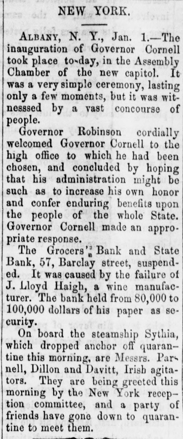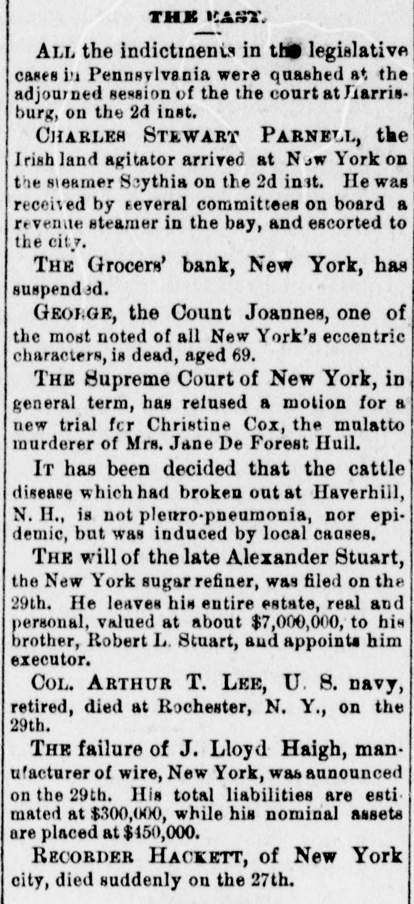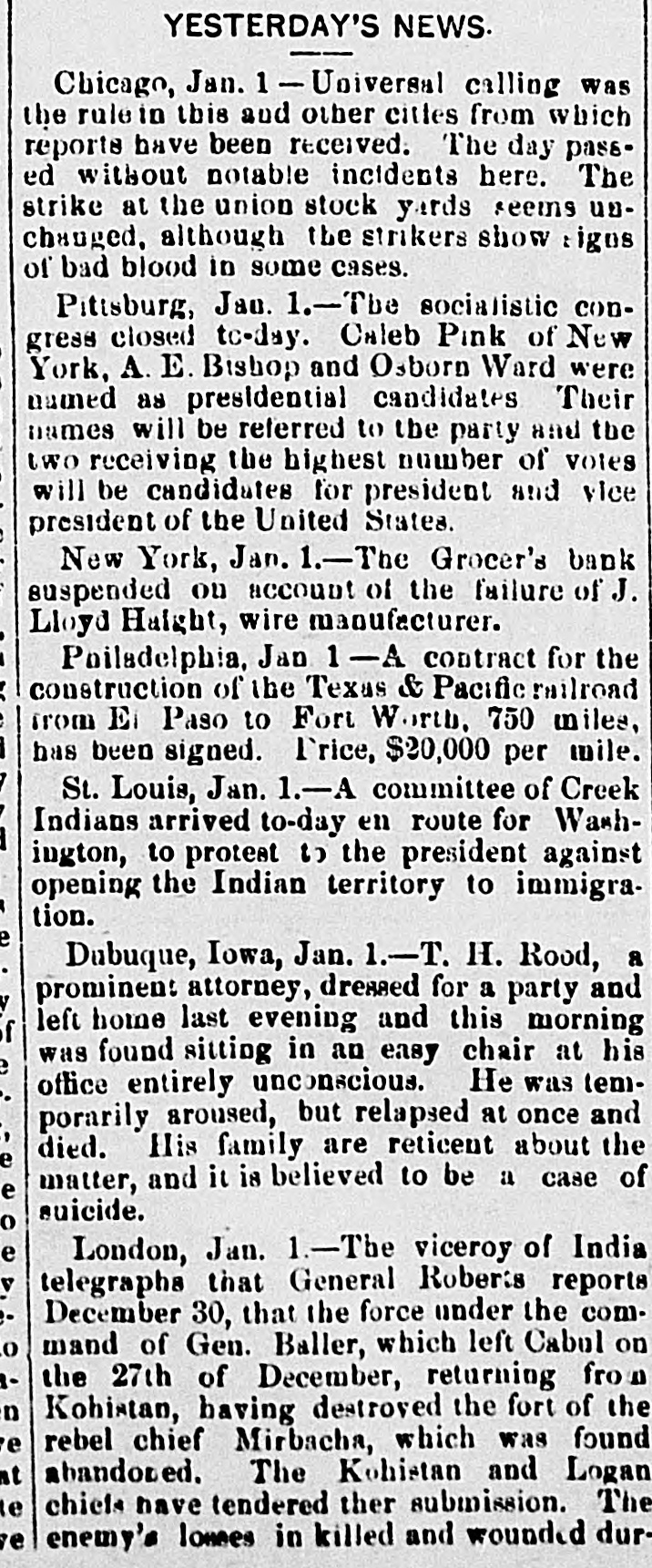 CRIMES AND CASUALTIES. Disastrous Fire in St, Cloud-Miscellaneous Record of Mishaps and Misdeeds. FIRE AT ST. CLOUD. [Special Telegram to the Globe.] Sr. CLOUD, Minn., Jan. 7.-Fire broke out in the American express office about 12 o'clock and totally destroyed that building, also Marlott's drug store and Nare's restaurant, besides severely damaging other buildings. Total loss upon buildings and stock about $10,000. MEMPHIS BLAZE. MEMPHIS, Jan. 6.-Fire to-night at 10 o'clock burned buildings No. 383, 385, 387 and 389 Main street, occupied by Louis Large, hoopskirt manufacturer, J. Roscher, jet jewelry palace, V. Henschsberg, picture frame manufacturer. The buildings are two story brick, and are entirely destroyed, together with the stocks. Nothing saved. JUDICIAL RECEPTION OF A BURGLAR. CINCINNATI, Jan. 6.-About 4 o'clock this morning Judge Moore, of the common pleas court, heard a noise in his house. Procuring a revolver, he stepped to the head of the stairs, where he met a burglar. He fired square at him, and the man fell back down stairs, where he was seized and dragged from the house and across the yard by accomplices, who succeeded in carrying him off. The judge thinks he shot the man.mortally. THROUGH A DRAW. ELIZABETH, N. J., Jan. 6.-A locomotive and four freight cars of a train on the Long fty-feet Branch railroad fell through draw at Woodbridge this morning. The wreck took fire and six cars of the train were burned. The engineer was slightly hurt. The draw of the bridge had been left open. The names of the drovers killed are John Allison and S. W. Colville, of Missouri. The coroner's jury to-day exonerated the train employes, and attributed the accident to the dense fog, which prevented signals from being seen even a very short distance ahead. MORE VICTIMS OF THE TURNER FIRE. NEW YORK, Jan. 6.-Mrs. Margaret Gieb and Rose Long, terribly injured during the fire in Turner hall, yesterday morning, have died. Those deaths bring the list up to six lost. It is feared the list is not completed SPICE FIRE. TOLEDO, O., Jan. 6.-A fire this morning destroyed the spice and licorice mills of C C. Warren & Co., involving a loss of $13,000 on machinery. ATTEMPTED TRAIN WRECKING. BUFFALO, Jan. 6.-Two unsuccessful attempts were made to wreck a train on the New York Central railway, between Niagara Falls and Tonawanda, by placing rails and ties on the track. The locomotive brushed aside one obstruction and the train was brought to a standstill as it reached the other. No arrests. DETERMINED SUICIDE. INDIANAPOLIS, Jan. 6.-John M. Carr, a prominent citizen of Rushford, Ind., committed suicide this morning. He waded into the mill race to the depth of three feet and then shot himself with a revolver in the right temple. DEAD IN A STREET CAR. CINCINNATI, Jan. 6.-Lloyd S. Brown, exmember of the last legislature of Ohio, dropped dead in a street car this morning, while on his way to attend a meeting of an insurance company with which he was connected. He was a prominent insurance man, and has long been connected with the Little Miami company. FATAL STILL EXPLOSION. NEW York, 6.-An explosion of a still in Lombard oil works at the foot of Sixty-sixth street, on North river, set the building fire, fatally burning Jas. Reilly, a workman, and seriously burned another, James Eagan. SCANDAL AND ASSASSINATION. MEMPHIS, Jan. 6.-At Sardis, Miss., last Saturday night, John Harris, deputy sheriff of Panola county, while seated in his office, was shot and mortally wounded by some unknown party. Scandals are said to be at the bottom of the affair. MUTINEERS SENTENCED. LONDON, Jan. 6.-Sixteen of the crew of the ship G. W. Wolff, from Belfast Dec. 24th for New York, and put back, have been sentenced to six weeks' imprisonm ent for refusing to perform duty. POSTOFFICE THIEF. HARRISBURG, Jan. 6.-W. C. Keller, an attache of the postoffice, has been arrested on a charge of opening letters and abstracting their contents. DIED OF THEIR INJURIES. NEWARK, N. J., Jan. 6.-Horace 0. Pierce and Edward C. Bloom, injured by the celluloid works explosion yesterday, have died. Insurance on the building and contents, $87,000. BAILED. NEW YORK, Jan. 6.-J. Lloyd Haigh, charged with forgery, was this afternoon admitted to bail in $25,000. FORGED PAPER. NEW YORK, Jan. 6.-Receiver White of the Grocers' Bank says $125,000 more of forged paper has been discovered. The receiver did not believe business would ever be resumed by the institution. In answer to the question, Will any compromise be accepted from Haigh?" he replied, "No; the offense I have