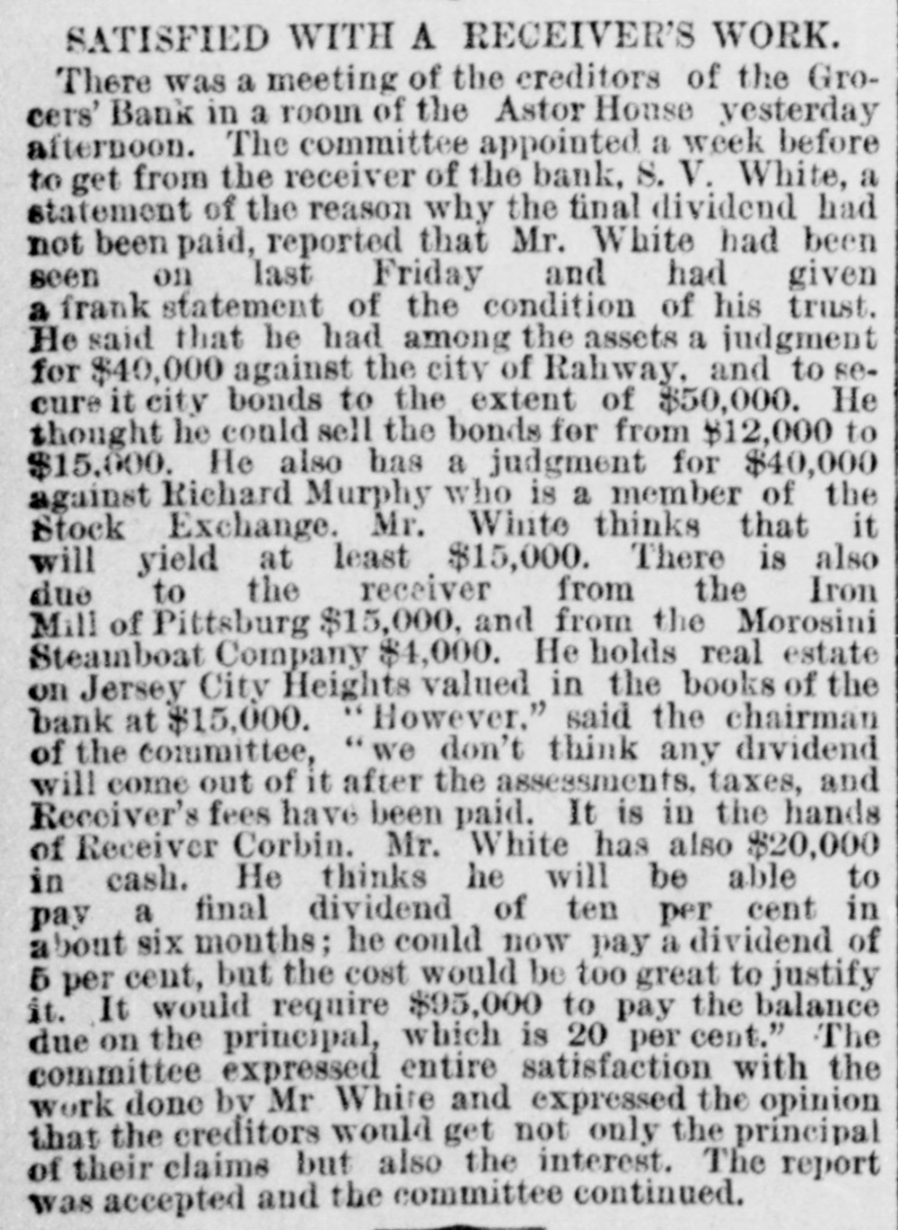 SATISFIED WITH A RECEIVER'S WORK. There was a meeting of the creditors of the Grocers' Bank in a room of the Astor House yesterday afternoon. The committee appointed a week before to get from the receiver of the bank, 8. V. White, a statement of the reason why the final dividend had not been paid, reported that Mr. White had been seen on last Friday and had given a frank statement of the condition of his trust. He said that he had among the assets a judgment for $40,000 against the city of Rahway, and to secure it city bonds to the extent of $50,000. He thought he could sell the bonds for from $12,000 to $15,000. He also has a judgment for $40,000 against Richard Murphy who is a member of the Stock Exchange. Mr. White thinks that it will yield at least $15,000. There is also due to the receiver from the Iron Mill of Pittsburg $15,000, and from the Morosini Steamboat Company $4,000. He holds real estate on Jersey City Heights valued in the books of the bank at $15,000. "However," said the chairman of the committee, "we don't think any dividend will come out of it after the assessments. taxes, and Receiver's fees have been paid. It is in the hands of Receiver Corbin. Mr. White has also $20,000 in cash. He thinks he will be able to pay a final dividend of ten per cent in about six months; he could now pay a dividend of 5 per cent, but the cost would be too great to justify it. It would require $95,000 to pay the balance due on the principal, which is 20 per cent." The committee expressed entire satisfaction with the work done by Mr Whire and expressed the opinion that the creditors would get not only the principal of their claims but also the interest. The report was accepted and the committee continued.