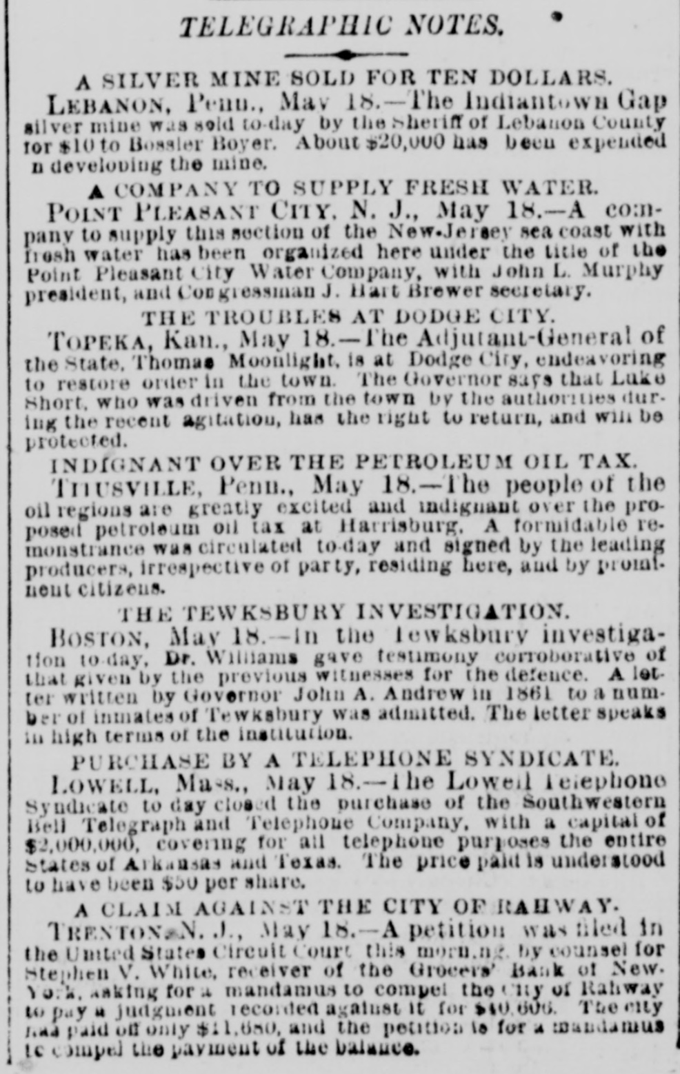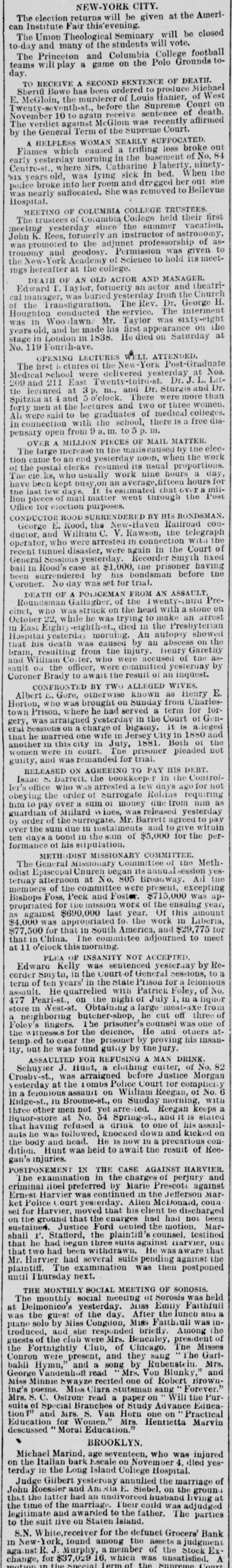 NEW-YORK CITY. The election returns will be given at the American Institute Fair this'evening. will be closed The Union Theological Seminary to-day and many of the students will vote. Princeton and Columbia College football a will teams play The game on the Polo Grounds today. DEATH. TO RECEIVE A SECOND SENTENCE OF Michael Bowe has been ordered to produce of West Sherifl Louis Hanier, E McGloin, the murderer of Court on Twenty-seventh-st., before the Supreme of death The verdict against November 10 again McGloin receiv was sentence recently affirmed by the General Term of the Supreme Court. WOMAN NEARLY SUFFOCATED. A HELPLESS caused a trifling loss broke out Flames which basement of No. 84 in the morning early yesterday Catharine laherty ninetyCentre-st. where Mrs. When the old. was lying sick in bed. six years out she broke into her room and regged her police was nearly suffocated. She was removed to Bellevue Hospital. MEETING OF COLUMBIA COLLEGE TRUSTEES The trustees Comman College held their first meeting vesterday since the summer vacation. John K. Rees, formerly an instructor of astronomy was promoted to the adjunct professorship of asand geodosy Permission was given to tronomy the New-York Academy of Science to hold its meetlugs hereafter at the college. DEATH OF AN OLD ACTOR AND MANAGER. Edward T. Taylor, formerly au actor and theatrical manager, was buried yester day from the Church H of the Transfiguration. The Rev. Dr. George Houghton conducted the service. The interment was in Woo dawn. Mr. Tavlor was sixtv-eight the years old, and he made his first appearance on stage in London in 1838. He died on Saturday at No. 119 Fourth-ave. ATTENDED. LL LECTURES OPENING The first the New York Post-Graduate Medical School were ivered vesterday at Nos. Dr.J.L.L. 209 and 211 Dr. and Dr. Sturgis and tle m., p. lectured than were more There o'clock and Spitzka forty men at the lectures and two or three women. Al were said to be graduates of med dical colleges. In connection with the school, there is a free dispensary open from 9 in. to 5 p. III. OVER A MILLION PIECES OF MAIL MATTER. T he large increase in the maiis caused by the election came to an end yesterday noon, when the work of the postal clerks resumed its usual proportions cie.ks, who usually work nine hours day, for hours .fifteen average an busy been have kept the few days. It is estimated chat over million pieces of mail matter went through the Post Office for election purposes. CONDUCTOR ROOD SURRENDERED D BY HIS BONDSMAN. George E. Rood, the New-Haven Ratiroad conductor, and William C. V. Rawson, the telegraph operator, who were arrested in connection With the recent tunnel disaster, were again in the Court of General Sessions yesterday. Recorder Smy ih tixed bail in Rood' case at $1,000, the prisoner having been surrendered by his bondsman before the Coroner. No day was set for trial. DEATH OF A POLICEMAN FROM AN ASSAULT Roundsman Gallagher of the wenty --burd Precinct, who was struck on the head with stone on October 22, while he was trying to make an arrest 111 East Eight -eighth-st., died the Presby vterian Hospital yesterday morning An autopsy showe that his death was caused by an abscess on the brain, resulting from the injury. Henry Garethy and William Cotter, who were accused of tae sault on the officer, were committed resterday by Coroner Brady to await the result of an inquest. CONFRONTED BY TWO ALLEGED WIVES. Albert E Gore, otherwise known as Henry E. Horton, who was brought on Sunday from Charles town Prison. w here he had served a term for forgery, was arraigned yesterday in the Court 01 General Sessions on charge of bigamy It leged that he married one wife in Jersey City in 1880 and another in this city in July, 1881. Both or the women were court. The prisoner pleaded not guilty, and was remanded for trial. RELEASED ON AGREEING TO PAY HIS DEBT. Isaac S. Barrett. the bookkeep in the Controloffice no arrested few days ago for not obeying the order of Surrogate Rolifas requiring him to pay over sum 01 money due from min as guardian of Millard " lues. was released yesterday by order of the surrogate. Mr. Barrett agreed to pay over the sum due in instalments and to give within ten days bond in the sam of $5,000 for the performance of his stipulation. METHODIST MISSIONARY COMMITTEE The General Missionary Comm the Meth odist Episcopal Church began Its annual session yesteruay afternoon at No. 805 Broadway All the members of the committee were present, excepting Bishops Foss, Peck and Foster. $715,000 was appropriated for the mission work of the ensuing year, against $690,000 last year. Of this amount $4,000 was appropriated fo. the work in Liberia, $77,500 for that in South America, and $29,775 101 that in China. The committee adjourned to meet at 11 o'clock this morning. PLEA OF INSANITY NOT ACCEPTED. Edward Kelly was sentenced yesterday by Recorder Smyto in the Court of General sessions, to a term of ten years in the State Pison for felonious assault. He quarrelled with Patrick Foley, of No. 477 Pearl-st., on the night of July 1, in liquor store in West-st Obtaining large meal axe from neighboring butcher-shop, he cut off three of Folev's tingers. The prisoner's counsel was one of the witnesses for the defence. He and others attemp ed to clear the prisoner by proving his insanity, out he was found guilty by the jury. ASSAULTED FOR REFUSING A MAN DRINK. Schuyier J. Hunt, clothing cutter. of No. 82 Crosby-st. was arraigned before Justice Morgan esterday at the tombs P olice Court for complicia in fejouious assauit on William Reegan of No. 6 Ridge-st., 111 Broome-st. on Sunday morning, with three other men not yet arre-ted. Reegan keeps a liquor-store at No. 54 Spring-st. and 18 stated that having refused a drink to one of his assailauts he was followed, knocked down and kicked on the body and head. He now 111 precarious condition. Hunt was held to await the result of Reegan's injuries. POSTPONEMENT IN THE CASE AGAINST HAR