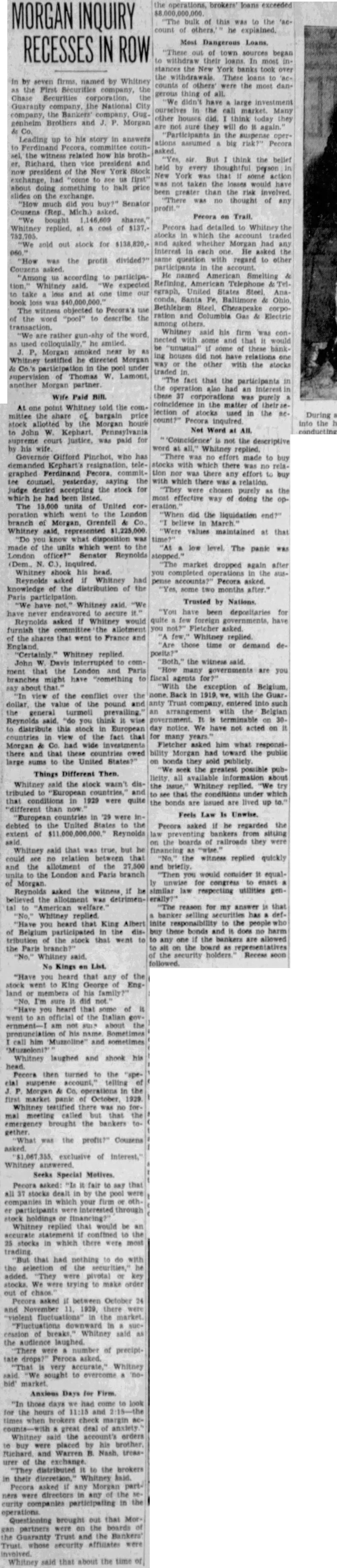 MORGAN INQUIRY IN seven firms, named by Whitney counts the First company, the gerous Chase Securities the Guaranty the National City company, the Bankers other genheim Brothers and Morgan are Leading up to story answers ations counasked. related how his brothvice president held president of the York New "come see first" about something to halt price much did you profit. Couzens (Rep., Mich.) bought 1,146,609 Whitney replied, stocks sold out stock for was the profit divided?" Couzens according participaWhitney said. expected and time our The witness objected Pecora's ration word "pool" to describe the transaction. rather of smiled. Morgan by ing Whitney testified he directed Morgan way in the pool under traded supervision Thomas another Wife Paid point Whitney told the comshare bargain price stock allotted the Morgan John Kephart, Pennsylvania supreme court justice, was paid for his wife. Governor Gifford Pinchot, who has Kephart's resignation, Ferdinand commitcounsel, saying the judge denied accepting the stock which he been The 15,000 units of United poration which went the branch Grenfell Whitney represented "Do know what was of the units which went to London office?" Senator Reynolds Whitney shook his Reynolds asked Whitney had knowledge of the distribution of the Paris Whitney said. asked would furnish the the shares that went to France and "Certainly." Whitney replied. John Davis ment that the London and Paris branches might have about view the conflict over the dollar, the value of the pound and the general "do you think to distribute this in European countries of the fact that Morgan Co. had wide there that large to the United States? Things Different Then. Whitney said the stock wasn't tributed and in 1929 were quite "different than now debted the United to the extent of Reynolds Whitney said that was true, but he could see between that and the allotment the to the London and Paris branch Morgan. Reynolds asked the believed was detrimento "American welfare. Whitney replied. you heard that King Albert Belgium participated distribution the stock that went the Paris branch?" Whitney said. No Kings List. "Have you heard that any of the King George England his I'm did you heard that of went an official the Italian am not about the his him and sometimes Whitney laughed and shook his Pecors then turned the suspense account," telling Morgan Co. operations the market Whitney testified there was no mal meeting called but that the emergency the bankers gether was the profit?" Couzens asked. exclusive of Whitney Seeks Special Motives. Pecora "Is to that the pool which your firm oth. through holdings Whitney replied that would be to stocks in which there were most trading that had nothing do with the the added. "They pivotal key stocks. We trying to make asked October and there "violent the cession of Whitney said the There number drops? Peroca asked. very Whitney sought to overcome bid' Anxious for Firm. those come look for the hours times when brokers check margin great deal anxiety Whitney the account's orders buy placed by his brother urer the exchange. "They distributed to the brokers their discretion,' Whitney Pecora asked any Morgan ners in any the participating the companies operations Questioning brought out that Mor partners were the boards the Guaranty Trust and the Bankers' Trust. whose security affiliates that about the time brokers' loans exceeded bulk of this was the of others. explained. Most Dangerous Loans, out of town sources began withdraw their most stances the York banks took the withdrawais. These loans others' were the most danthing didn't large investment ourselves in the market. Many houses did. think today they sure they will do again. "Participants the suspense operassumed big Pecora sir But the belief every person York was that some action not taken the losses would greater than risk "There thought Pecora Pecora had detailed to Whitney the which account traded and asked whether Morgan had interest each He asked same question with regard to other participants the account He named American Smelting Refining, American Telephone egraph, United States Anaconda, Santa Fe. Baltimore Ohio, Bethlehem Steel. Chesapeake corpoColumbia Gas Electric others. Whitney said his firm was connected and these houses did not have one the other with the stocks "The fact that the participants an these 37 was purely the lection stocks used the During count?" Pecora inquired into the Not Word at All. conducting not the descriptive word at Whitney replied. "There no effort made to buy stocks there was no relation nor there any effort buy which there was relation. chosen purely the most effective doing the did the liquidation "Were values maintained at that low The panic was market dropped again after you completed in Pecora asked. some two months Trusted by Nations. been depositaries for quite few Fletcher asked. Whitney time demand posits?" "Both," the witness said. "How many governments are you fiscal agents the exception of in with the Guar. Trust into with the Belgian on day notice. We have not acted on for many Fletcher asked him what responsibility had toward the public they sold publicly. seek the possible puball the Whitney replied. try that the the bonds are issued are lived Feels Law Is Unwise. Pecora asked regarded the bankers from sitting boards railroads they were financing witness replied quickly and briefly. "Then would consider equalunwise for congress enact similar law utilities generally?" "The reason for my answer that banker selling has inite the buy these bonds and does no harm one the bankers are allowed the board the security Recess followed.