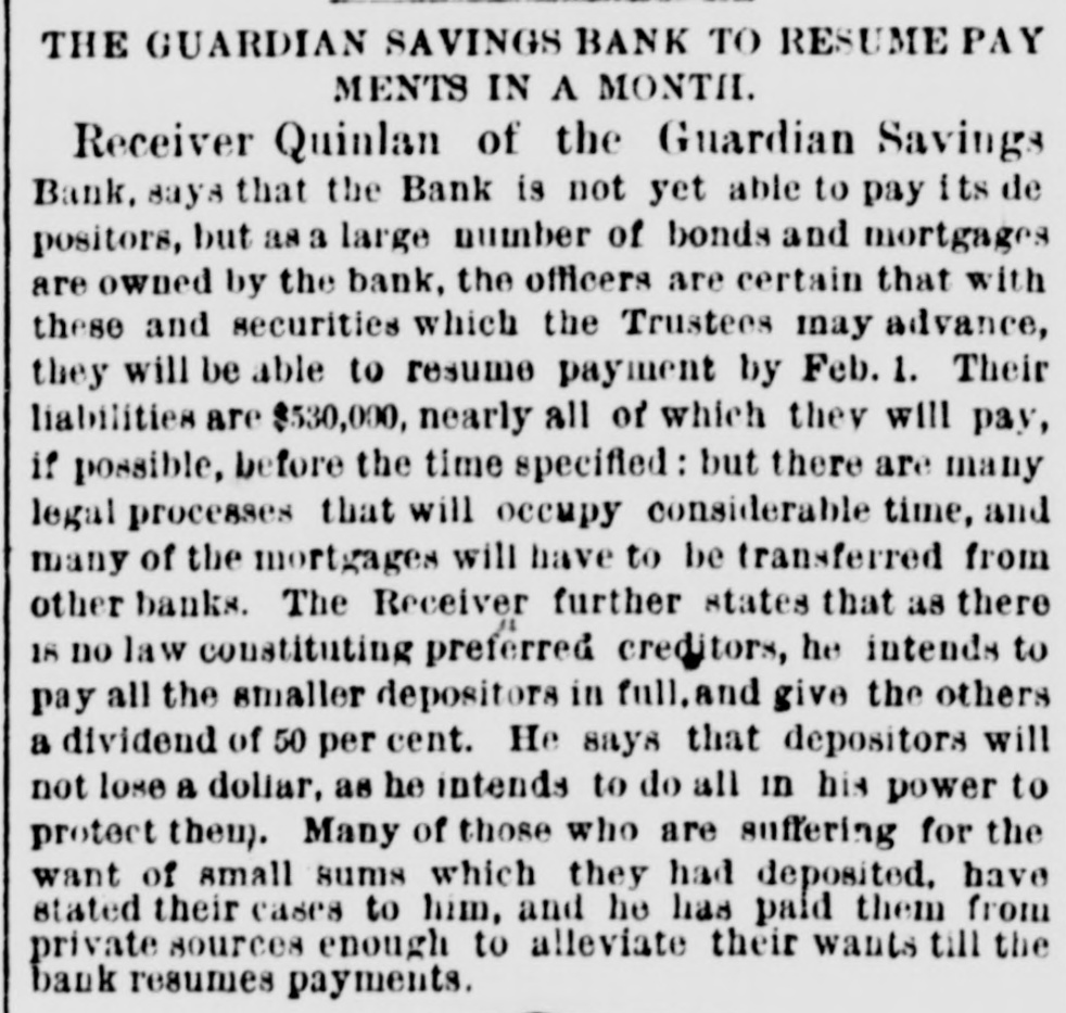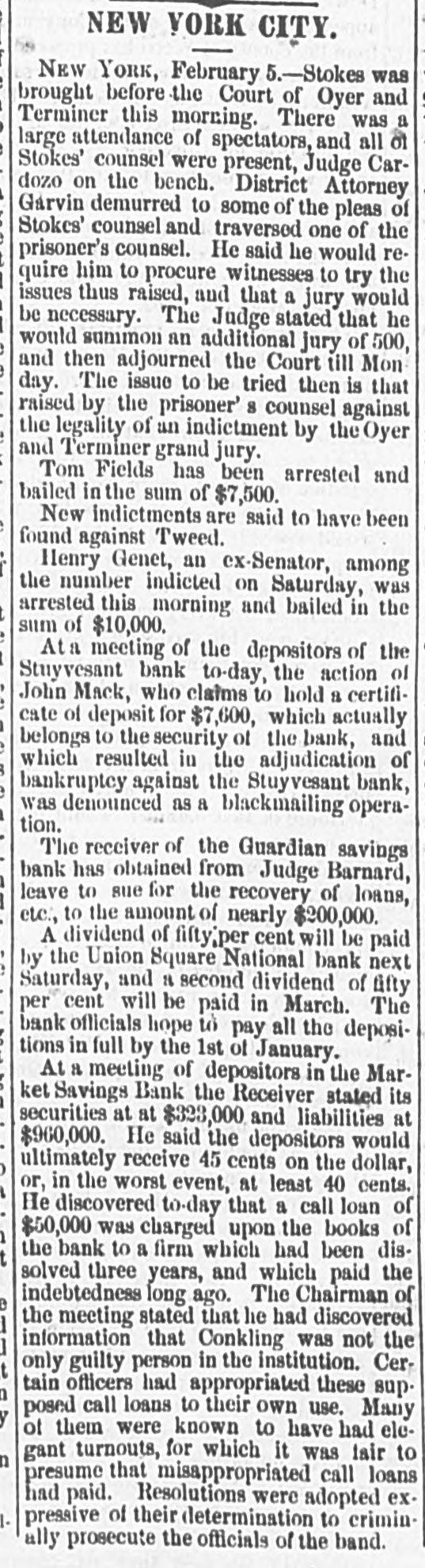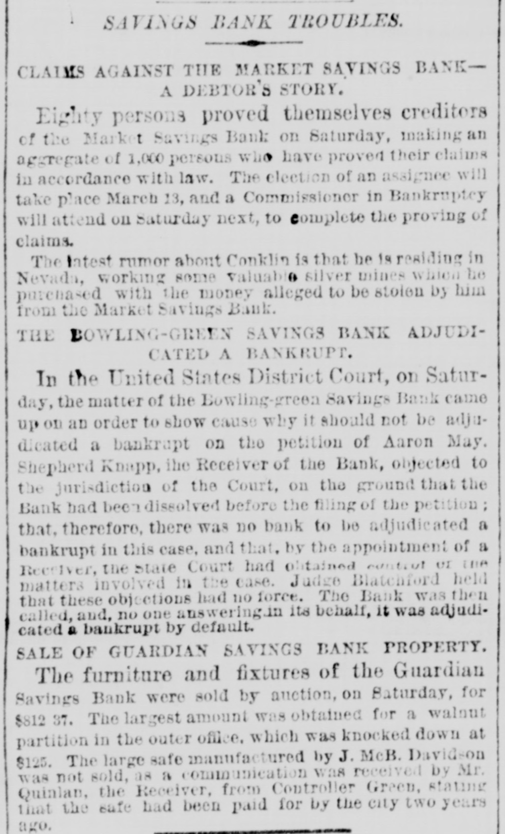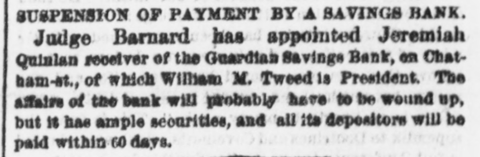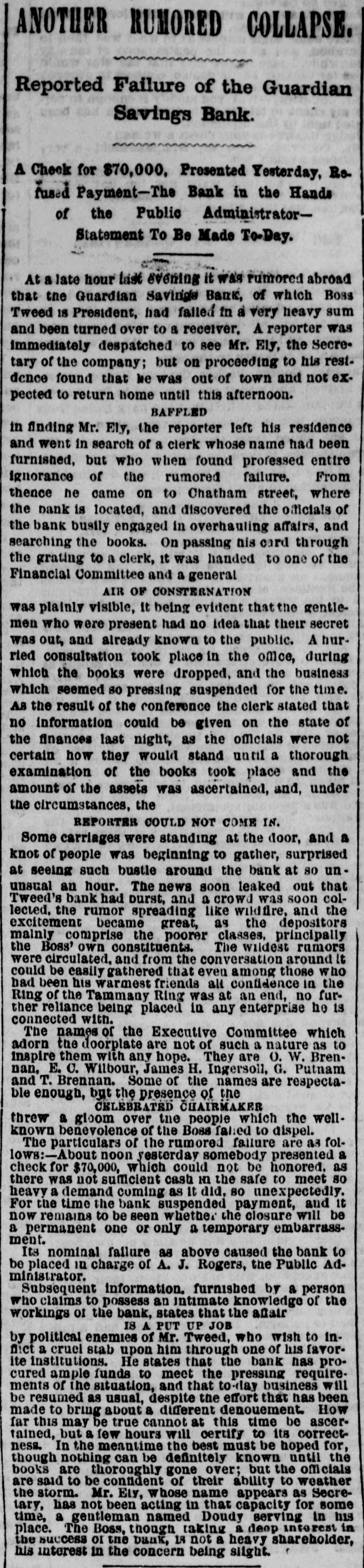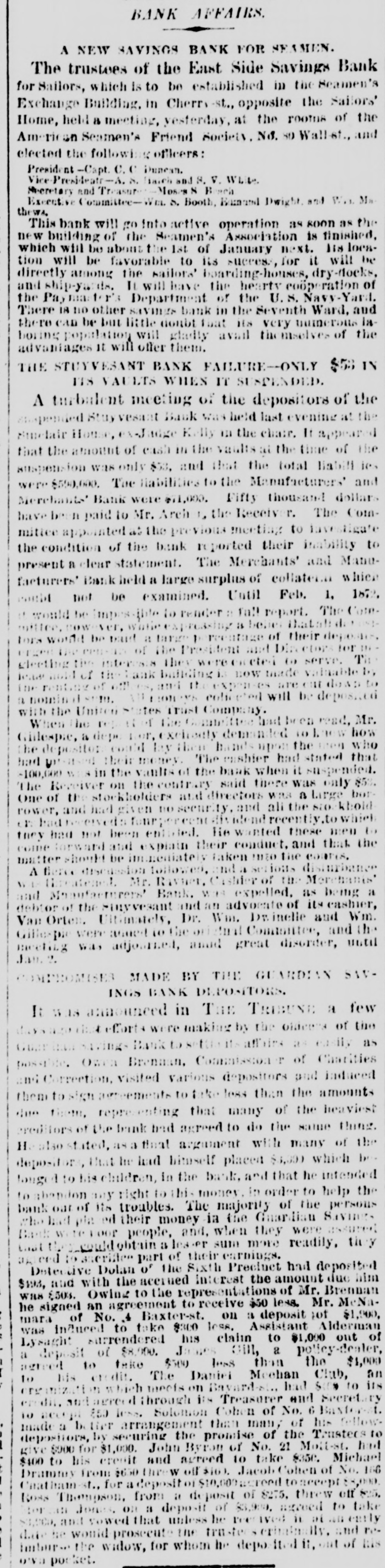 The "Poor Boy of the Mohawk," His Banks and Police-A Captain of Detectives on Guard. THE REPORTS TO THE LEGISLATURE. Reports That Never Lie-Condition of the Manhattan, Guardian, National Savings, Bowling Green, Yorkville and Citizens' Banks. Figures and Facts for the People. Few calamities are fraught with more of truly pittable misery than the failure of a savings bank. Other financial concerns when they topple over usually content themselves with burying in their crumbled heaps of ruins LARGE SLICES OF THE PROPERTY of men whose colossal fortunes can easily with stand a considerable and sudden diminution, and whose means were probably accumulated by the misfortunes of a similar character which had previously overtaken their neighbors; but the closing of a savings bank's doors for the last time shuts out every ray of hope and happiness in this life from the hearts of 80 many poor and worthy fellow creatures who so richly deserve a better fortune that no man with human feelings and sympathies can stand the unmoved witness of such a spectacle. It brings before the mind's eye the exquisite agony of the industrious laborer who for many a long year has toiled in the winter's biting frost and under the blazing summer's sun. in humility and hard. ship and danger, and coined his sweat and blood and flesh into few precious dollars, that might save him from hunger and the aimshouse when his supple joints became stiff and his strong muscles weakened and his hair grew gray after a life of weary SUFFERING AND SELF-DENIAL, and who now suddenly awakes to find that his longcherished dreams-of an old age of comparative comfort and independence have changed into the dread reality of inevitable and hopeless beggary. Then think of the indescribable misery of the poor widow whose humble and untiring Industry with her washboard or her needle has enablea her to save little money, on which she depended to bring up her fatherless boy as a worthy and honest member of society, and to preserve her orphaned daughter from life of shame, and who now finds the fruits of her years of toll and patience and privation all withered and blasted in an hour. Only think of the thousands of cases of wretched. ness and suffering, which no pencil can pain: and no pen enumerate brought about by the collapse or one of those instituti ns which are allowed to exist only because they profess to be peculiarly the guardians and rewarders of the industrious poor. and If there be any sentiment in addition to pity for the victims, it is that no punishment can be too severe for the parties who wilfully abuse or negligently mismanage THE AFFAIRS OF SAVINGS BANK. The great excitement in the city caused by the announcement of the failure of several savings banks and the details thereof published in the HERALD on the two following days had duminished very little yesterday. Even among those who were not depostors the interest in the condition of the suspected banks was very intense, and groups of men who congregated under awnings and porchos for shelter from the falling rain discussed the affairs of the sav. ings banks with the safety and tardy arrival of the Grand Duke Alexis. What every speaker seemed to consider most remarkable was the fact that all THE THREATENED FINANCIAL INSTITUTIONS were connected in some nearer or more remote degree with the old Tammany Ring and acknowledged some one or other of its distinguished members as their managers and directors, and the name of WILLIAM M. TWEED was on every tongue. About two o'clock in the afternoon a large group of soaked and dripping citizens stood under an awning on the corner of Fulton street and Broadway, discussing the financial situa. ation, its causes and effects. "Well," said one gentleman, as he shook the rain from his umbrella, "there's sort of poetical justice in all this. Thousands of poor laborers in the city are ruined by the very men they always fought for and voted for and kept in power." "No, sir, no: that's a mistake," replied poor Irishman, who had just been denied admittance to one of the banks where his little savings were deposited: "that's all mistake, sir. 'Twasn't me that voted for 'em at all. nor tought for 'em, alther. 'Tisn't the poor, hard workin' min, that WORK FOR THEIR LIVIN' and save their little airnings for the childher, that do have anything to do with thim politicians one way or another. We did not put our money in their banks because they were Tammany politicians, but because we saw them looked after and associated with by gintlemin that houlds their heads the highest the city. The papers tould every day that they had plinty of property in all the ratlroads and banks of the country, in company with all the great people of the land, and, sure, we naturally thought they were safe enough to hould our little thrifes for us." "Could it be out of revenge for going back on them at the last election that they have done this thing now ." asked another. "I "Begor, may be so." said the Irishman. wouldn't put past thim.' as "I think, said German, "dey be's not so bad als. I b'leef Tweed has pull all his money out of dem banks and leave nothing any more, so dat he can GET AWAY VERY SOON. How much you lose P1-10 the Irishman. "Two hundhert an' forty-six dollars," answered Pat with sigh. "Ah, lose BIX hoondred dollar," and the German walked away sorrowfully. of It would be hard to estimate the amount wretchedness and misery caused by the failure of those banks: it never will and never can be known All the information that could be gleaned, however, by a sharp squad of reporters is here subjoined. The reporters of the HERALD were yesterday despatched in every direction to secure facts regarding the run upon the banks, and the result of their labors is given, as follows. The Banks of the City and County Hard Earnings Are Secured or Protected. D.C. Howell, Superintendent of the Banking De. partment of the State, resides at Albany, and is supposed to exercise general supervisio