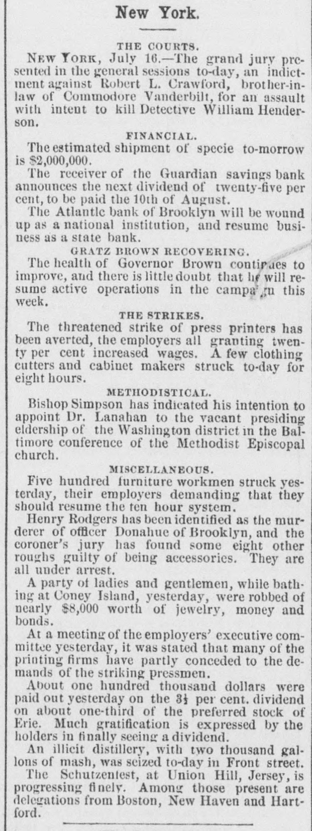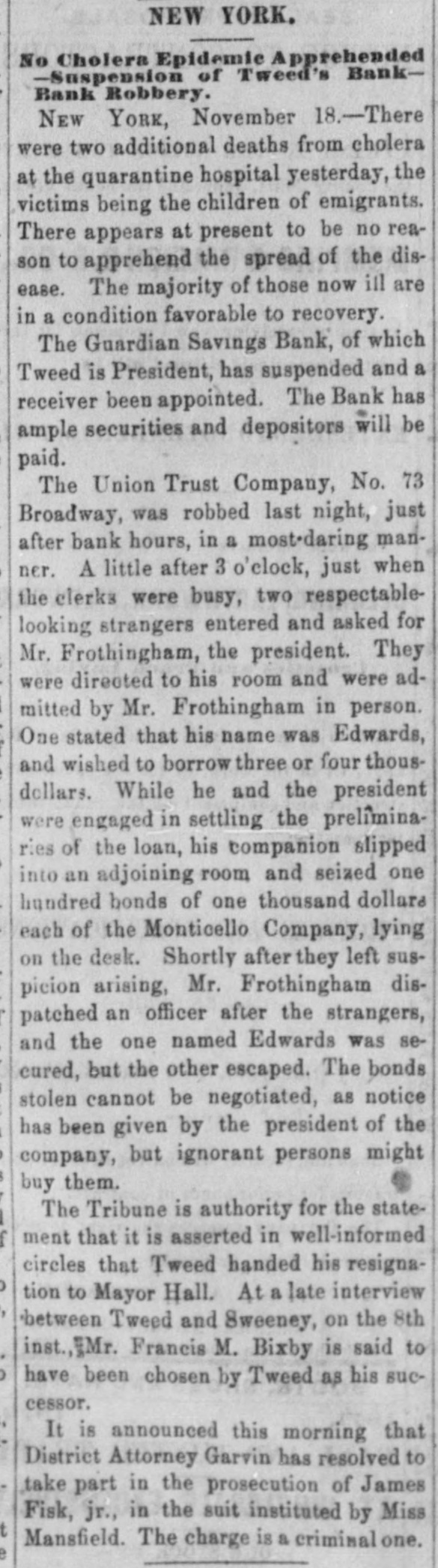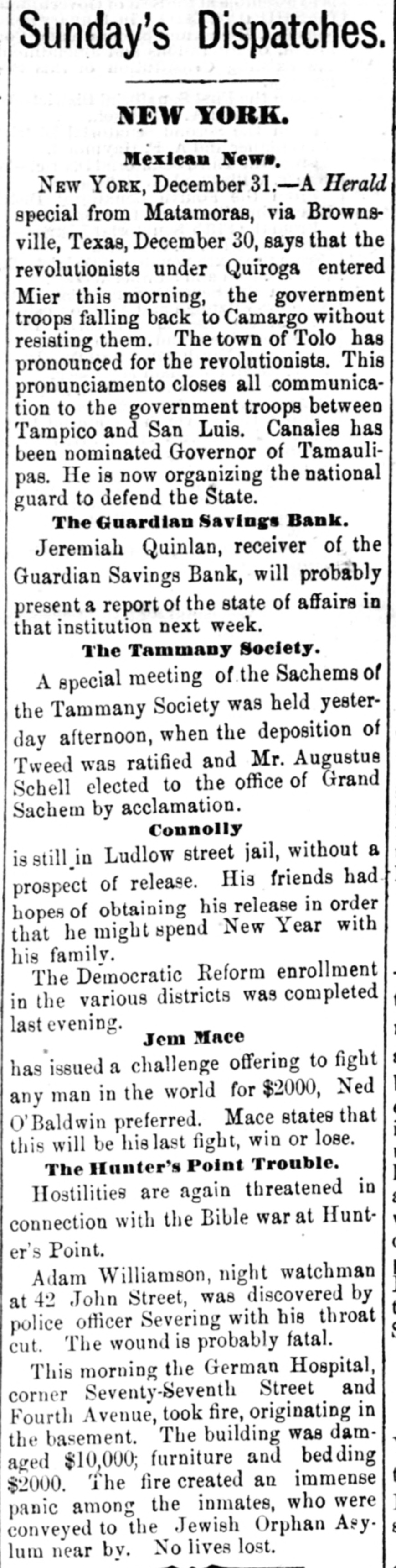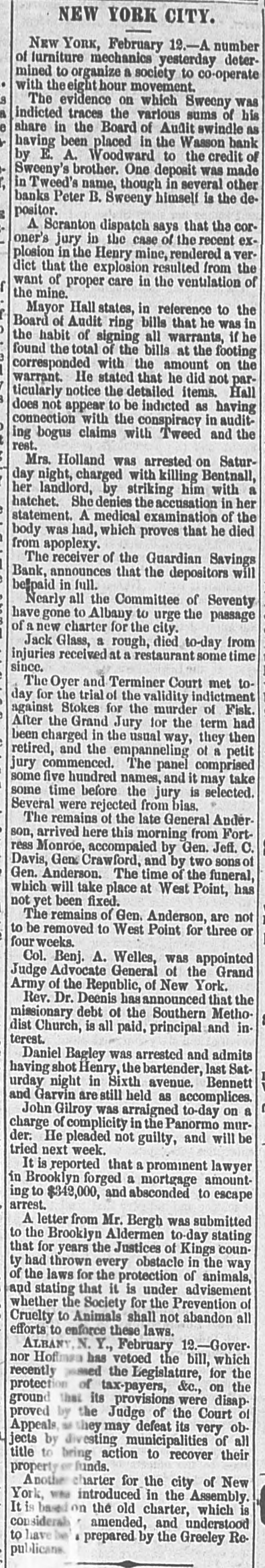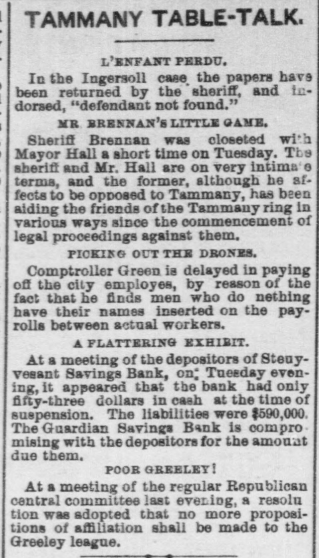 The "Poor Boy of the Mohawk," His Banks and Police-A Captain of Detectives on Guard. THE REPORTS TO THE LEGISLATURE. Reports That Never Lie-Condition of the Manhattan, Guardian, National Savings, Bowling Green, Yorkville and Citizens' Banks. Figures and Facts for the People. Few calamities are fraught with more of truly pittable misery than the failure of a savings bank. Other financial concerns when they topple over usually content themselves with burying in their crumbled heaps of ruins LARGE SLICES OF THE PROPERTY of men whose colossal fortunes can easily with stand a considerable and sudden diminution, and whose means were probably accumulated by the misfortunes of a similar character which had previously overtaken their neighbors; but the closing of a savings bank's doors for the last time shuts out every ray of hope and happiness in this life from the hearts of 80 many poor and worthy fellow creatures who so richly deserve a better fortune that no man with human feelings and sympathies can stand the unmoved witness of such a spectacle. It brings before the mind's eye the exquisite agony of the industrious laborer who for many a long year has toiled in the winter's biting frost and under the blazing summer's sun. in humility and hard. ship and danger, and coined his sweat and blood and flesh into few precious dollars, that might save him from hunger and the aimshouse when his supple joints became stiff and his strong muscles weakened and his hair grew gray after a life of weary SUFFERING AND SELF-DENIAL, and who now suddenly awakes to find that his longcherished dreams-of an old age of comparative comfort and independence have changed into the dread reality of inevitable and hopeless beggary. Then think of the indescribable misery of the poor widow whose humble and untiring Industry with her washboard or her needle has enablea her to save little money, on which she depended to bring up her fatherless boy as a worthy and honest member of society, and to preserve her orphaned daughter from life of shame, and who now finds the fruits of her years of toll and patience and privation all withered and blasted in an hour. Only think of the thousands of cases of wretched. ness and suffering, which no pencil can pain: and no pen enumerate brought about by the collapse or one of those instituti ns which are allowed to exist only because they profess to be peculiarly the guardians and rewarders of the industrious poor. and If there be any sentiment in addition to pity for the victims, it is that no punishment can be too severe for the parties who wilfully abuse or negligently mismanage THE AFFAIRS OF SAVINGS BANK. The great excitement in the city caused by the announcement of the failure of several savings banks and the details thereof published in the HERALD on the two following days had duminished very little yesterday. Even among those who were not depostors the interest in the condition of the suspected banks was very intense, and groups of men who congregated under awnings and porchos for shelter from the falling rain discussed the affairs of the sav. ings banks with the safety and tardy arrival of the Grand Duke Alexis. What every speaker seemed to consider most remarkable was the fact that all THE THREATENED FINANCIAL INSTITUTIONS were connected in some nearer or more remote degree with the old Tammany Ring and acknowledged some one or other of its distinguished members as their managers and directors, and the name of WILLIAM M. TWEED was on every tongue. About two o'clock in the afternoon a large group of soaked and dripping citizens stood under an awning on the corner of Fulton street and Broadway, discussing the financial situa. ation, its causes and effects. "Well," said one gentleman, as he shook the rain from his umbrella, "there's sort of poetical justice in all this. Thousands of poor laborers in the city are ruined by the very men they always fought for and voted for and kept in power." "No, sir, no: that's a mistake," replied poor Irishman, who had just been denied admittance to one of the banks where his little savings were deposited: "that's all mistake, sir. 'Twasn't me that voted for 'em at all. nor tought for 'em, alther. 'Tisn't the poor, hard workin' min, that WORK FOR THEIR LIVIN' and save their little airnings for the childher, that do have anything to do with thim politicians one way or another. We did not put our money in their banks because they were Tammany politicians, but because we saw them looked after and associated with by gintlemin that houlds their heads the highest the city. The papers tould every day that they had plinty of property in all the ratlroads and banks of the country, in company with all the great people of the land, and, sure, we naturally thought they were safe enough to hould our little thrifes for us." "Could it be out of revenge for going back on them at the last election that they have done this thing now ." asked another. "I "Begor, may be so." said the Irishman. wouldn't put past thim.' as "I think, said German, "dey be's not so bad als. I b'leef Tweed has pull all his money out of dem banks and leave nothing any more, so dat he can GET AWAY VERY SOON. How much you lose P1-10 the Irishman. "Two hundhert an' forty-six dollars," answered Pat with sigh. "Ah, lose BIX hoondred dollar," and the German walked away sorrowfully. of It would be hard to estimate the amount wretchedness and misery caused by the failure of those banks: it never will and never can be known All the information that could be gleaned, however, by a sharp squad of reporters is here subjoined. The reporters of the HERALD were yesterday despatched in every direction to secure facts regarding the run upon the banks, and the result of their labors is given, as follows. The Banks of the City and County Hard Earnings Are Secured or Protected. D.C. Howell, Superintendent of the Banking De. partment of the State, resides at Albany, and is supposed to exercise general supervisio