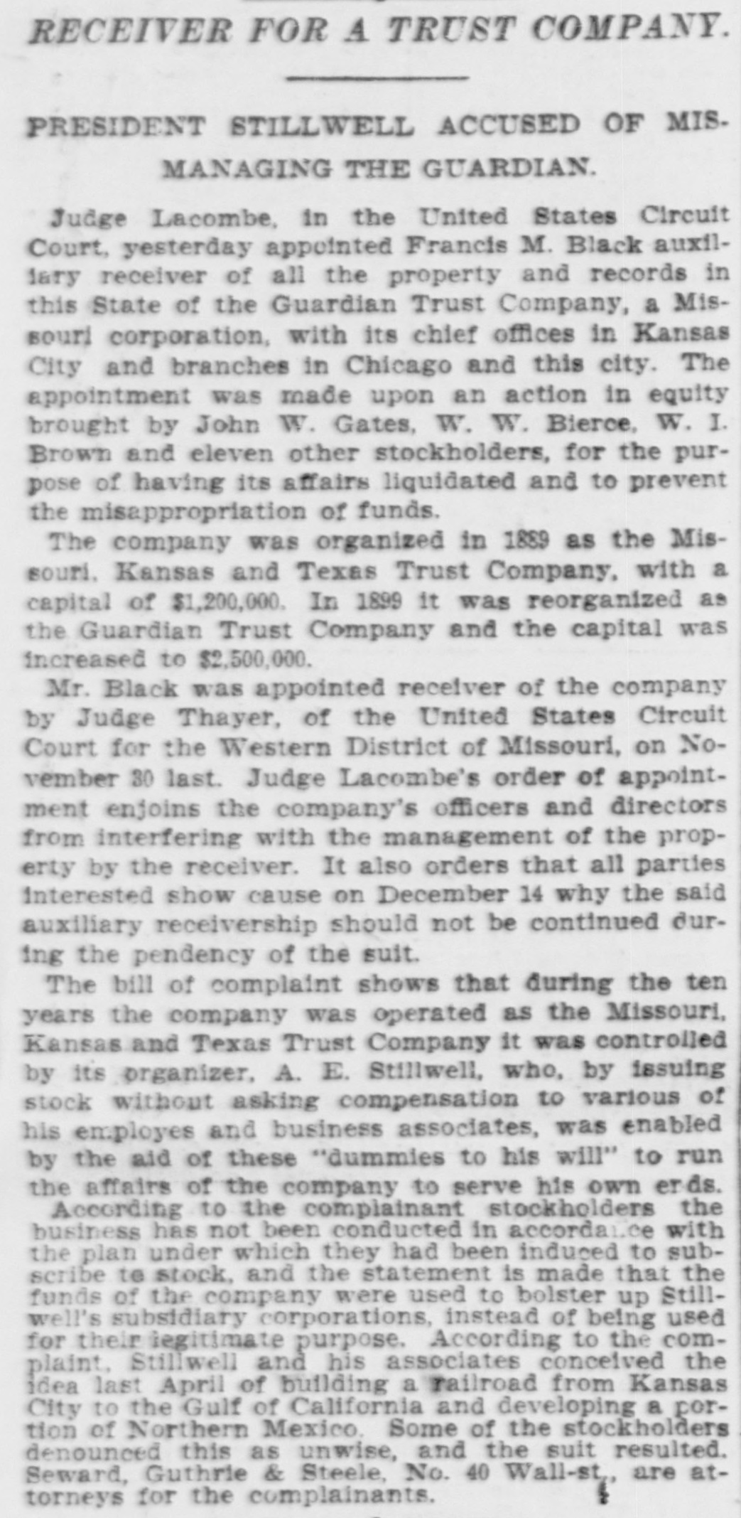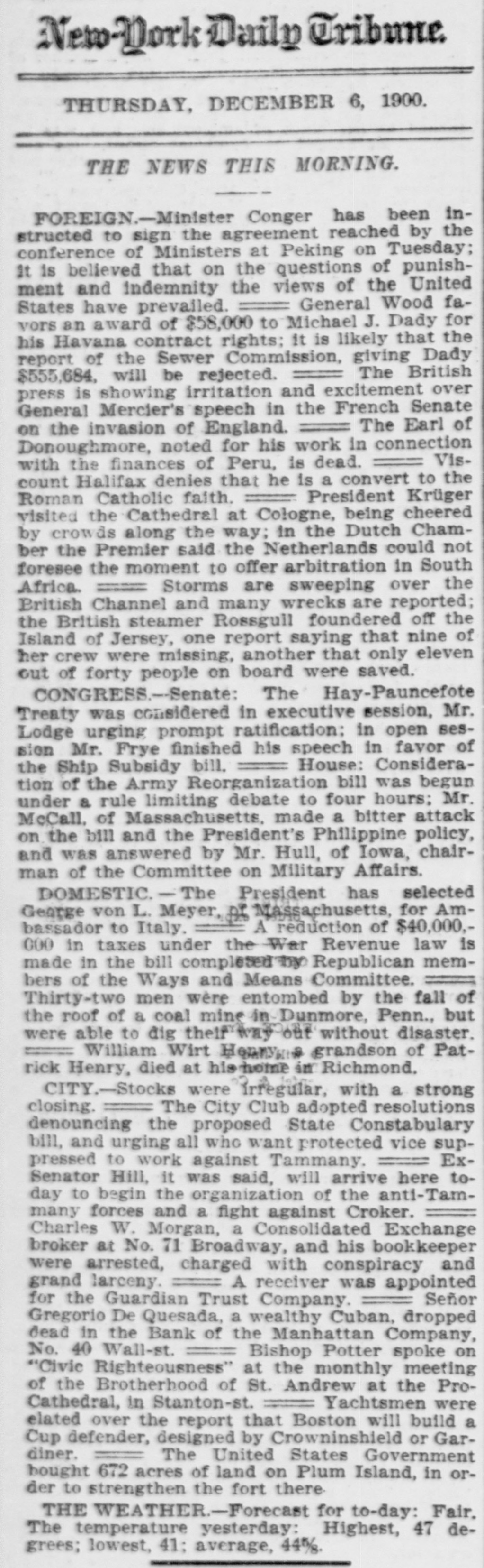 New-York Daily Tribune THURSDAY, DECEMBER 6, 1900. THE NEWS THIS MORNING. FOREIGN.-Minister Conger has been instructed to sign the agreement reached by the conference of Ministers at Peking on Tuesday; It is believed that on the questions of punishment and indemnity the views of the United General Wood faStates have prevailed. vors an award of $58,000 to Michael J. Dady for his Havana contract rights; it is likely that the report of the Sewer Commission, giving Dady The British $555,684. will be rejected. press is showing irritation and excitement over General Mercier's speech in the French Senate The Earl of on the invasion of England. Donoughmore, noted for his work in connection Viswith the finances of Peru, is dead. count Halifax denies that he is a convert to the President Krüger Roman Catholic faith. visited the Cathedral at Cologne, being cheered by crowde along the way; in the Dutch Chamber the Premier said the Netherlands could not foresee the moment to offer arbitration in South Storms are sweeping over the Africa. British Channel and many wrecks are reported; the British steamer Rossgull foundered off the Island of Jersey, one report saying that nine of her crew were missing, another that only eleven out of forty people on board were saved. CONGRESS.--Senate: The Hay-Pauncefote Treaty was considered in executive session, Mr. Lodge urging prompt ratification: in open session Mr. Frye finished his speech in favor of House: Considerathe Ship Subsidy bill. tion of the Army Reorganization bill was begun under a rule limiting debate to four hours; Mr. McCall. of Massachusetts, made a bitter attack on the bill and the President's Philippine policy, and was answered by Mr. Hull, of Iowa, chairman of the Committee on Military Affairs. DOMESTIC. - The President has selected George von L. Meyer, of Massachusetts, for AmA reduction of $40,000,bassador to Italy. 000 in taxes under the War Revenue law is made in the bill completed the Republican members of the Ways and Means Committee. Thirty-two men were entombed by the fall of the roof of a coal mine in Dunmore, Penn., but were able to dig their way out without disaster. William Wirt Henny grandson of Patrick Henry, died at his home in Richmond. CITY.-Stocks were irregular, with a strong closing. The City Club adopted resolutions denouncing the proposed State Constabulary bill, and urging all who want protected vice supExpressed to work against Tammany. Senator Hill, it was said, will arrive here today to begin the organization of the anti-Tammany forces and a fight against Croker. Charles W. Morgan, a Consolidated Exchange broker at No. 71 Broadway, and his bookkeeper were arrested, charged with conspiracy and grand larceny. A receiver was appointed Señor for the Guardian Trust Company. Gregorio De Quesada, a wealthy Cuban, dropped dead in the Bank of the Manhattan Company, No. 40 Wall-st. Bishop Potter spoke on "Civic Righteousness" at the monthly meeting of the Brotherhood of St. Andrew at the ProCathedral, in Stanton-st. Yachtsmen were elated over the report that Boston will build a Cup defender, designed by Crowninshield or Gardiner. The United States Government bought 672 acres of land on Plum Island, in order to strengthen the fort there THE WEATHER.-Forecast for to-day: Fair. The temperature yesterday: Highest, 47 degrees; lowest, 41: average, 44%