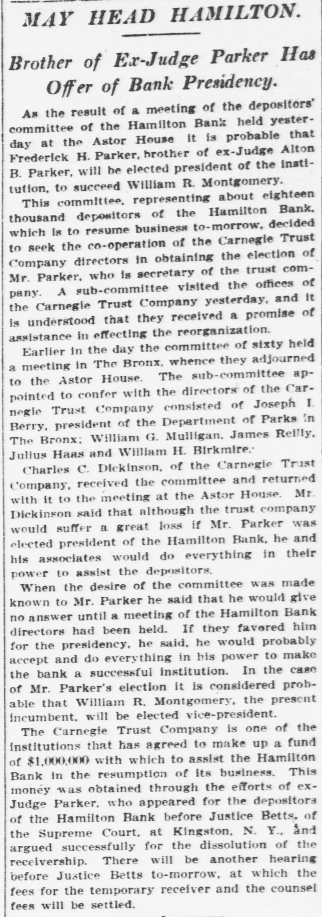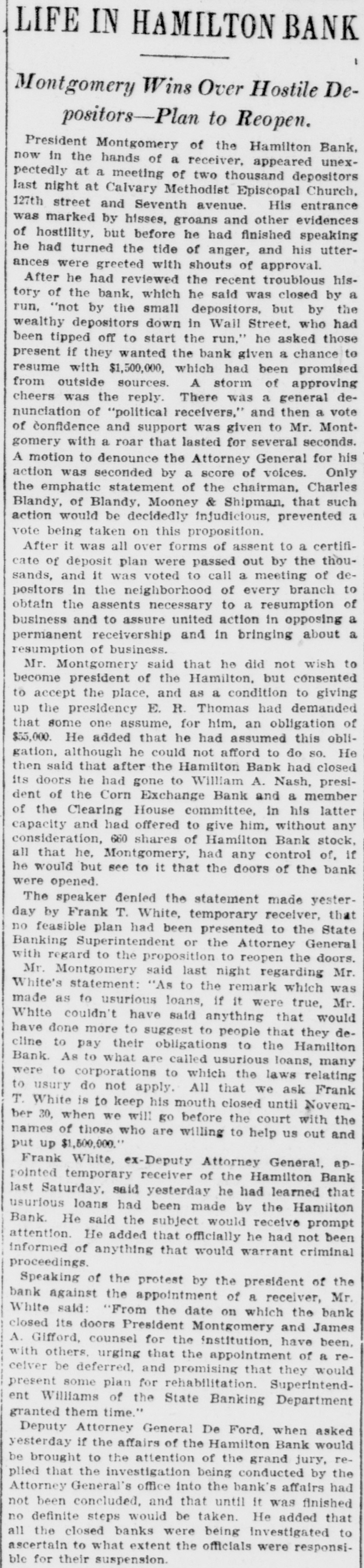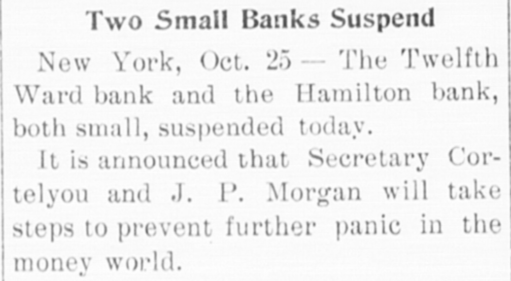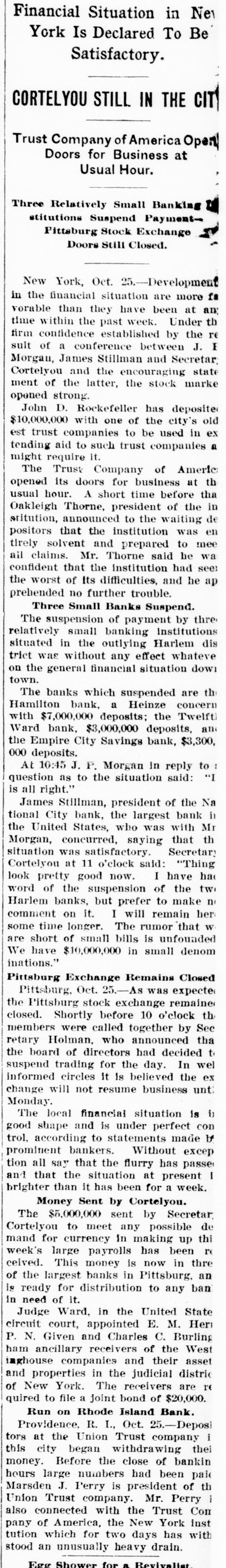 Financial Situation in Nev York Is Declared To Be Satisfactory. CORTELYOU STILL IN THE CIT Trust Company of America Open Doors for Business at Usual Hour. Three Relatively Small Banking stitutions Suspend PaymentPittsburg Stock Exchange Doors Still Closed. New York, Oct. 25.-Development the financial situation are more fa than they have the past week. in vorable time within been Under at an th firm confidence established by the re I sult of a conference between J. James Stillman and Secretar: and the Morgan, Cortelyou encouraging marke state ment of the latter, the stock opened strong. John D. Rockefeller has deposited $10,000,000 with one of the city's old to ex est trust companies be companies used in a tending aid to such trust might require it. The Trust Company of America its doors for business at th A short time president usual opened Oakleigh hour. Thorne, before of the tha in announced to the that the positors stitution, institution waiting was to mee en de solvent and prepared Mr. Thorne that the confident ail tirely claims. institution said had he see wa the worst of Its difficulties, and he ap prehended no further trouble. Three Small Banks Suspend. of small banking relatively The suspension payment Institutions by thre dis in the outlying Harlem without any effect trict situated was whateve down on the general financial situation town. The banks which suspended are th Hamilton bank, a Heinze concern deposits; $3,000,000 with Ward $7,000,000 bank, deposits, the Twelft an the Empire City Savings bank, $3,300, 000 deposits. : At 10:45 J. P. Morgan in reply to "I question as to the situation said: is all right." Stillman, president of the Na bank, the largest tional James City with bank Mr in United States, who was concurred, saying was satisfactory. situation the Morgan, Secretary that "Thing th Cortelyou at 11 o'clock said: look pretty good now. I have ha word of the suspension of the tw Harlem banks, but prefer to make n comment on it. I will remain her some time longer. The rumor that W are short of small bills is unfounded We have $10,000,000 in small denom inations." Pittsburg Exchange Remains Closed Oct. 25.-As was the stock exchange Pittsburg, Pittsburg o'clock remained expected th closed. Shortly before 10 were called who retary members Holman, together announced decided by Sec tha of directors had to for the the suspend board trading believed day. In the wel informed circles It Is ex change will not resume business unt: Monday. The local financial situation is is and is under to if good trol, according shape statements perfect made con bankers. that the tion prominent all say flurry Without has present passe excep I and that the situation at brighter than it has been for a week. Money Sent by Cortelyou. sent by to meet any Cortelyou The $5,000,000 possible Secretar, thi de for currency in making up payrolls This money is now mand week's ceived. large has been in thre an re of the largest banks in Pittsburg, is ready for distribution to any ban in need of it. in the United State appointed circuit Judge court, Ward, E. M. Her and Charles C. Burling receivers inghouse ham P. N. ancillary Given companies and of their the asset West and in the distric The are I' of New properties York. receivers judicial of $20,000. quired to file a joint bond Run on Rhode Island Bank. Providence, R. I., Oct. 25.-Deposi the Union Trust i this thei tors at city began withdrawing company bankin Before the close of numbers paid J. is th money. hours Marsden large Perry president had been of Union Trust company. Mr. Perry i also connected with the Trust Com pany of America, the New York inst tution which for two days has with stood an unusually heavy drain. Egg Shower for a Revivalist