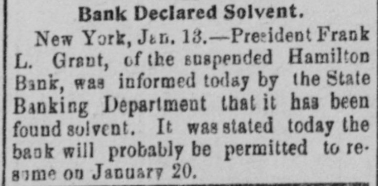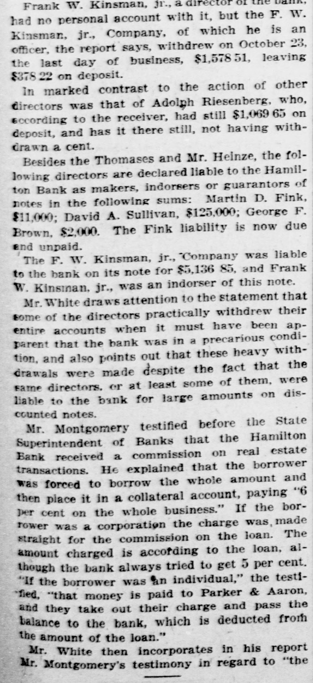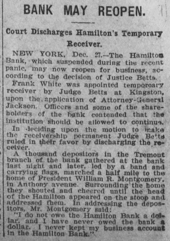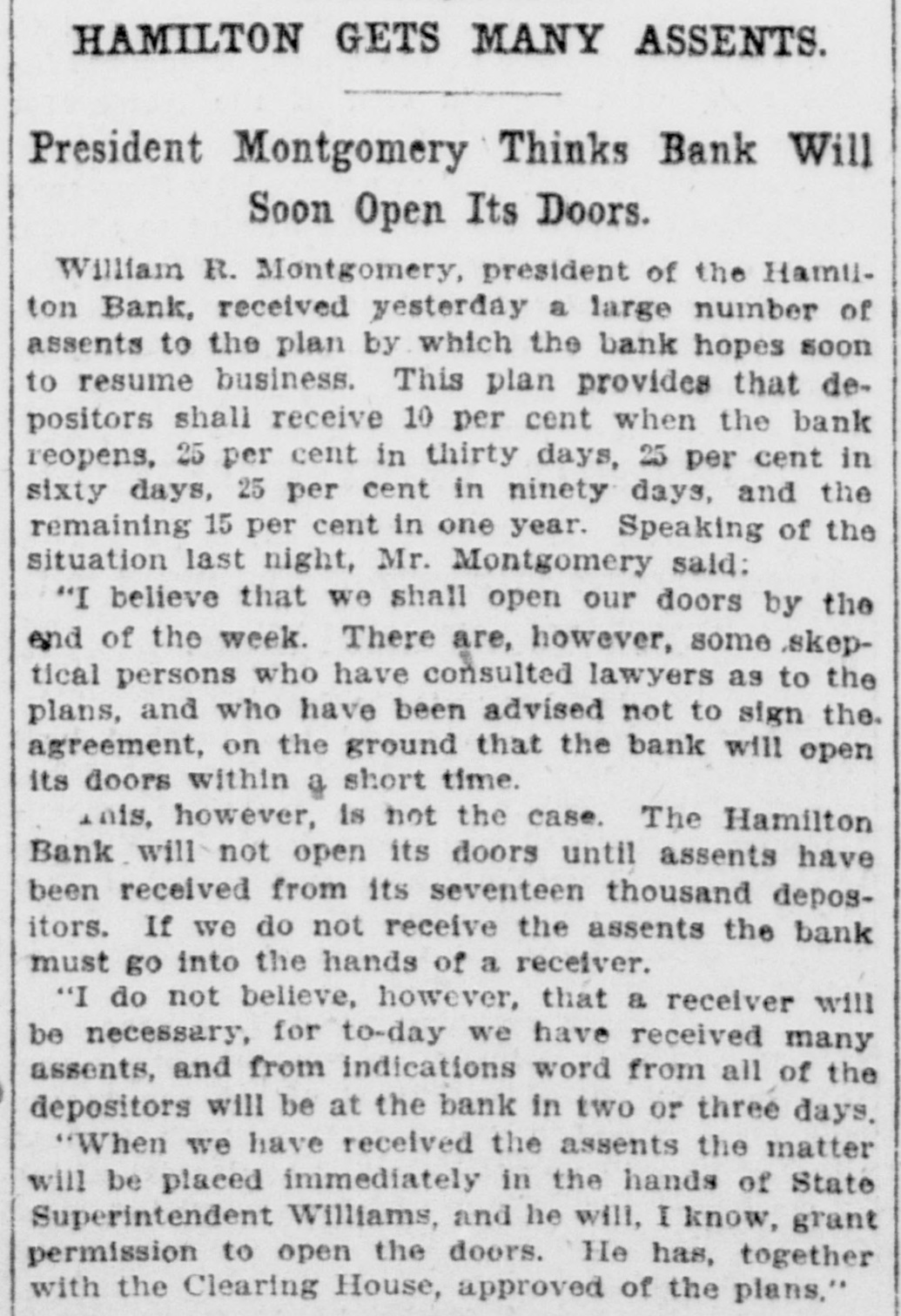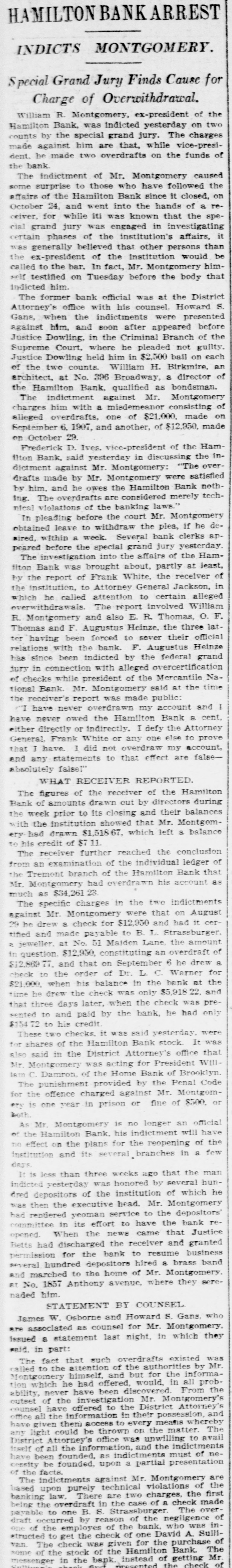 Financial Situation in Nev York Is Declared To Be Satisfactory. CORTELYOU STILL IN THE CIT Trust Company of America Open Doors for Business at Usual Hour. Three Relatively Small Banking stitutions Suspend PaymentPittsburg Stock Exchange Doors Still Closed. New York, Oct. 25.-Development the financial situation are more fa than they have the past week. in vorable time within been Under at an th firm confidence established by the re I sult of a conference between J. James Stillman and Secretar: and the Morgan, Cortelyou encouraging marke state ment of the latter, the stock opened strong. John D. Rockefeller has deposited $10,000,000 with one of the city's old to ex est trust companies be companies used in a tending aid to such trust might require it. The Trust Company of America its doors for business at th A short time president usual opened Oakleigh hour. Thorne, before of the tha in announced to the that the positors stitution, institution waiting was to mee en de solvent and prepared Mr. Thorne that the confident ail tirely claims. institution said had he see wa the worst of Its difficulties, and he ap prehended no further trouble. Three Small Banks Suspend. of small banking relatively The suspension payment Institutions by thre dis in the outlying Harlem without any effect trict situated was whateve down on the general financial situation town. The banks which suspended are th Hamilton bank, a Heinze concern deposits; $3,000,000 with Ward $7,000,000 bank, deposits, the Twelft an the Empire City Savings bank, $3,300, 000 deposits. : At 10:45 J. P. Morgan in reply to "I question as to the situation said: is all right." Stillman, president of the Na bank, the largest tional James City with bank Mr in United States, who was concurred, saying was satisfactory. situation the Morgan, Secretary that "Thing th Cortelyou at 11 o'clock said: look pretty good now. I have ha word of the suspension of the tw Harlem banks, but prefer to make n comment on it. I will remain her some time longer. The rumor that W are short of small bills is unfounded We have $10,000,000 in small denom inations." Pittsburg Exchange Remains Closed Oct. 25.-As was the stock exchange Pittsburg, Pittsburg o'clock remained expected th closed. Shortly before 10 were called who retary members Holman, together announced decided by Sec tha of directors had to for the the suspend board trading believed day. In the wel informed circles It Is ex change will not resume business unt: Monday. The local financial situation is is and is under to if good trol, according shape statements perfect made con bankers. that the tion prominent all say flurry Without has present passe excep I and that the situation at brighter than it has been for a week. Money Sent by Cortelyou. sent by to meet any Cortelyou The $5,000,000 possible Secretar, thi de for currency in making up payrolls This money is now mand week's ceived. large has been in thre an re of the largest banks in Pittsburg, is ready for distribution to any ban in need of it. in the United State appointed circuit Judge court, Ward, E. M. Her and Charles C. Burling receivers inghouse ham P. N. ancillary Given companies and of their the asset West and in the distric The are I' of New properties York. receivers judicial of $20,000. quired to file a joint bond Run on Rhode Island Bank. Providence, R. I., Oct. 25.-Deposi the Union Trust i this thei tors at city began withdrawing company bankin Before the close of numbers paid J. is th money. hours Marsden large Perry president had been of Union Trust company. Mr. Perry i also connected with the Trust Com pany of America, the New York inst tution which for two days has with stood an unusually heavy drain. Egg Shower for a Revivalist