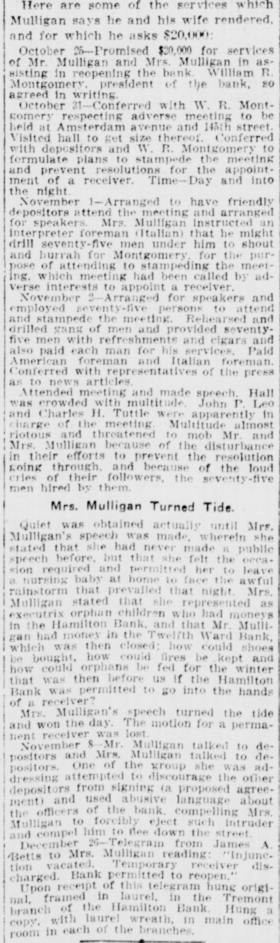 Here are some of the services which Mulligan says he and his wife rendered, and for which he asks $20,000: October 25--Promised $20,000 for services of Mr. Mulligan and Mrs. Mulligan in assisting in reopening the bank William R. Montgomery. president of the bank, so agreed in writing. October 31-Conferred with W. R. Montgomery respecting adverse meeting to be held at Amsterdam avenue and 145th street. Visited hall to get size thereof. Conferred with depositors and W. R. Montgomery to formulate plans to stampede the meeting and prevent resolutions for the appointment of a receiver. Time-Day and into the night. November 1-Arranged to have friendly depositors attend the meeting and arranged for speakers. Mrs. Mulligan instructed an interpreter foreman (Italian) that he might drill seventy-five men under him to shout and hurrah for Montgomery for the purpose of attending to stampeding the meeting. which meeting had been called by adverse interests to appoint a receiver. November 2-Arranged for speakers and employed seventy-five persons to attend and stampede the meeting. Rehearsed and drilled gang of men and provided seventyfive men with refreshments and elgars and also paid each man for his services. Paid American foreman and Italian foreman. Conferred with representatives of the press as to news articles. Attended meeting and made speech. Hall was crowded with multitude John P. Leo and Charles H. Tuttle were apparently in charge of the meeting Multitude almost riotous and threatened to mob Mr. and Mrs. Mulligan because of the disturbance in their efforts to prevent the resolution going through and because of the loud cries of their followers, the seventy-five men hired by them. Mrs. Mulligan Turned Tide. Quiet was obtained actually until Mrs. Mulligan's speech was made. wherein she stated that she had never made a public speech before, but that she felt the occa. sion required and permitted her to leave a nursing baby at home to face the awful rainstorm that prevailed that night Mrs. Mulligan stated that she represented as executrix orphan children who had moneys in the Hamilton Bank, and that Mr. Mulligan had money in the Twelfth Ward Bank, which was then closed: how could shoes be bought, how could fires be kept and how could orphans be fed for the winter that was then before us if the Hamilton Bank was permitted to go into the hands of a receiver? Mrs. Mulligan's speech turned the tide and won the day. The motion for a permanent receiver was lost. November 8-Mr. Mulligan talked to depositors and Mrs. Mulligan talked to depositors. One of the group she was addressing attempted to discourage the other agreeand depositors ment) the officers from used of the signing abusive bank (a compelling language proposed about Mrs. Mulligan to forcibly eject such intruder and compel him to flee down the street. December 26-Telegram from James A. Betts to Mrs. Mulligan reading: "Injunetion vacated. Temporary receiver discharged. Bank permitted to reopen.' Upon receipt of this telegram hung original, framed in laurel, in the Tremont branch of the Hamilton Bank Hung a copy. with laurel wreath, in main office room in each of the branches.