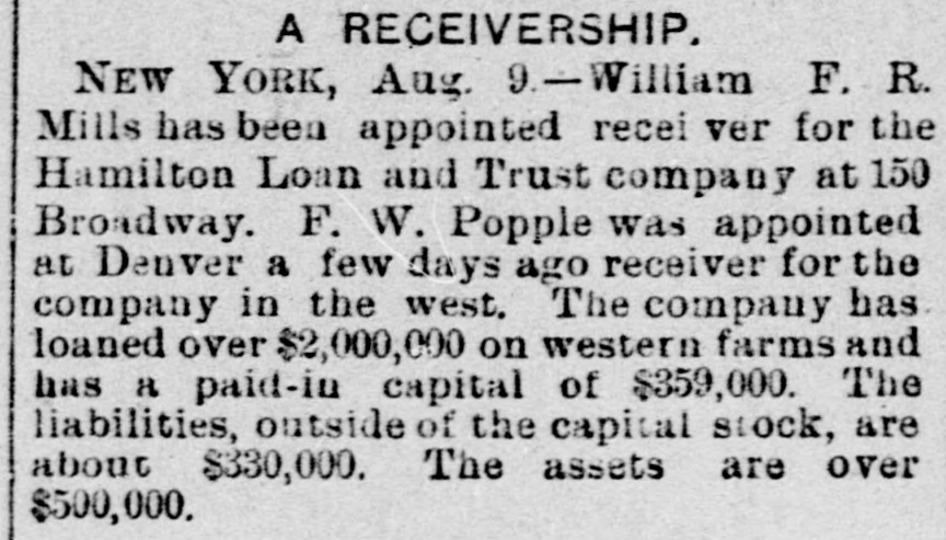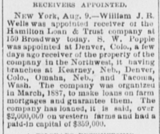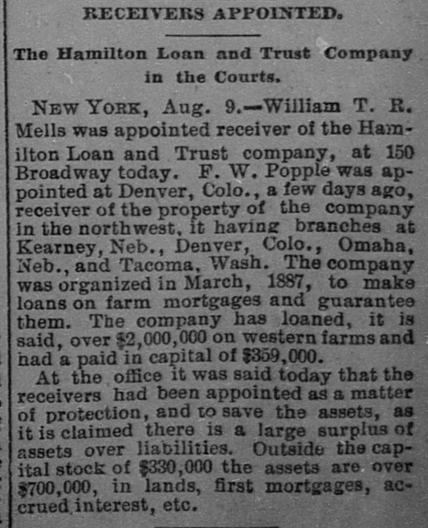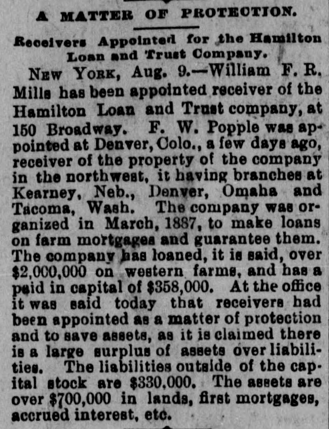 RECEIVERS APPOINTED. The Hamilton Loan and Trust Company in the Courts. NEW YORK, Aug. 9.-William T. R. Mells was appointed receiver of the Hamilton Loan and Trust company, at 150 Broadway today. F. W. Popple was appointed at Denver, Colo., a few days ago, receiver of the property of the company in the northwest, it having branches at Kearney, Neb., Denver, Colo., Omaha, Neb., and Tacoma, Wash. The company was organized in March, 1887, to make loans on farm mortgages and guarantee them. The company has loaned, it is said, over $2,000,000 on western farms and had a paid in capital of $359,000. At the office it was said today that the receivers had been appointed as a matter of protection, and to save the assets, as it is claimed there is a large surplus of assets over liabilities. Outside the capital stock of $330,000 the assets are over $700,000, in lands, first mortgages, accrued interest, etc.