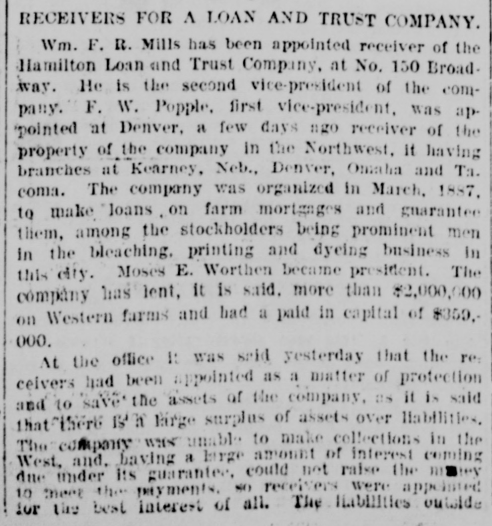 RECEIVERS FOR A LOAN AND TRUST COMPANY. Wm. F. R. Mills has been appointed receiver of the Hamilton Loan and Trust Company, at No. 150 Broadway. He is the second vice-president of the company. F. W. Popple, first vice-president, was appointed at Denver, a few days ago receiver of the property of the company in the Northwest, It having branches at Kearney, Neb., Denver, Omaha and Ta. coma. The company was organized in March, 1887, to make loans on farm mortgages and guarantee them, among the stockholders being prominent men in the bleaching, printing and dyeing business in this city. Moses E. Worthen became president. The company has lent, it is said. more than $2,000,000 on Western farms and had a paid in capital of $359,000. At the office It was said yesterday that the re: ceivers had been appointed as a matter of protection and to save the assets of the company, as it is said that there IV a Eirge surplus of assets over Habilities. The company WHS unable to make collections in the West, and, having a large amount of interest coming due under its guarantee, could not raise the maney 10 meet the payments. NO receivers were appelmed for the best interest of all. The Habilities outside